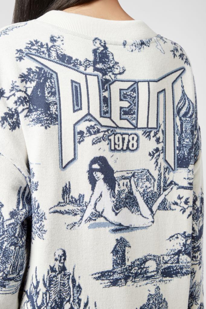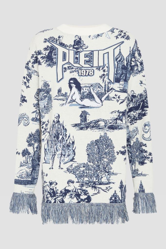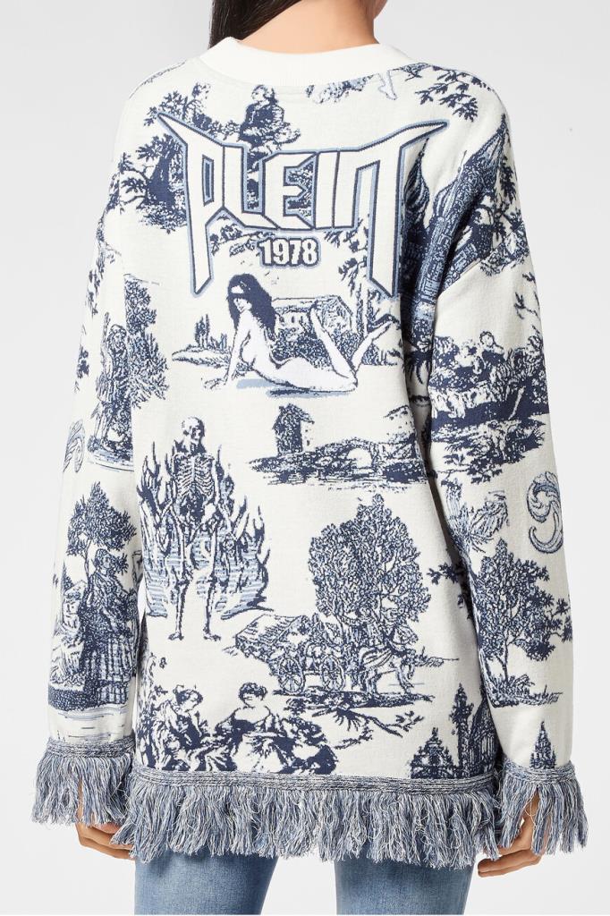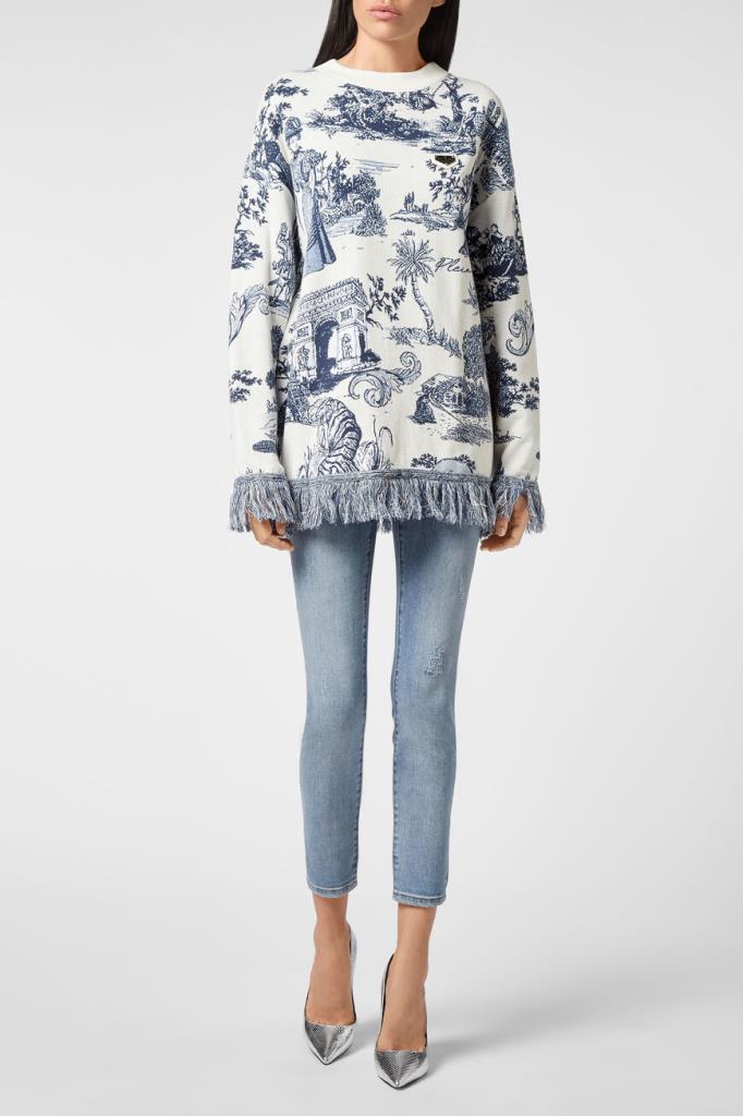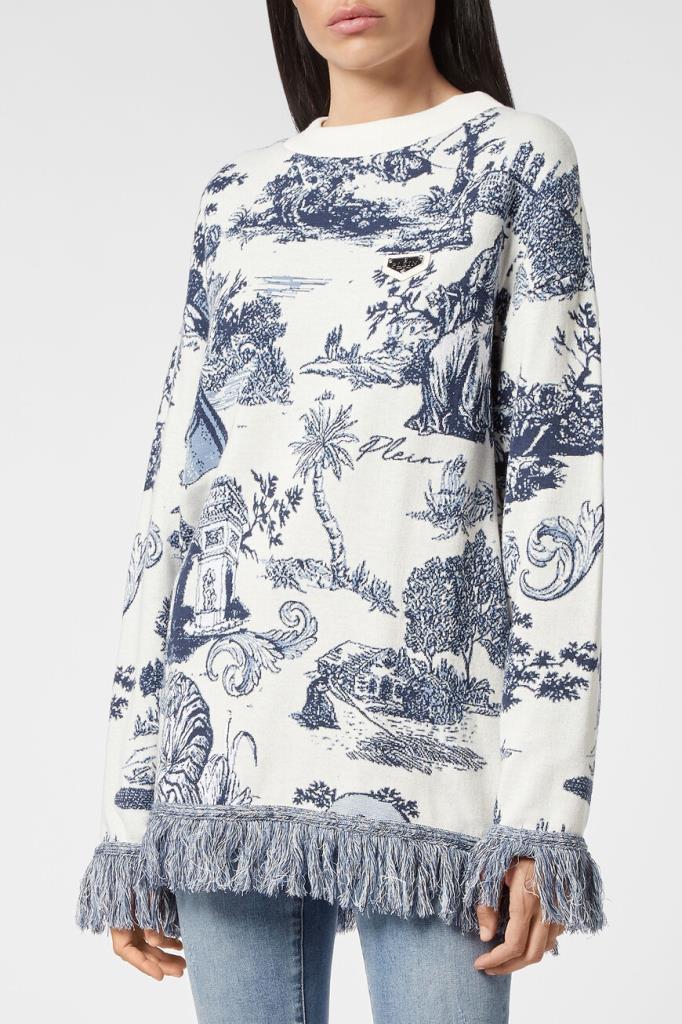 Роскошный женский пуловер Philipp Plein из мягкого трикотажа на основе хлопка и полиакрила белого цвета с эффектным контрастным фирменным жаккардовым узором En PLEIN air насыщенного голубого оттенка по всей поверхности изделия. Оригинальная модель комфортного прямого кроя, с круглым вырезом горловины с фактурой в рубчик и длинными рукавами. Слева на груди красуется стильная кожаная нашивка с металлической эмблемой с фирменным лого бренда. Фишка изделия: манжеты на рукавах и манжета снизу украшены длинной бахромой по краю.