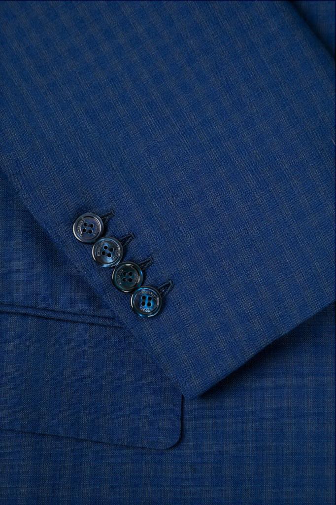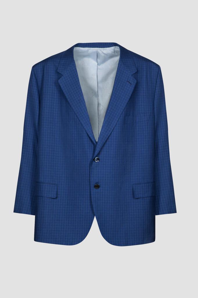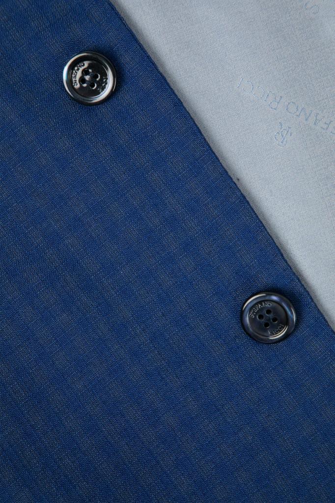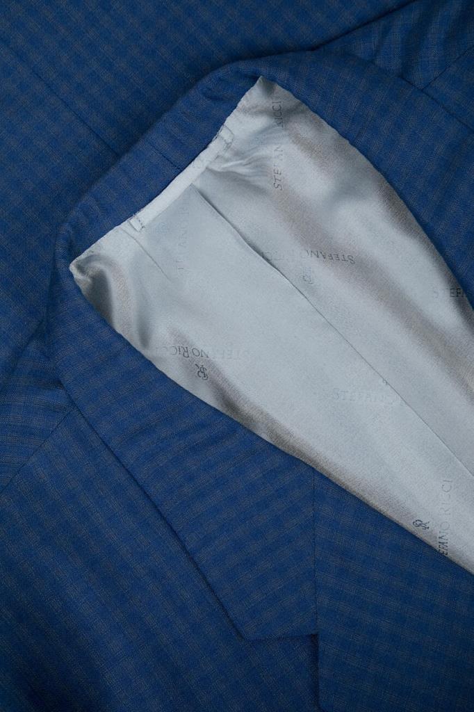 Роскошный мужской пиджак Stefano Ricci из мягкого трикотажа на основе фирменного кашемира и гладкого шёлка универсального синего цвета с оригинальным едва заметным узором в клетку по всей поверхности изделия. Приталенная однобортная модель с прямоугольными лацканами, изящным V-образным вырезом горловины, длинными рукавами, двумя прорезными карманами с клапанами по бокам, нагрудным прорезным карманом слева и потайным внутренним прорезным карманом. Изделие дополнено контрастной подкладкой с фирменным повторяющимся логотипом бренда.
