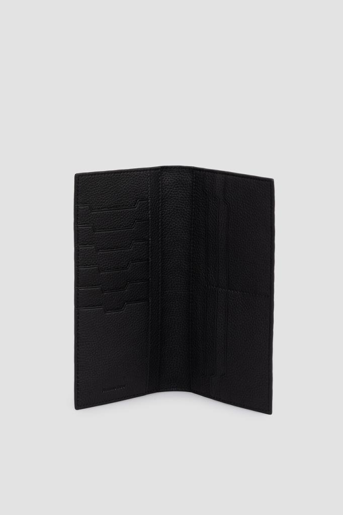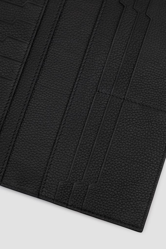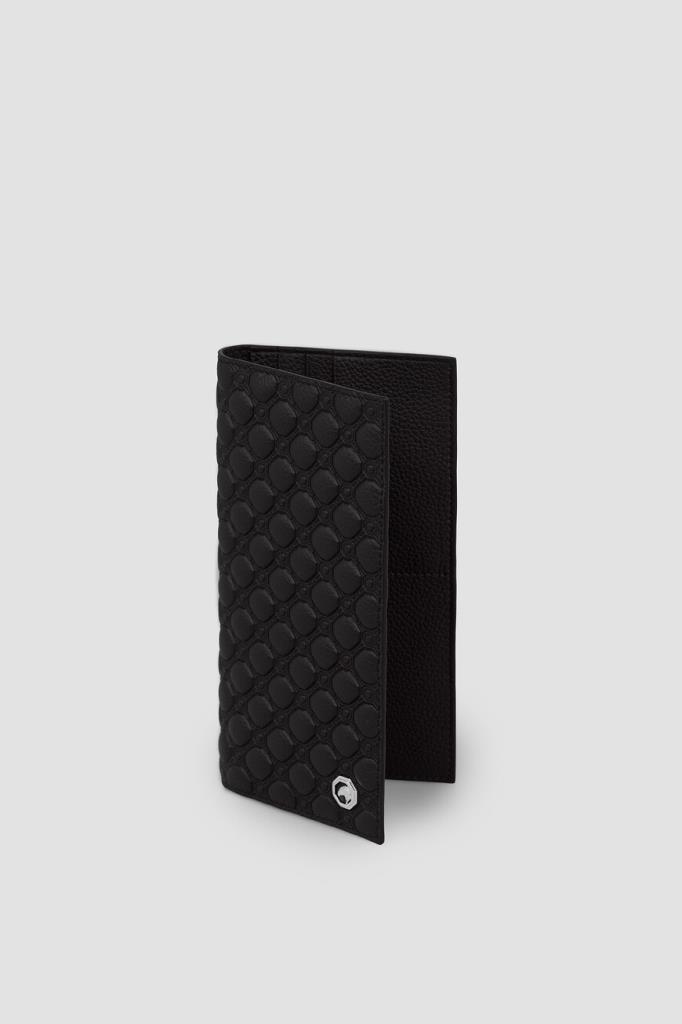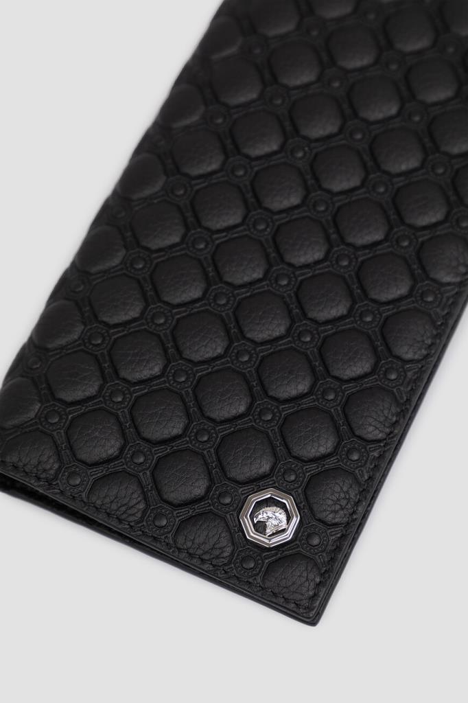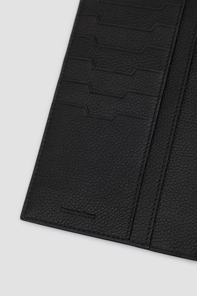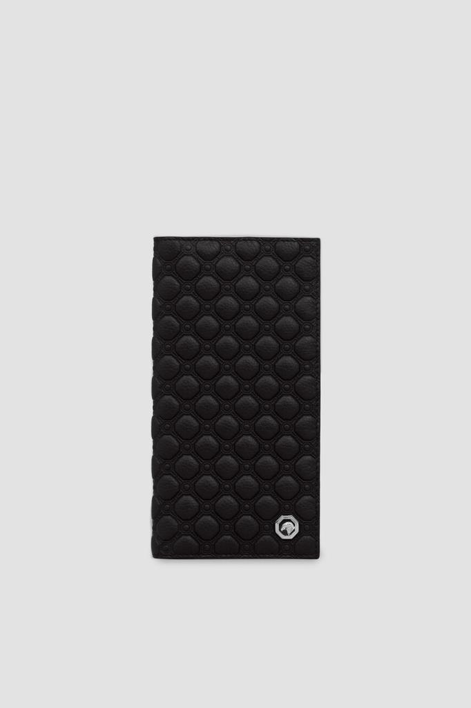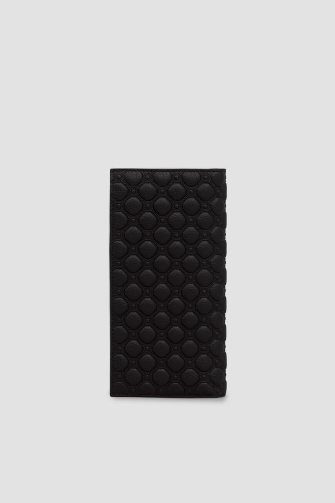 Кожаный кошелёк Stefano Ricci с фактурным геометрическим узором. Практичная модель оптимального размера выполнена в чёрном цвете без застёжки. Атрибутами бренда стали минималистичный лого-восьмигранник с головой орла в центре на лицевой стенке и тиснёный логотип во внутренней части с зернистой текстурой.