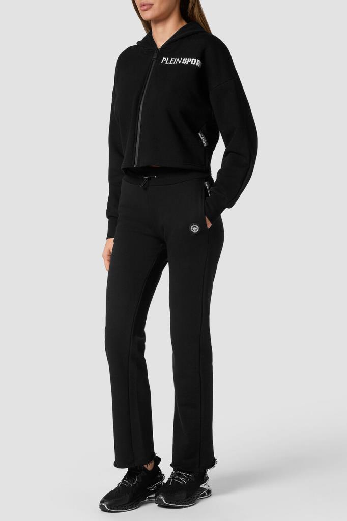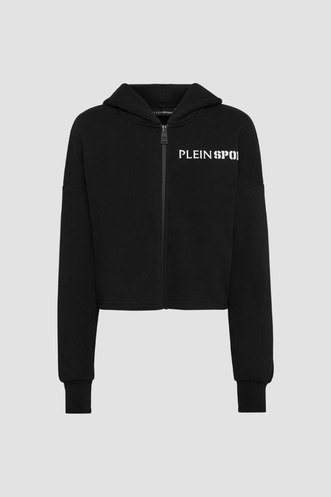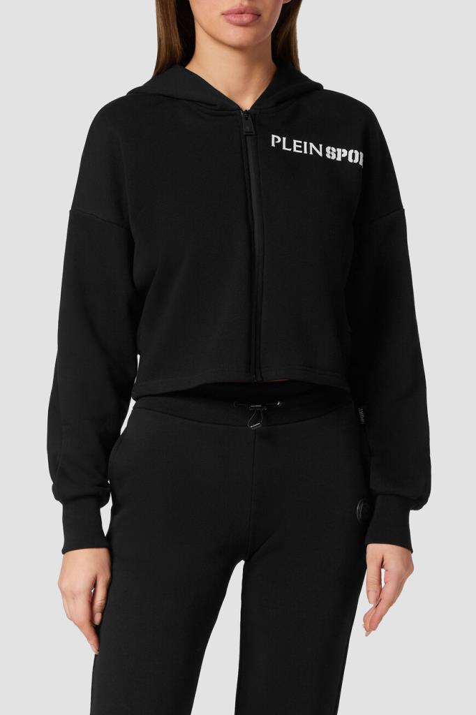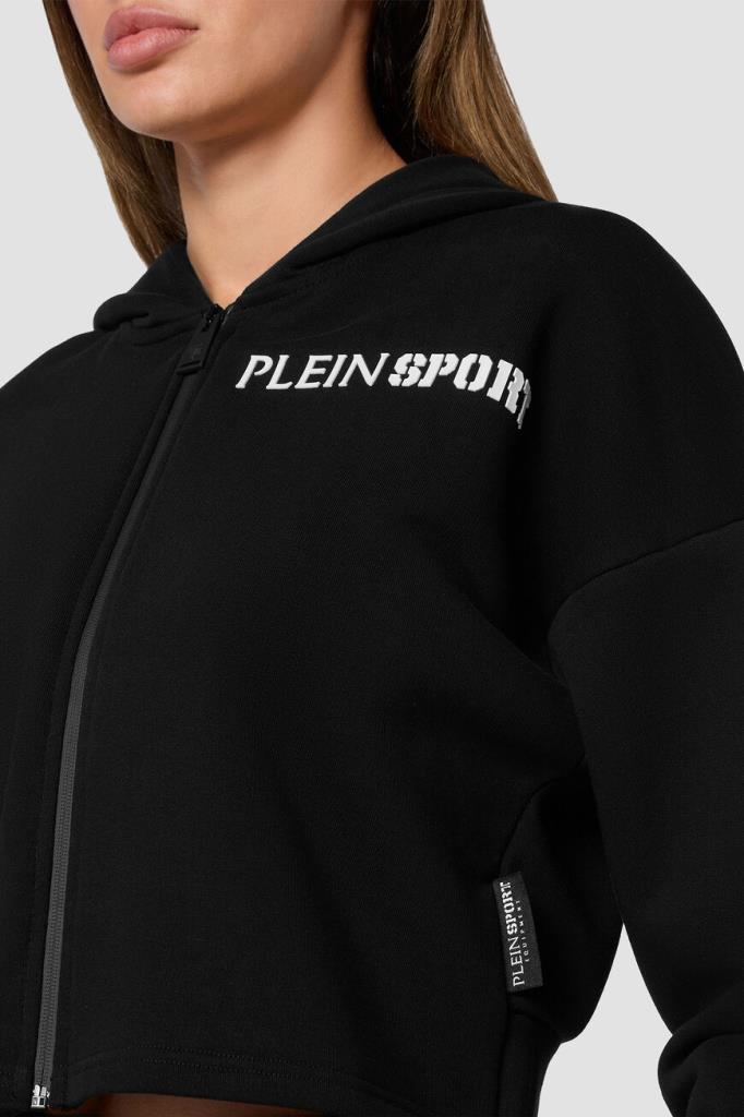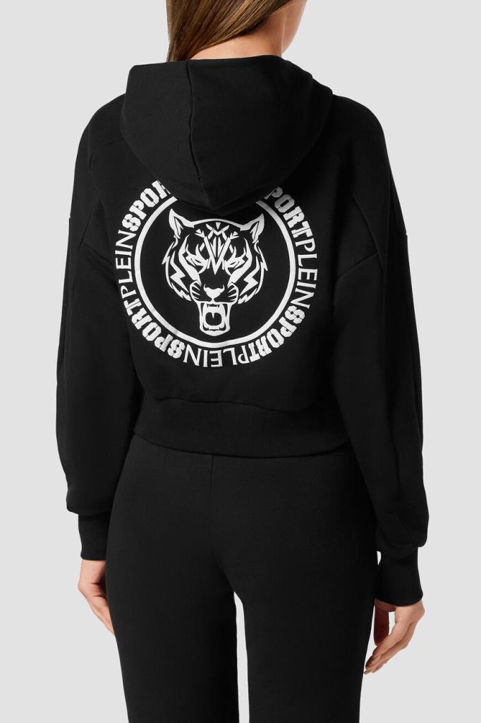 Короткая толстовка PLEIN Sport на молнии с брендированным бегунком. Изделие выполнено из мягкого трикотажа на основе хлопка и прочного полиэфира чёрного цвета. Спереди на груди расположен крупный контрастный логотип, а спинку украшает белый принт с культовой символикой Дома - повторяющимся лого и головой тигра в круге.