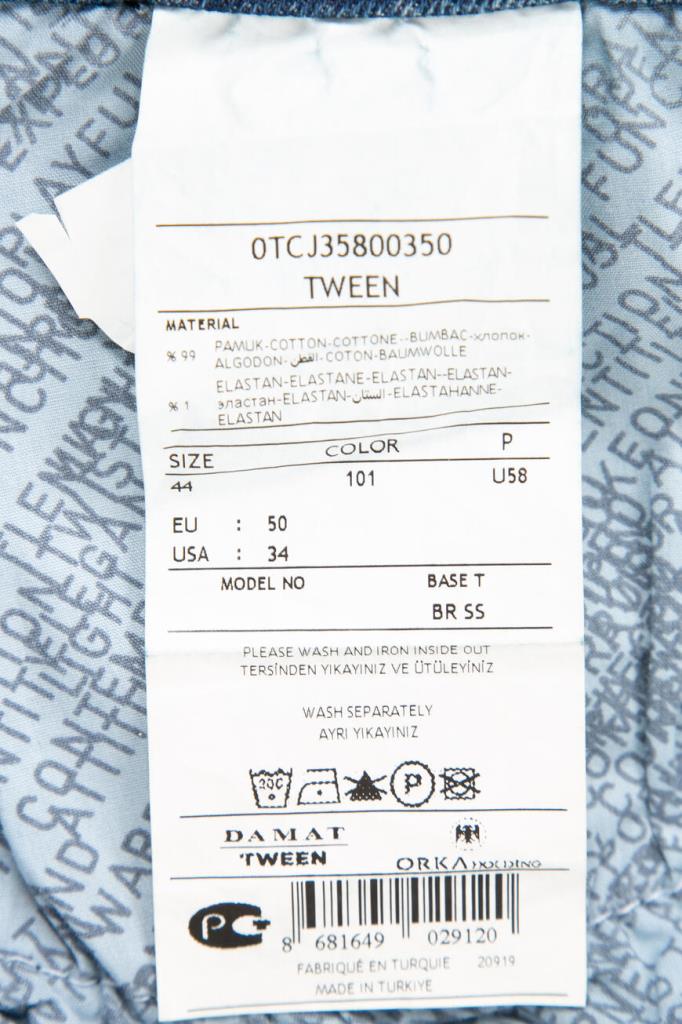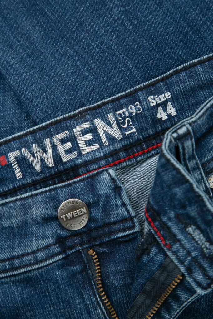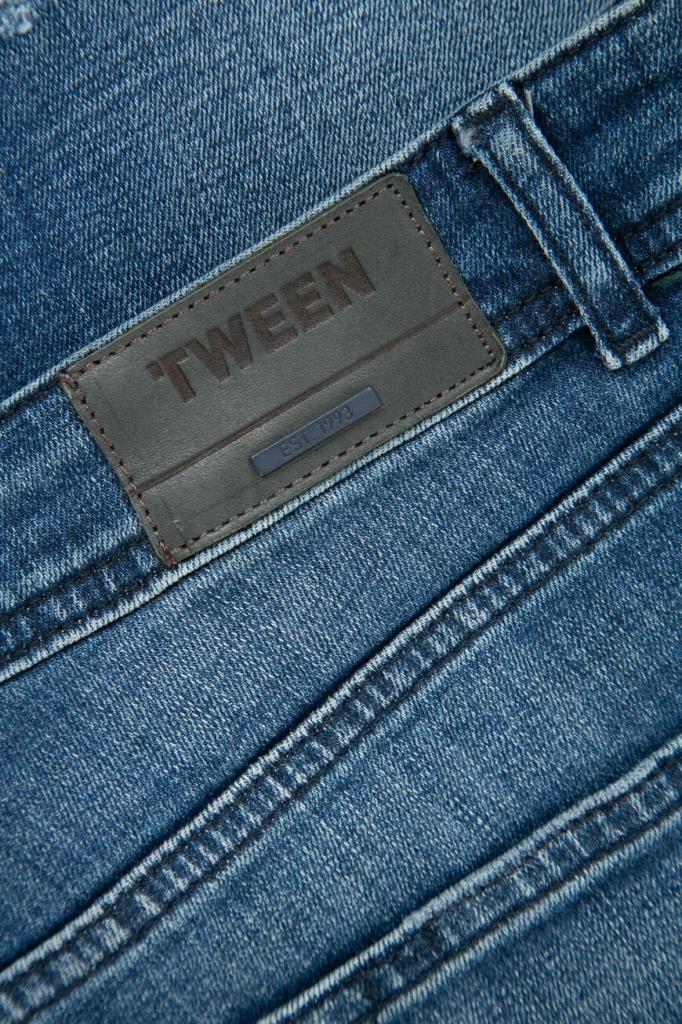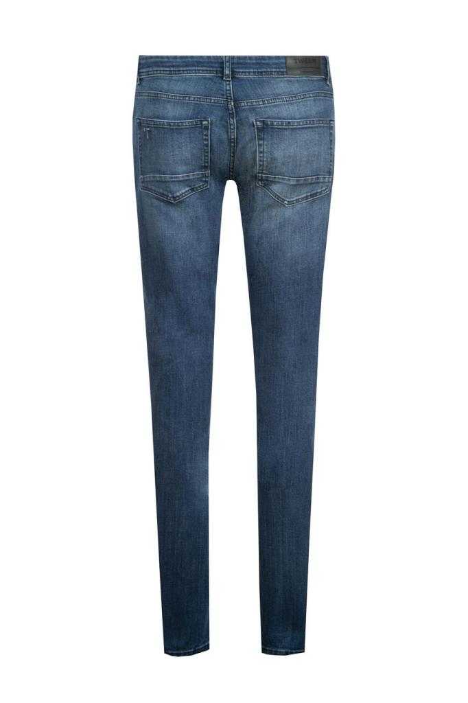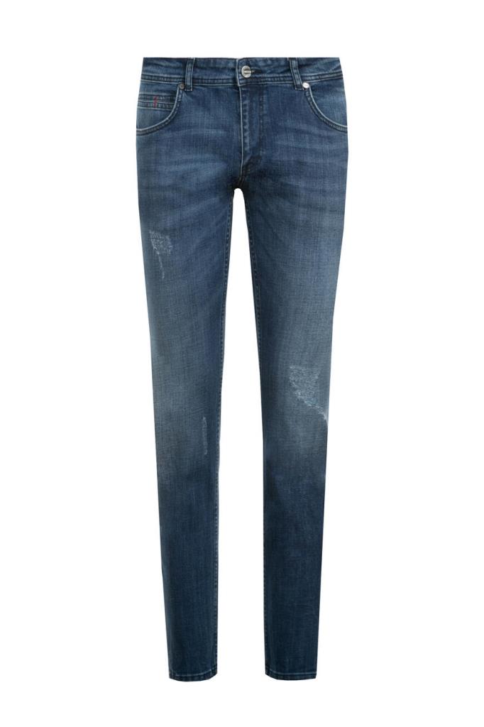 Мужские джинсы TWEEN из мягкого эластичного хлопкового денима синего цвета с эффектными дизайнерскими потёртостями и разрывами.