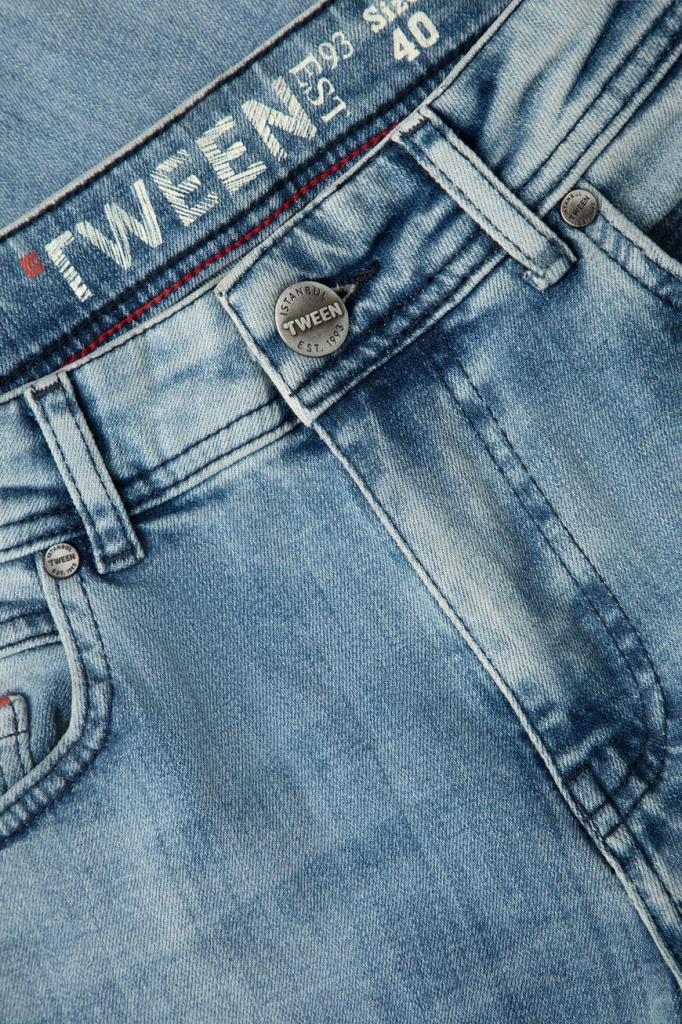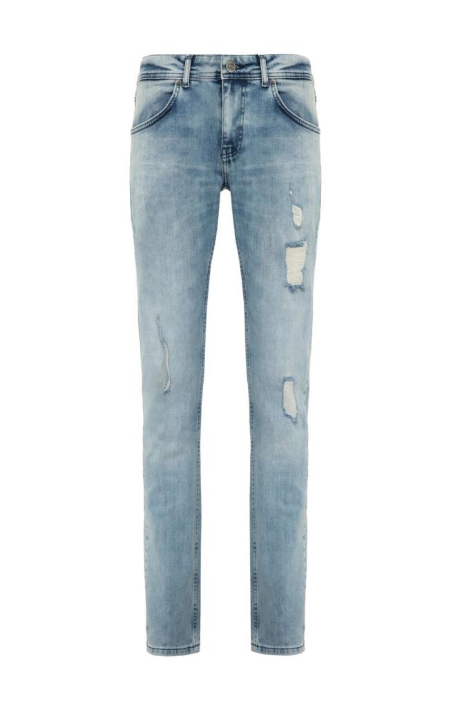 Роскошные джинсы TWEEN изысканного голубого оттенка. Оригинальная модель прямого кроя выполнена из эластичного хлопкового денима с эффектными дизайнерскими потёртостями и разрывами.