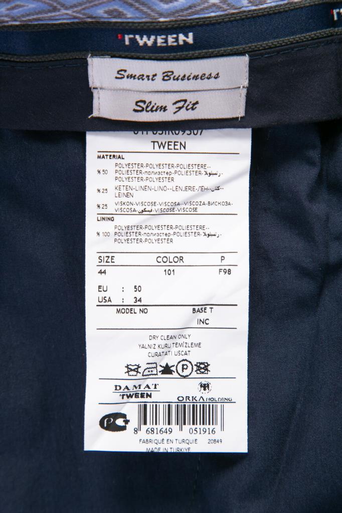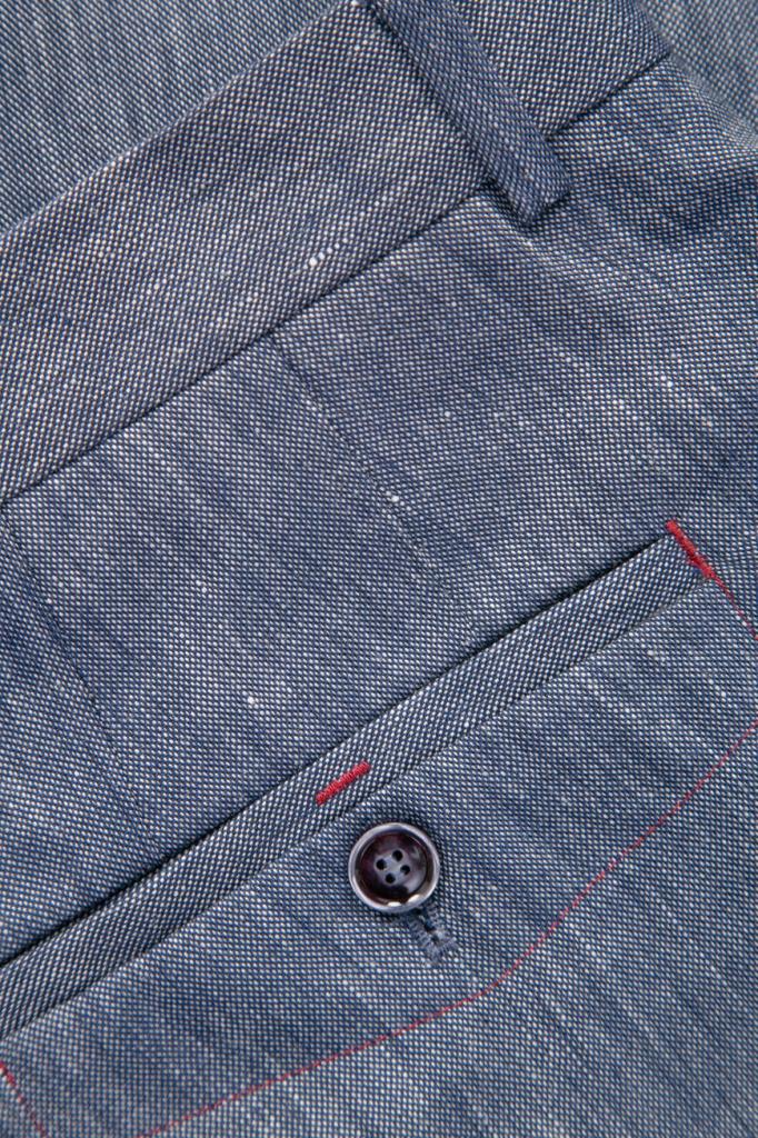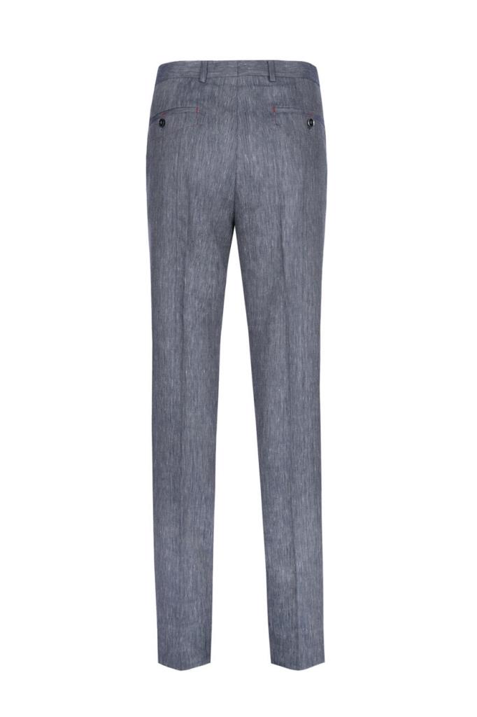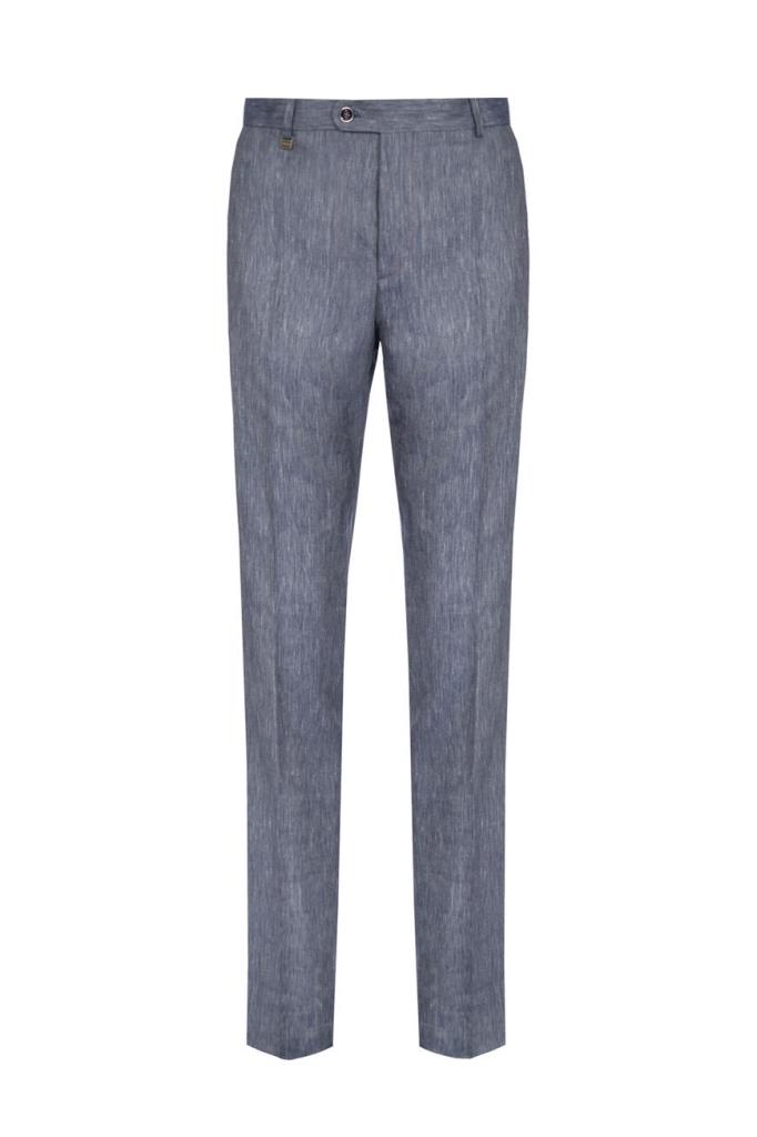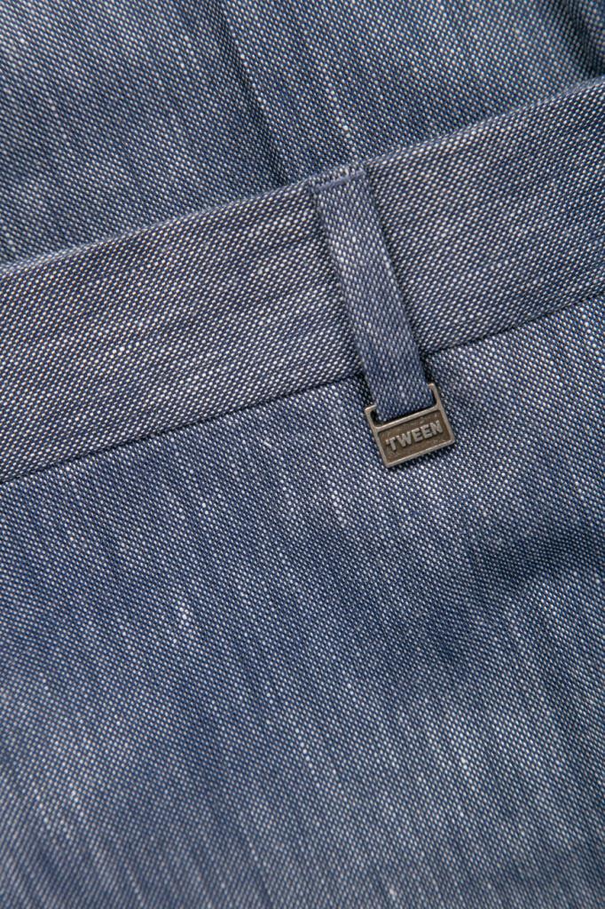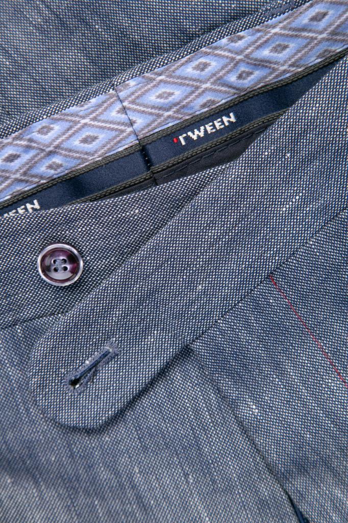 Стильные мужские классические брюки TWEEN из мягкого трикотажа на основе льна, прочного синтетического износостойкого материала и вискозного волокна синего цвета с оригинальным контрастным белым узором в крапинку, создающим эффект меланжа, по всей поверхности изделия.