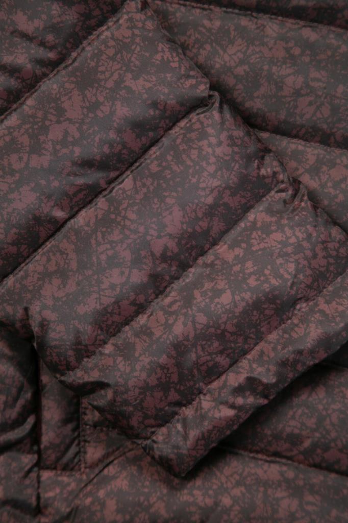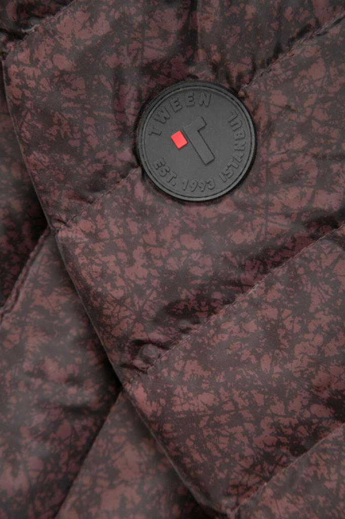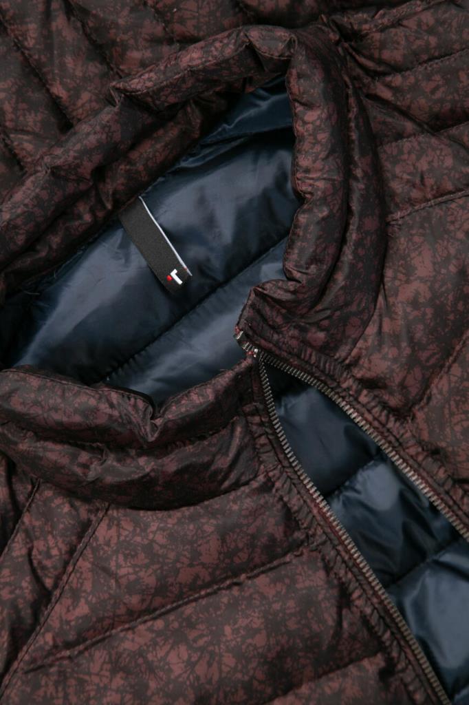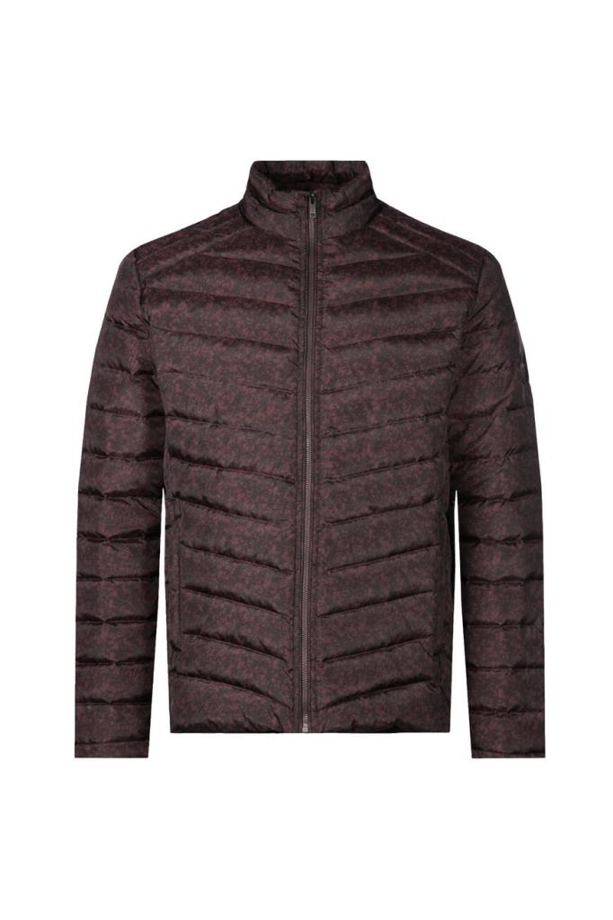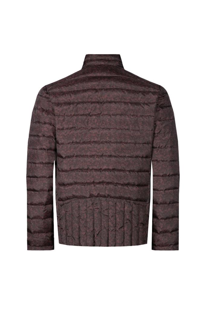 Стильная мужская стёганая куртка TWEEN из прочного синтетического износостойкого материала изысканного бордового оттенка с оригинальным контрастным чёрным абстрактным узором по всей поверхности изделия.