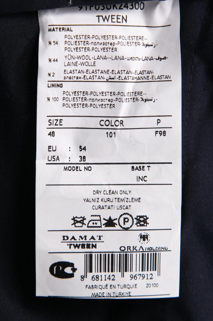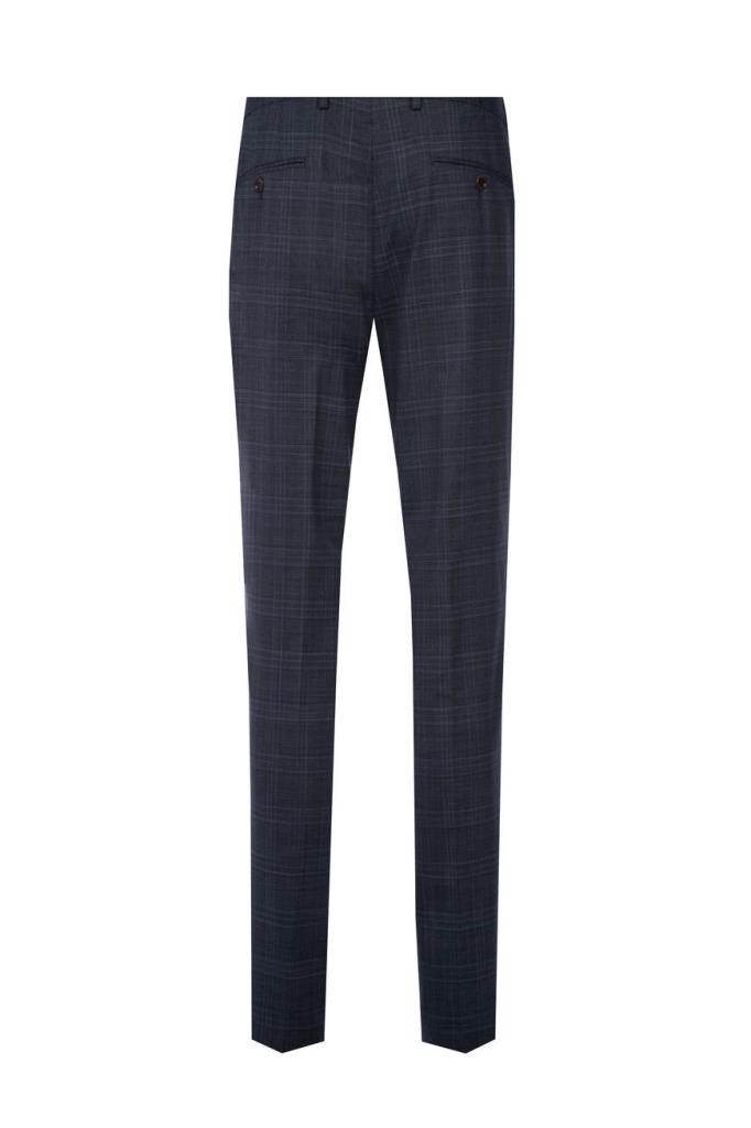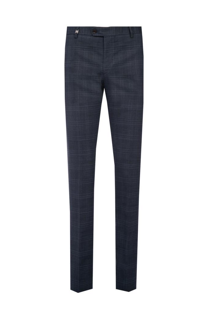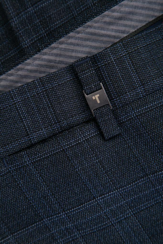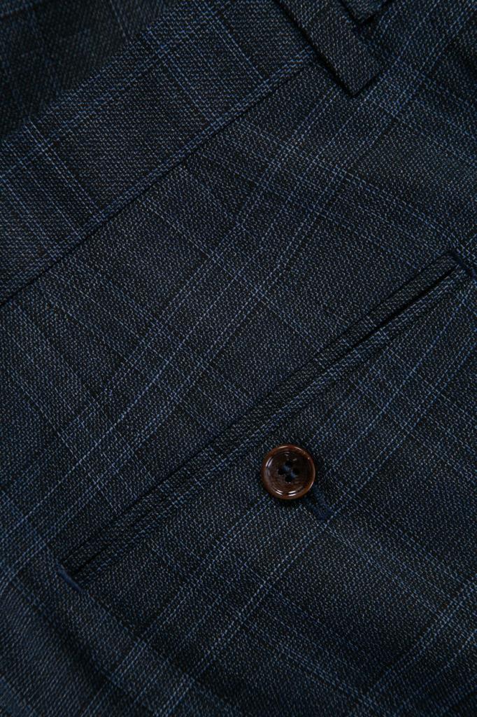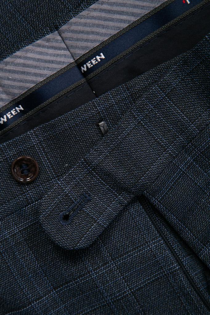 Стильные мужские брюки TWEEN из мягкого эластичного трикотажа на основе натуральной шерсти и прочного синтетического износостойкого материала тёмно-синего цвета с оригинальным контрастным синим геометрическим узором в клетку по всей поверхности изделия.