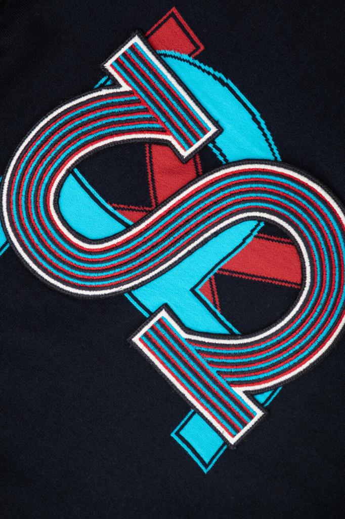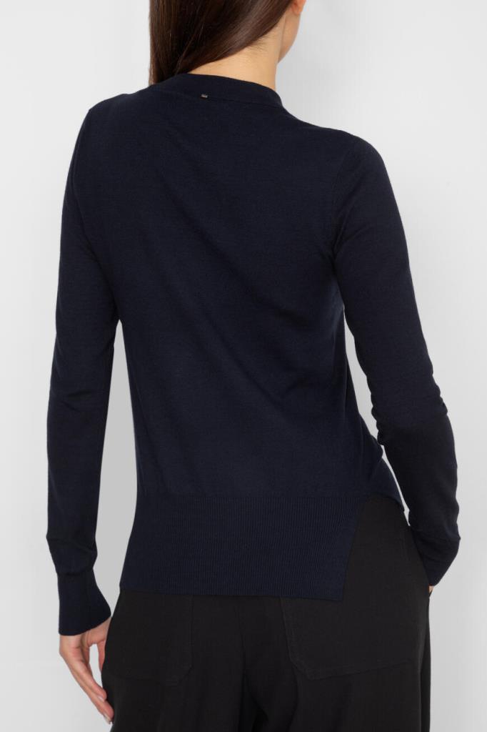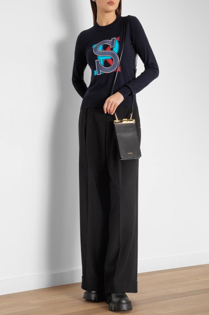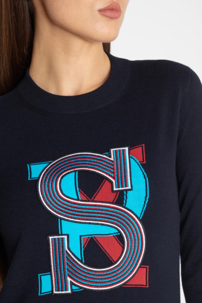 Женский джемпер MaxMara из вискозно-шерстяного микса черного цвета, с круглым вырезом, длинными рукавами, боковыми разрезами и контрастной аппликацией.