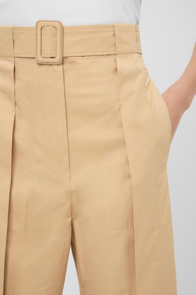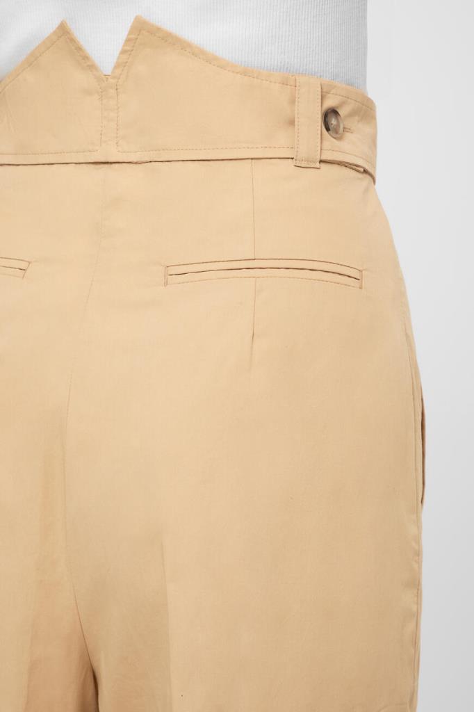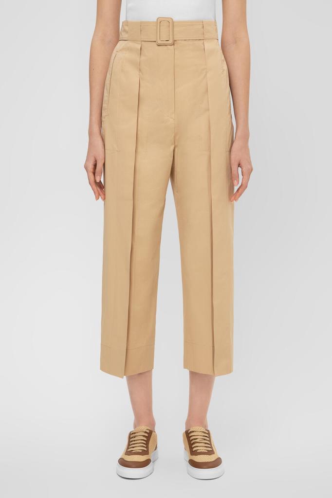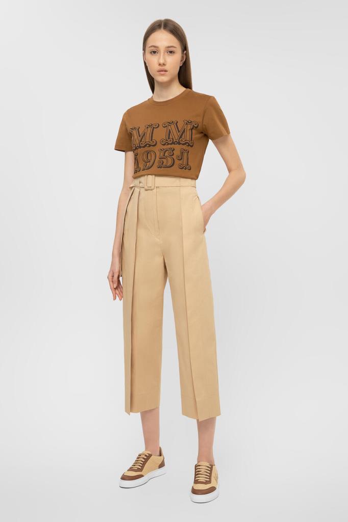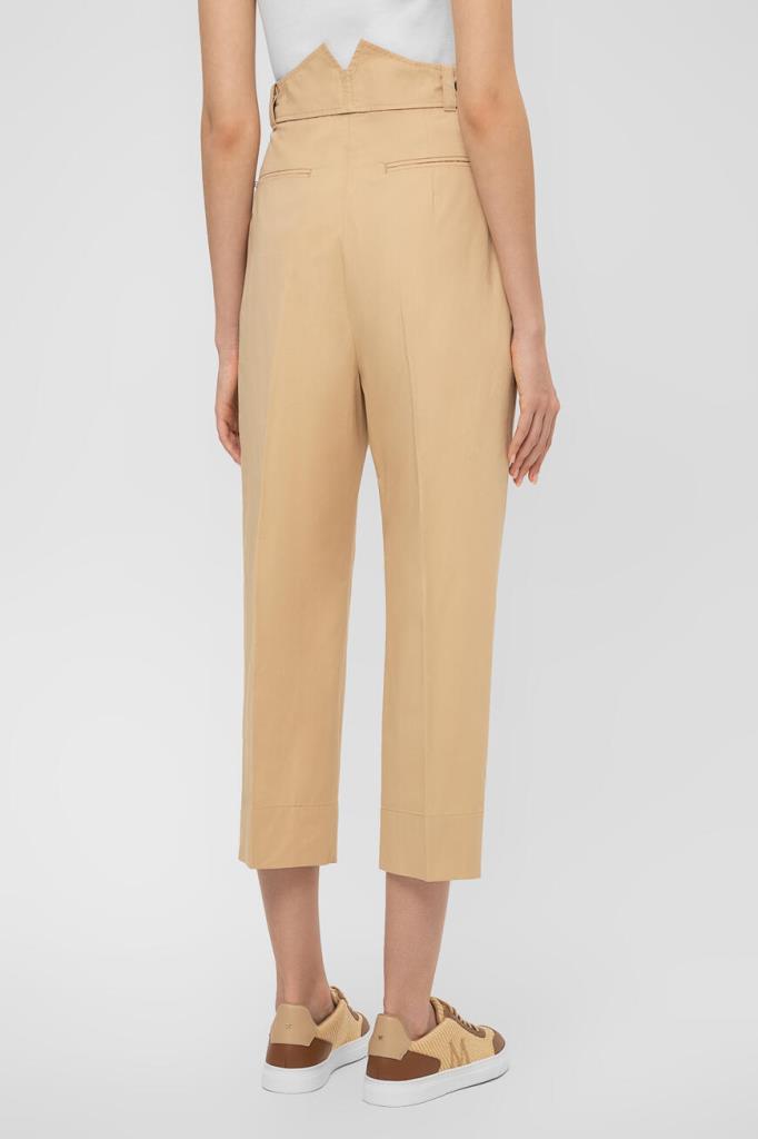 Женские брюки Max Mara из плотного гладкого хлопка бежевого цвета. Модель свободного кроя, с классическими стрелками, прорезными карманами и дизайнерским поясом.