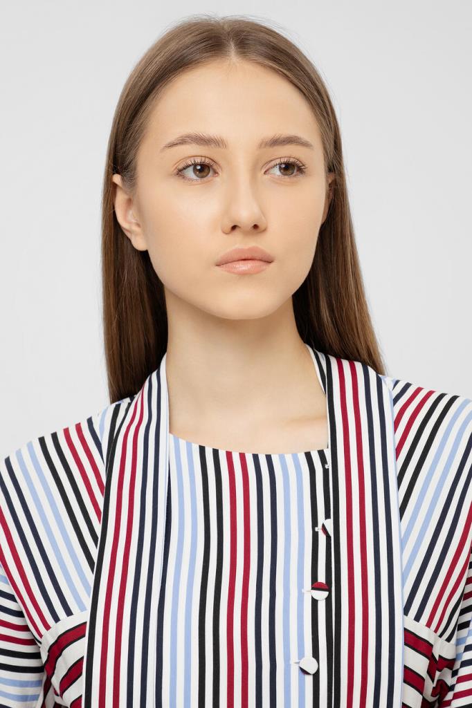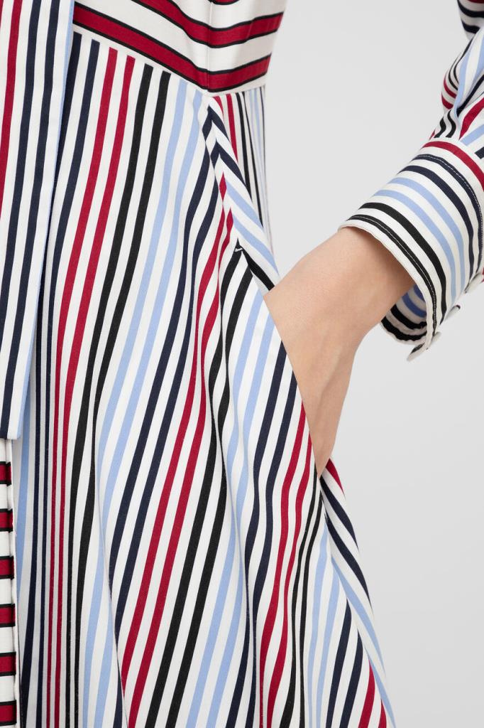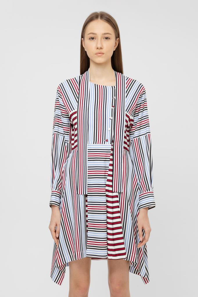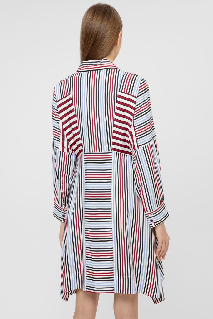 Платье-миди Max Mara из лёгкого вискозного шелка с узором в полоску в черно-красно-голубой гамме. Приталенная модель дизайнерского кроя, с воротником аскотт (завязывается бантом), смещенной застёжкой на пуговицы, длинными рукавами и асимметричным подолом.