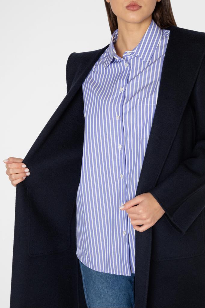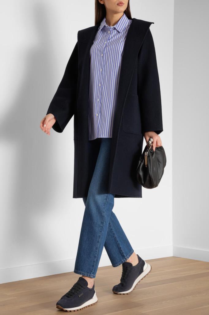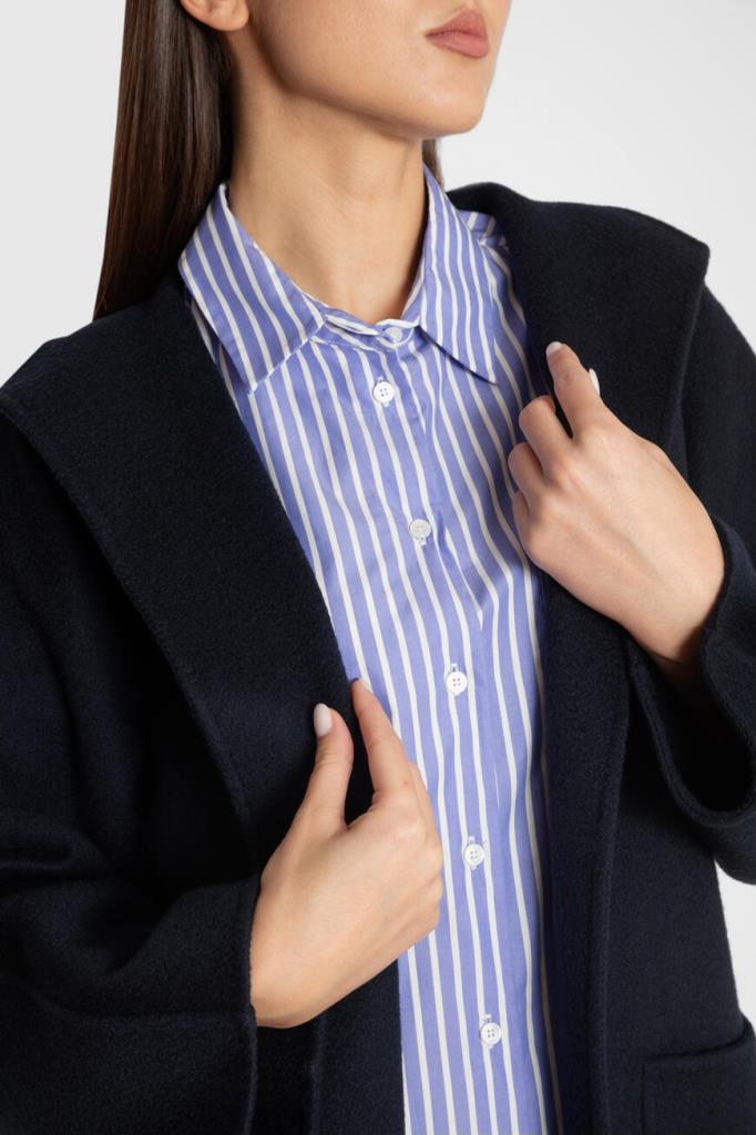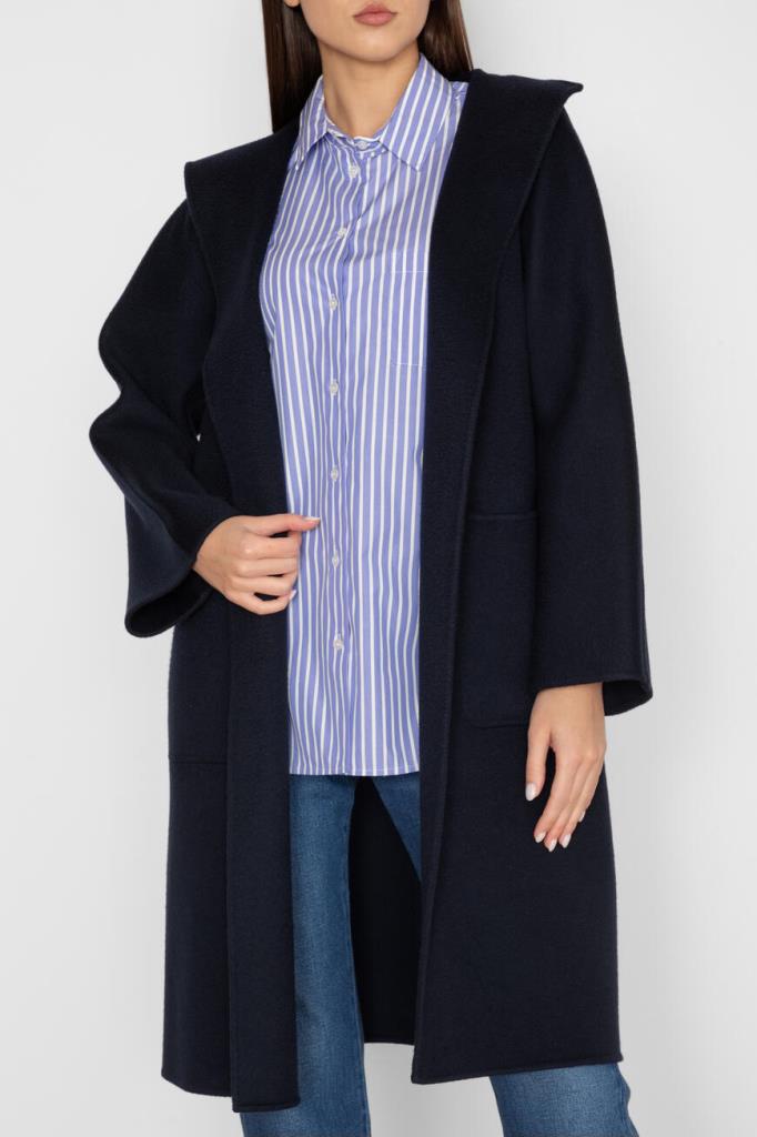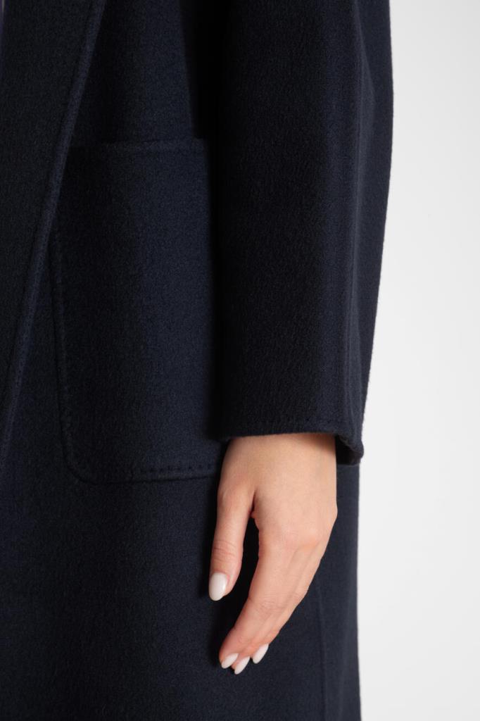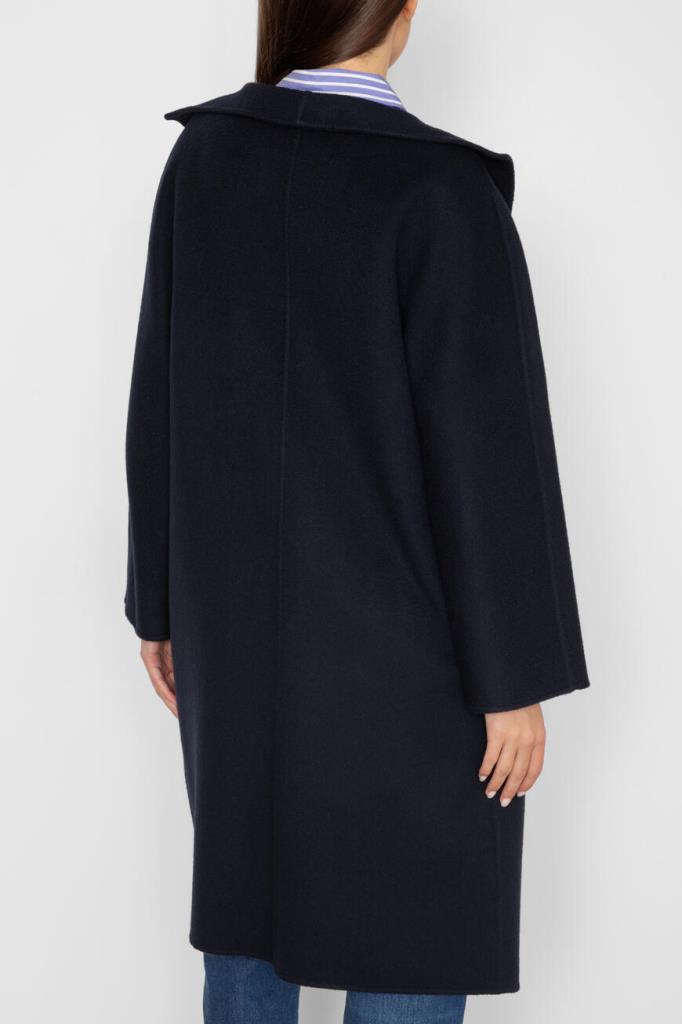 Кашемировое пальто Max Mara выполнено без застёжки. Однобортная модель средней длины отличается прямым силуэтом и двумя крупными накладными карманами по бокам. Изделие тёмно-синего цвета станет идеальным дополнением Ваших повседневных комплектов.