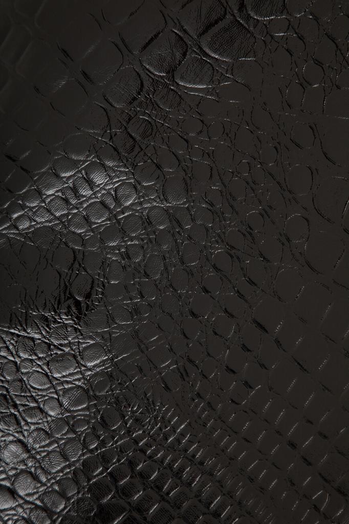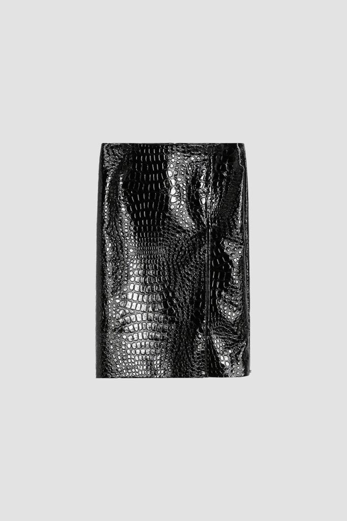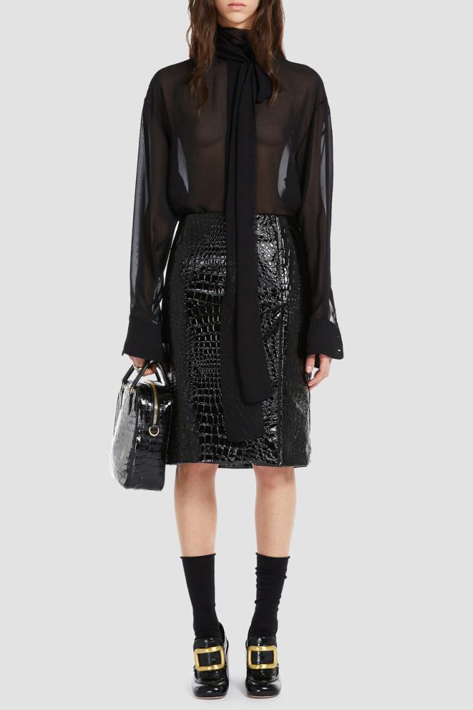 Виниловая юбка-карандаш чёрного цвета от Max Mara. Модель длины миди сшита из смесовой хлопчатобумажной ткани и дополнена тиснёным узором, имитирующим кожу крокодила. Образ дополнит полупрозрачная блуза из линейки SPORTMAX.