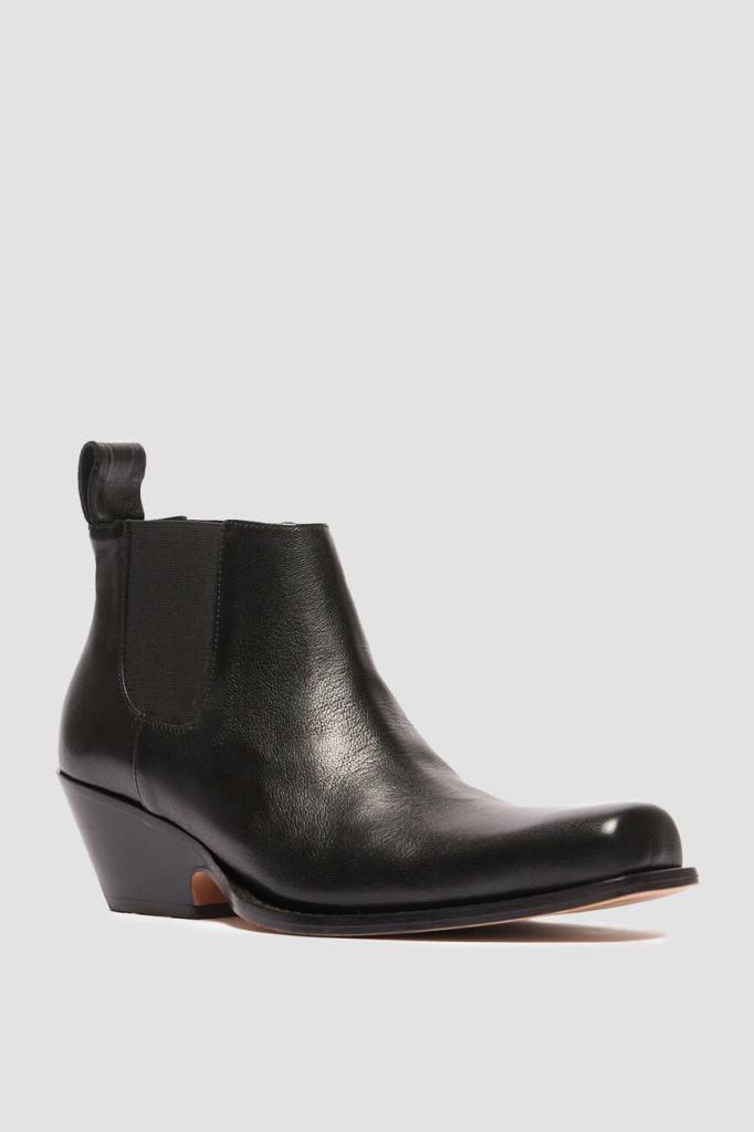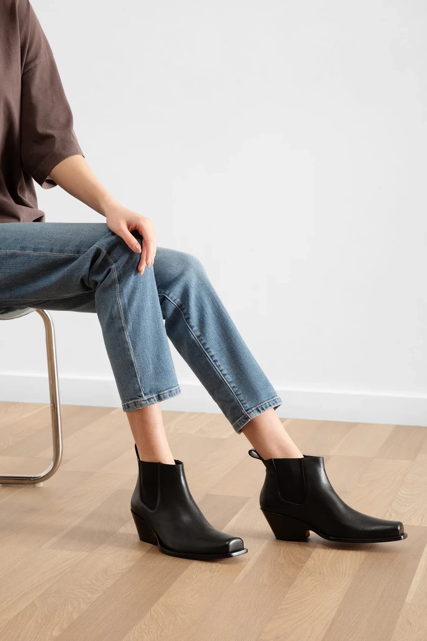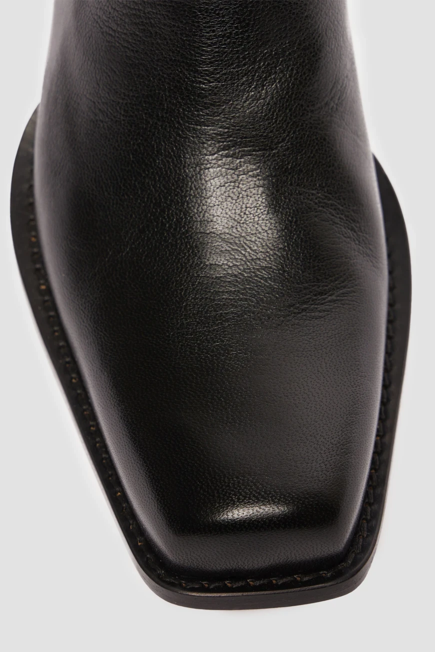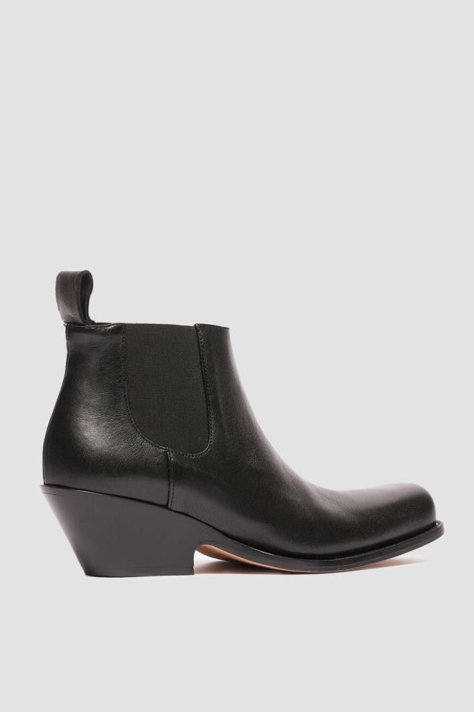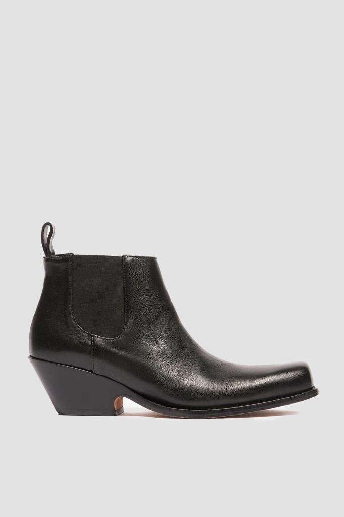 Черные челси Aldeno от Max Mara выполнены из кожи ягненка. Модель имеет характерные эластичные вставки по бокам, которые помогают легко надевать и снимать обувь. За комфорт отвечает мягкая кожаная подкладка изделия. Сапоги имеют узкий квадратный носок с выступающей подошвой. Черные ботильоны с низким ковбойским каблуком станут отличным дополнением к стильному городскому образу на весну.
