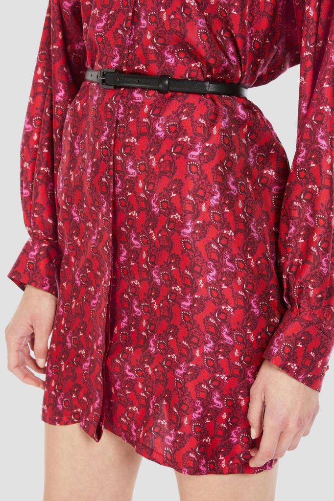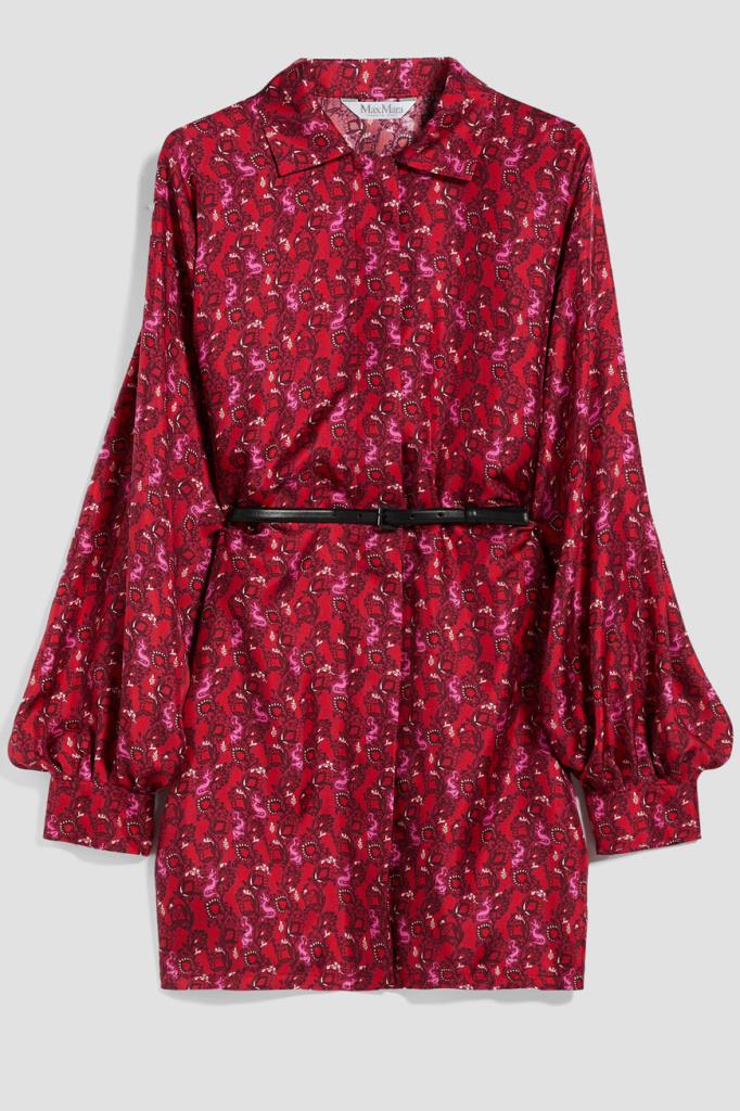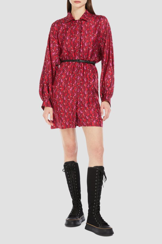 Короткое платье-рубашка на роговых пуговицах с планкой от Max Mara. Для пошива модели бордового оттенка используется мягкий шелковый твил. Поверхность изделия покрыта цветочным мотивом и восточным принтом с изображением драконов, посвященным Китайскому Новому году. Тонкий кожаный ремень чёрного цвета с металлической пряжкой подчеркивает линию талии.