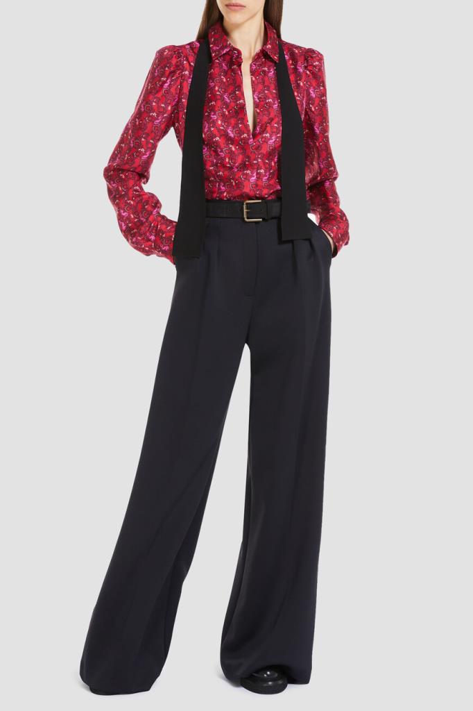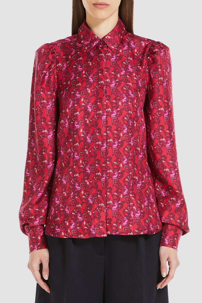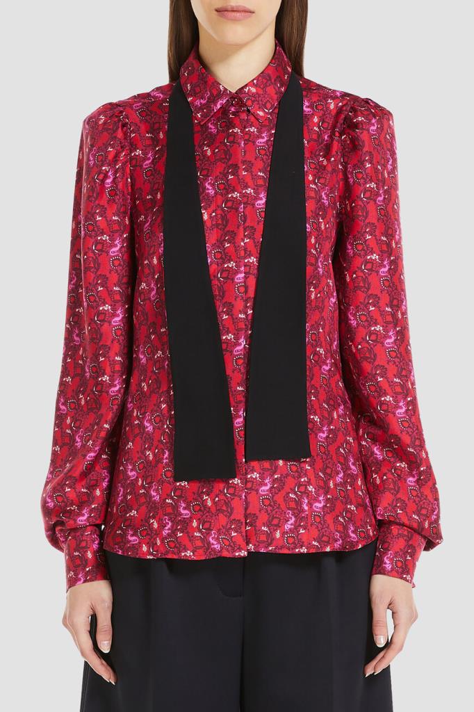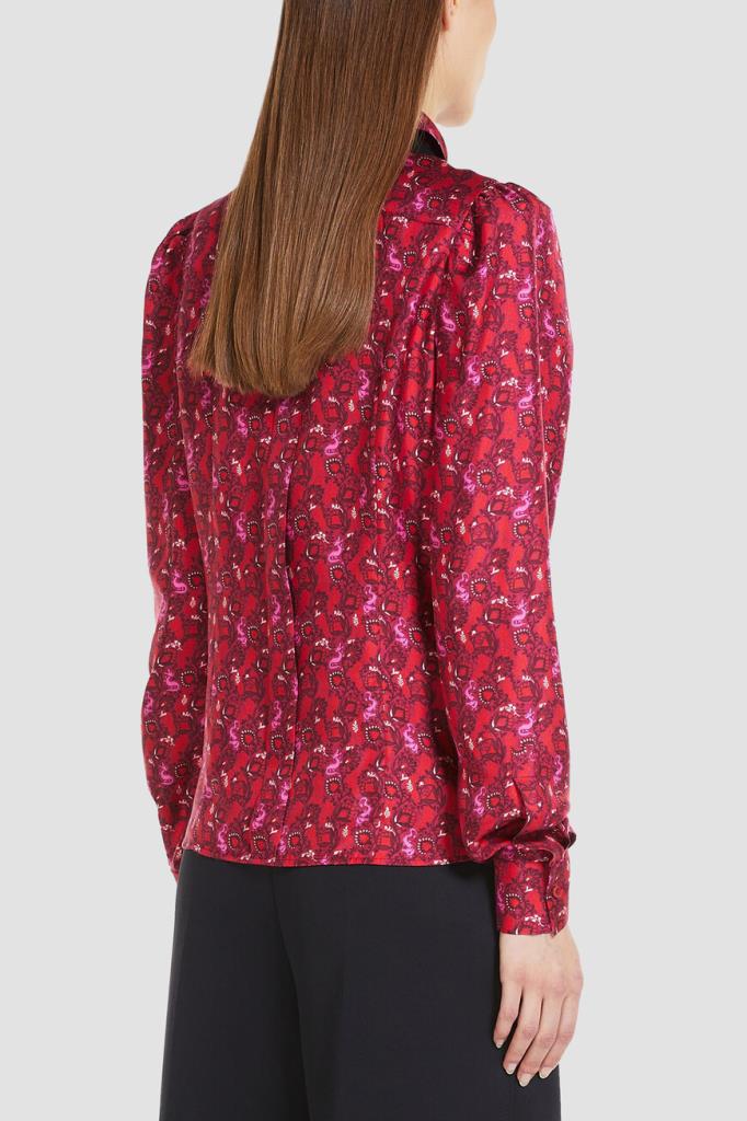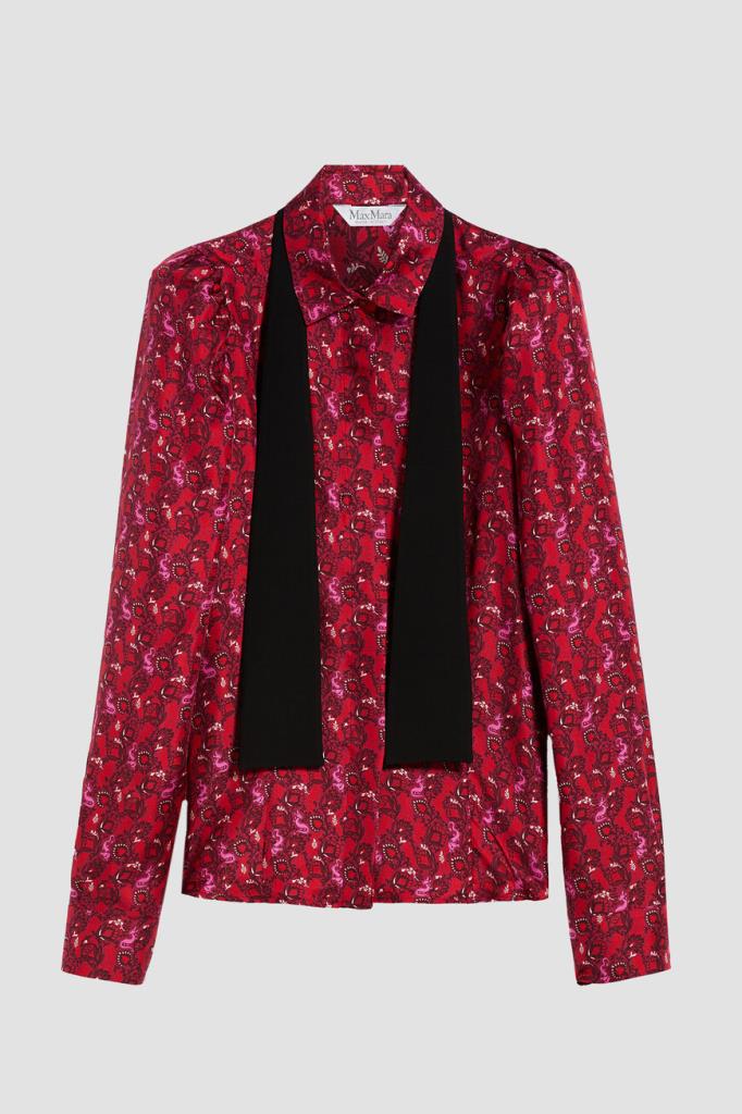 Бордовая блуза Max Mara выполнена из шелкового твила. Модель Mino посвящена Китайскому новому году и украшена восточным принтом с драконами. Рубашка с широкими епископскими рукавами дополнена съемным черным галстуком. Составьте повседневный образ с черными широкими брюками Max Mara.