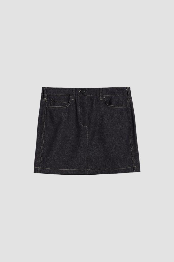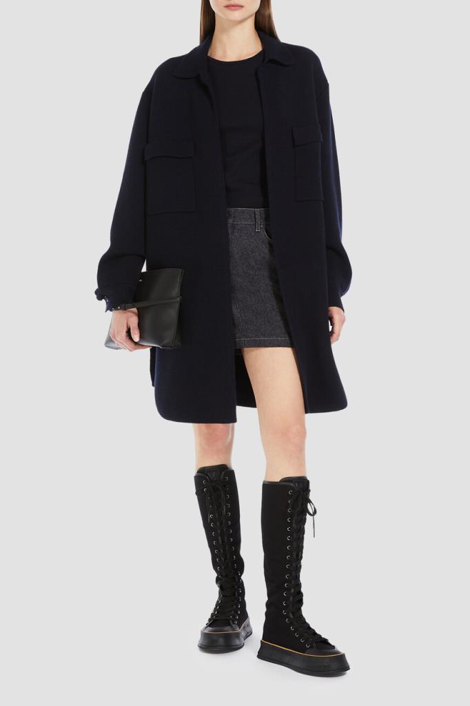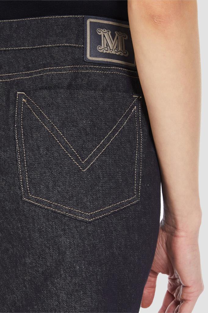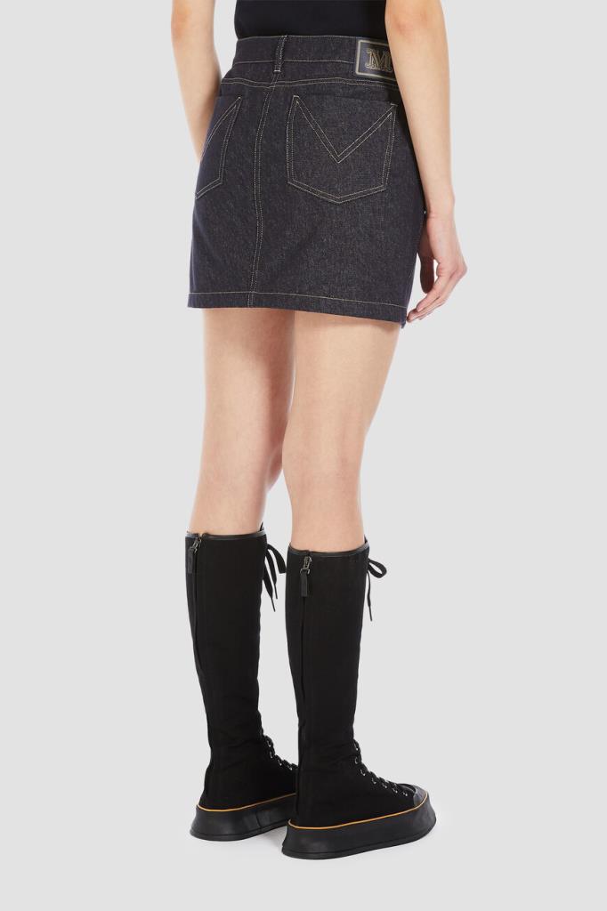 Джинсовая юбка-мини от Max Mara. Для изготовления модели прямого кроя используется мягкой хлопковый деним цвета индиго. Атрибутами бренда стали брендированная накладка с дизайнерской литерой «M» на поясе сзади и двойная строчка-узор в виде первой буквы из названия бренда на задних карманах.