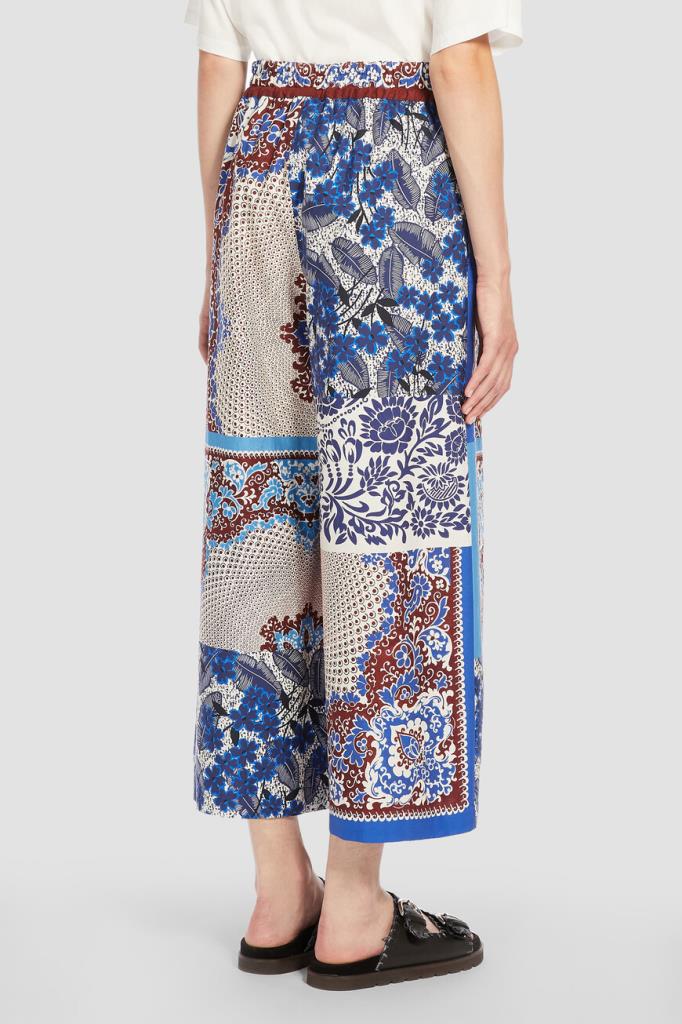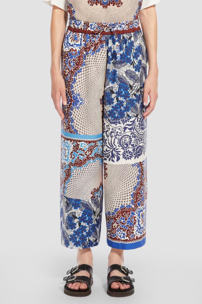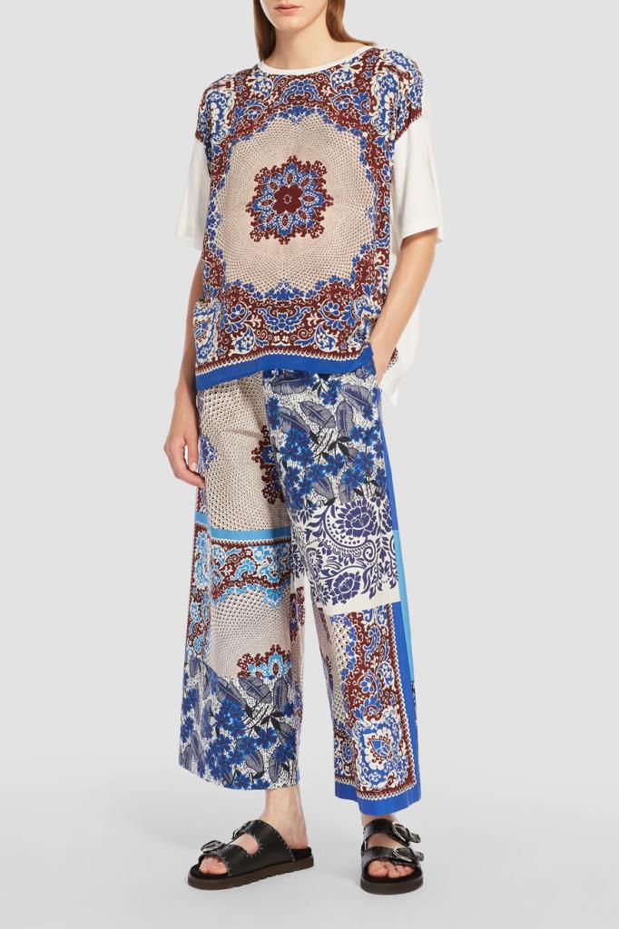 Принтованные брюки из тонкого хлопкового поплина от Max Mara. Укороченная модель оснащена широким эластичным поясом-кулиской и дополнена двумя боковыми карманами в швах. Декором выступает разноцветный цветочный орнамент. Изделие составит идеальный комплект с блузой с коротким рукавом из той же линейки.