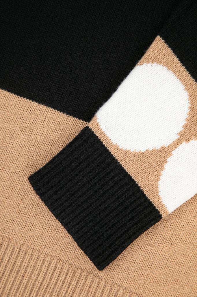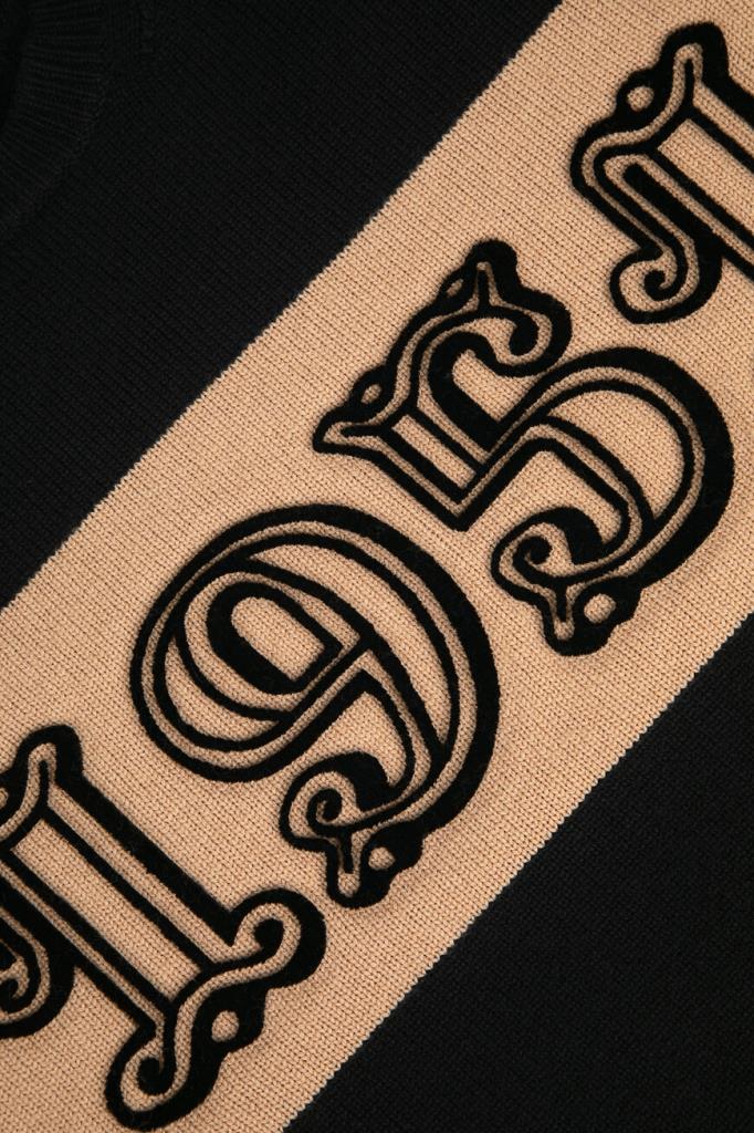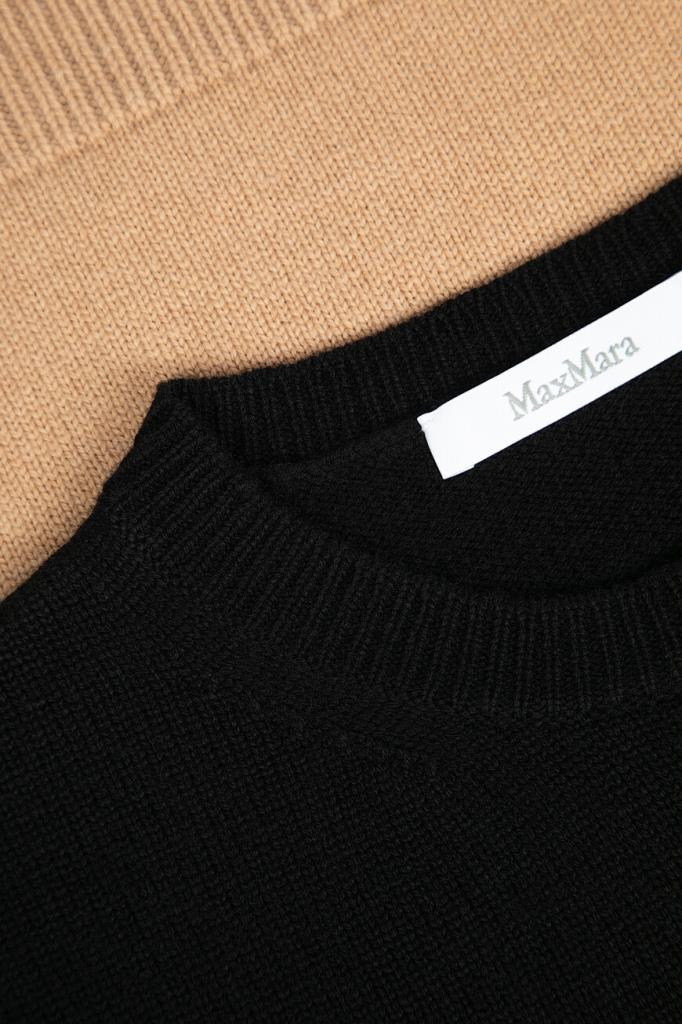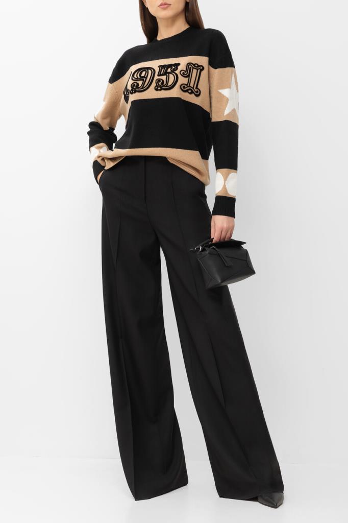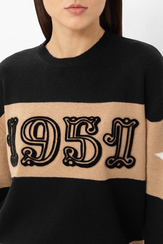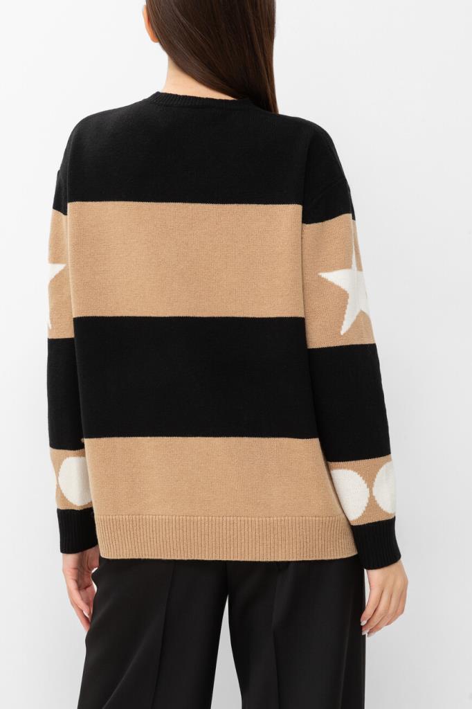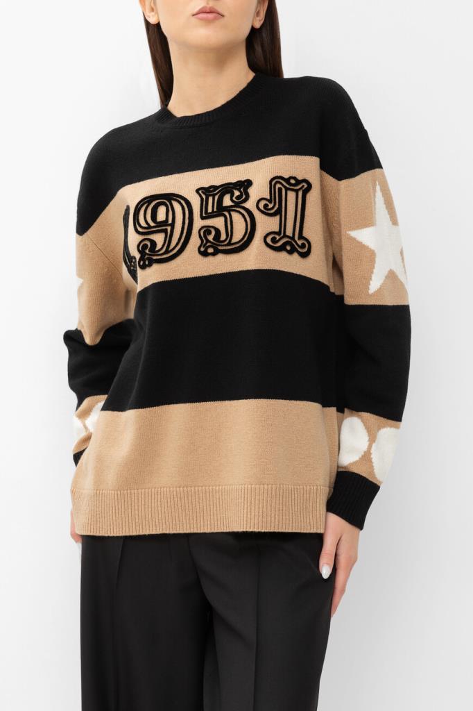 Пуловер Max Mara состоит из широких горизонтальных полос. Легендарная модель изготовлена из натуральной шерсти и кашемира чулочной вязкой. Спереди расположена крупная рельефная надпись-год основания Дома чёрного цвета в характерной флокированной текстуре, а рукава украшает белый жаккардовый мотив в виде звёзд и кружочков. Горловина, манжеты и пояс подобраны на резинку.