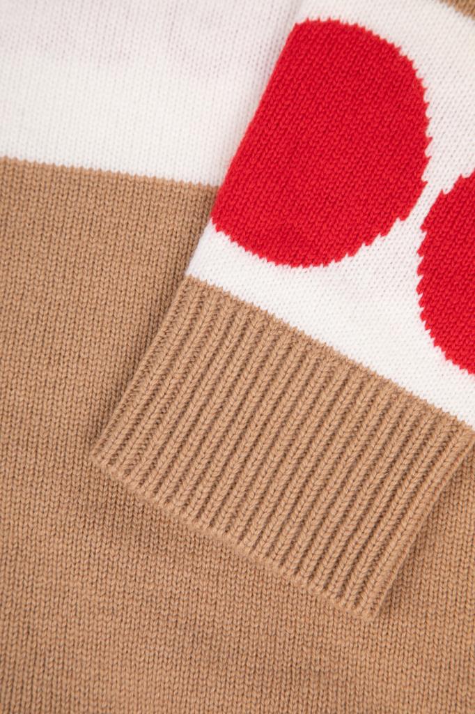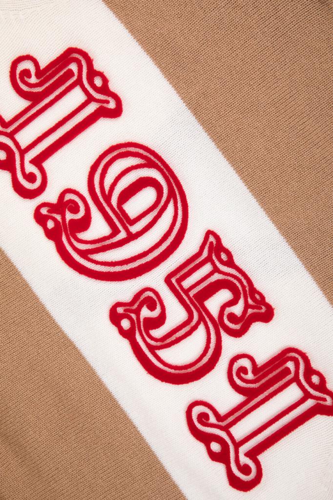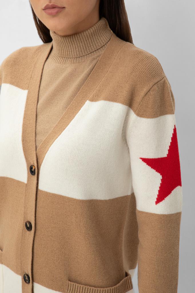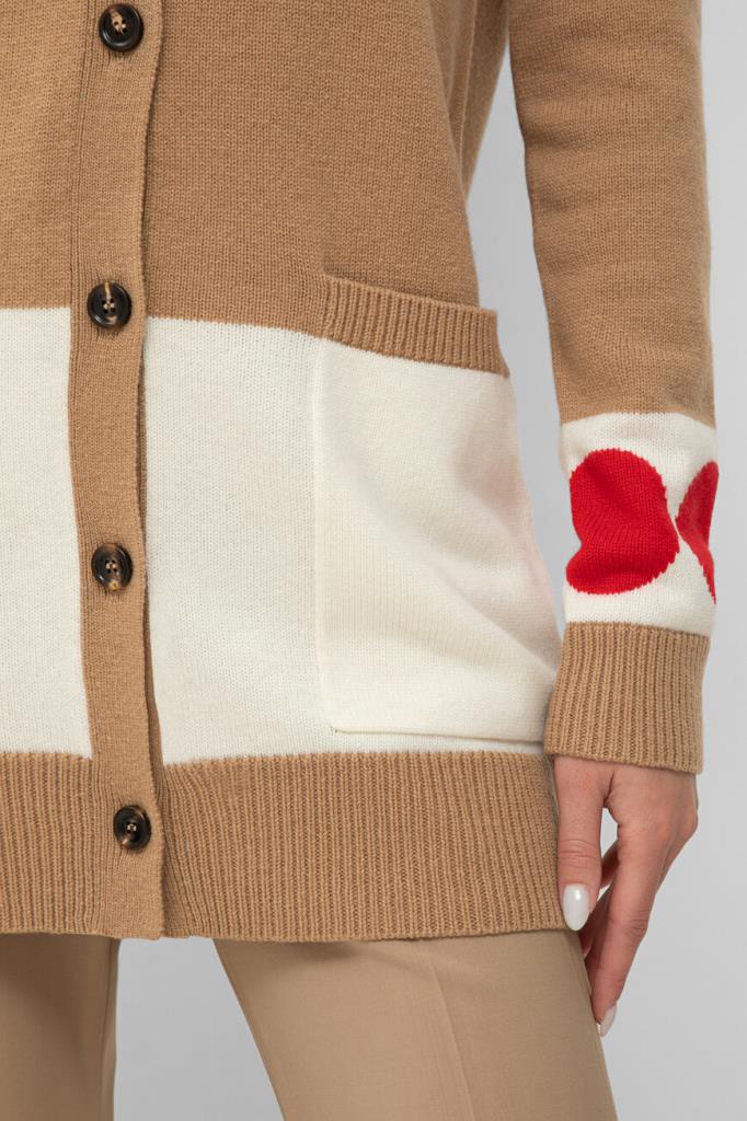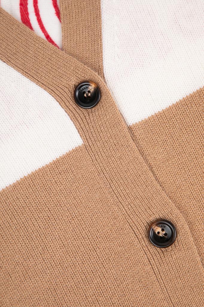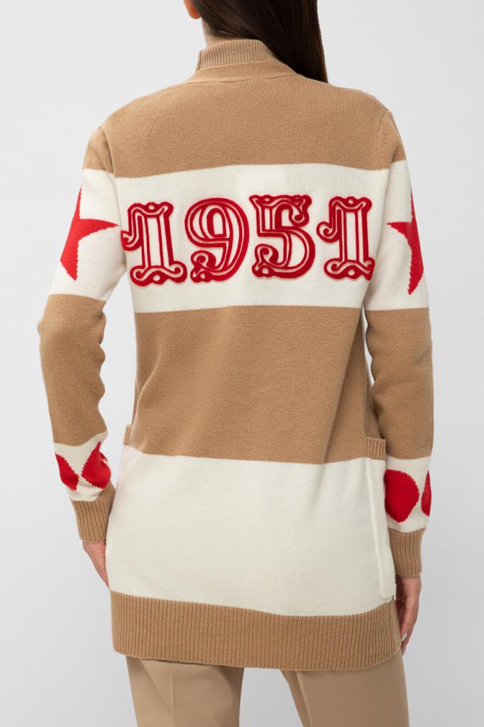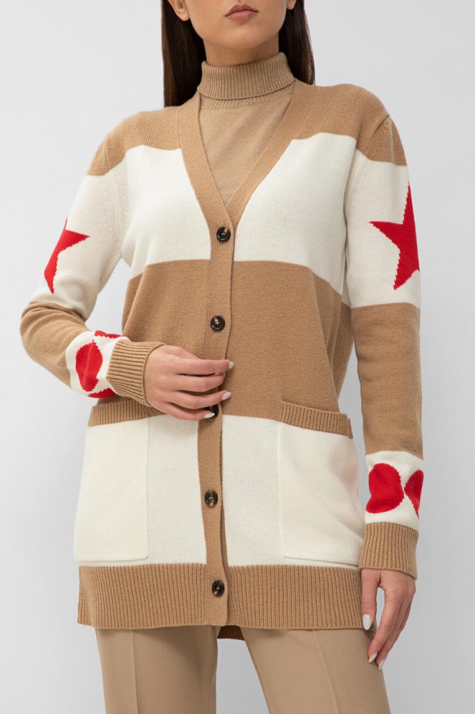 Длинный трёхцветный кардиган от Max Mara. Изделие выполнено из мягкой пряжи на основе натуральной шерсти и кашемира. Поверхность модели оверсайз на крупных роговых пуговицах покрыта широкими горизонтальными полосами белого и песочного оттенков, чередующимися между собой. Кардиган индивидуализирован ярко-красными жаккардовым мотивом на рукавах и рельефной надписью-годом основания Дома с характерной флокированной текстурой, нанесённой на спинку.