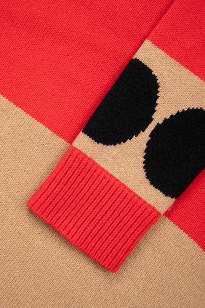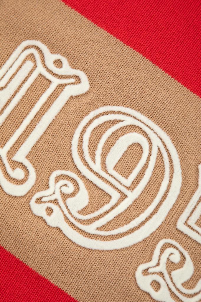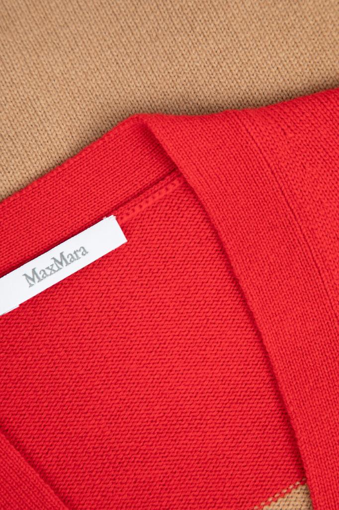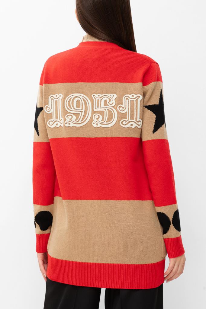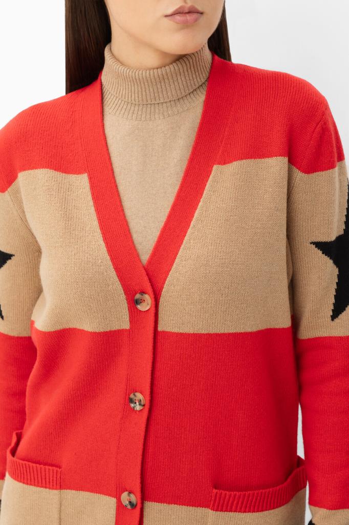 Вязаный кардиган Max Mara с глубоким V-образным вырезом. Для создания длинной модели силуэта оверсайз выбраны натуральная шерсть и кашемир в бежево-красной гамме. Отличительными особенностями изделия стали полосатый геометрический мотив, жаккардовые изображения звёзд и кругов на рукавах и крупная рельефная надпись-год основания Дома с характерной флокированной текстурой.