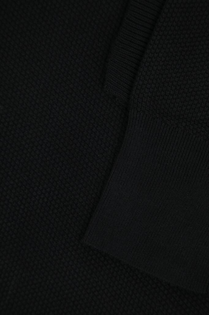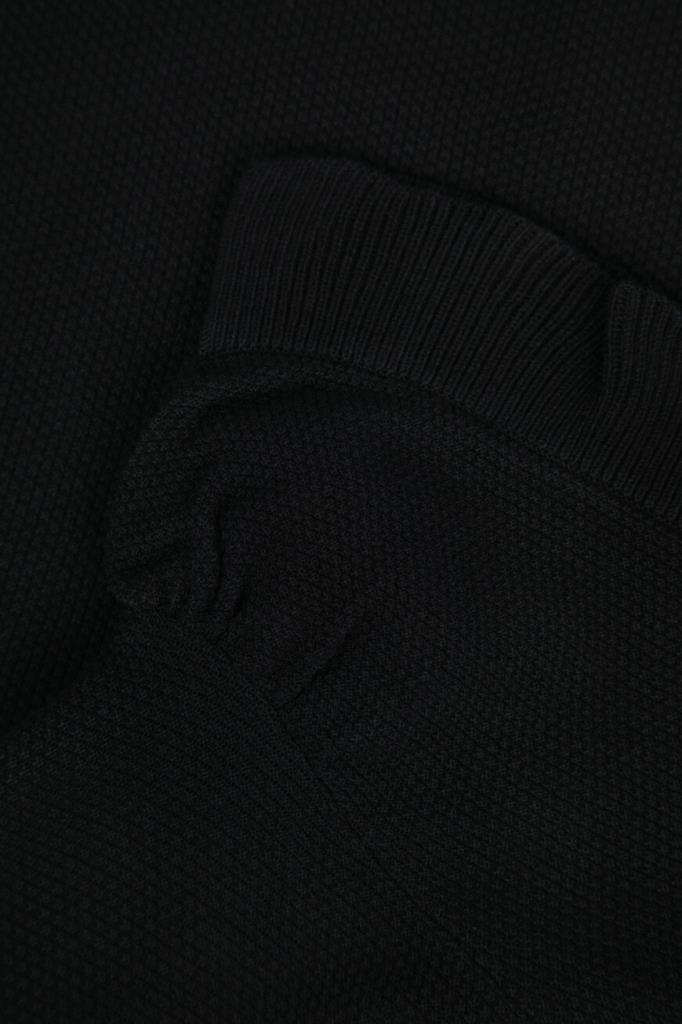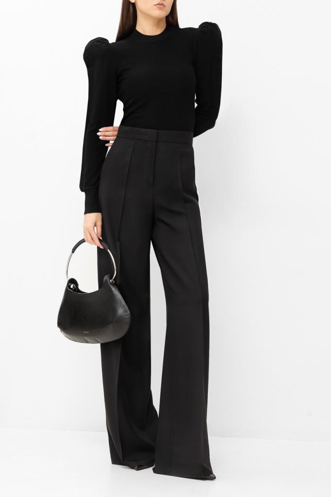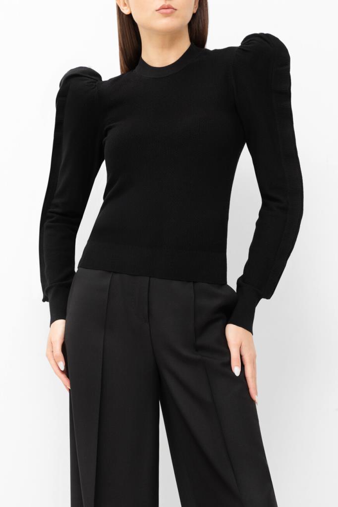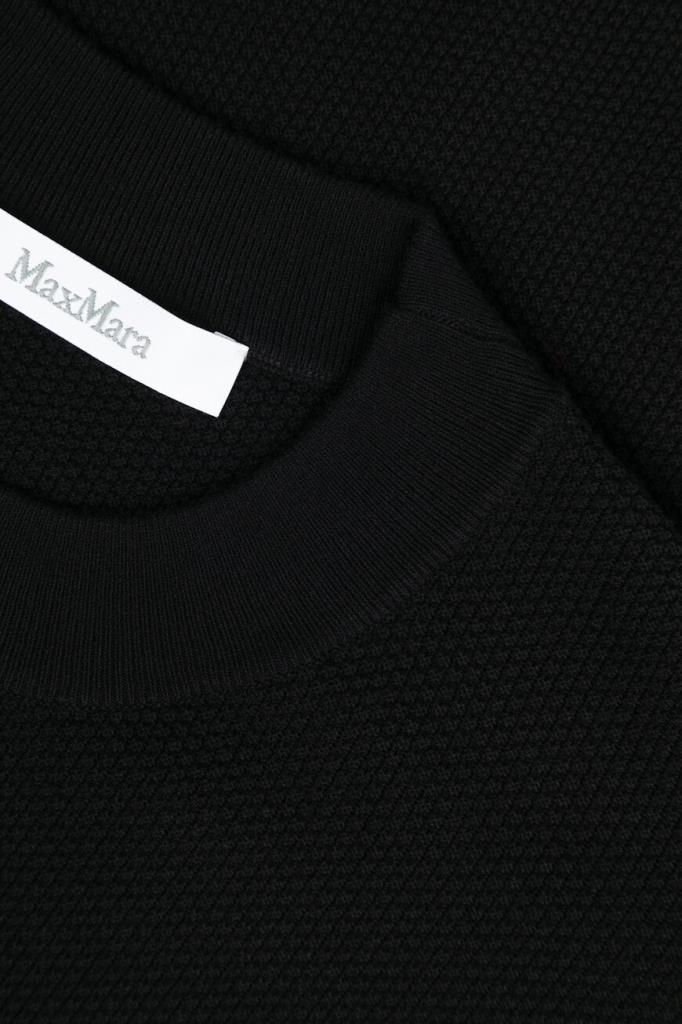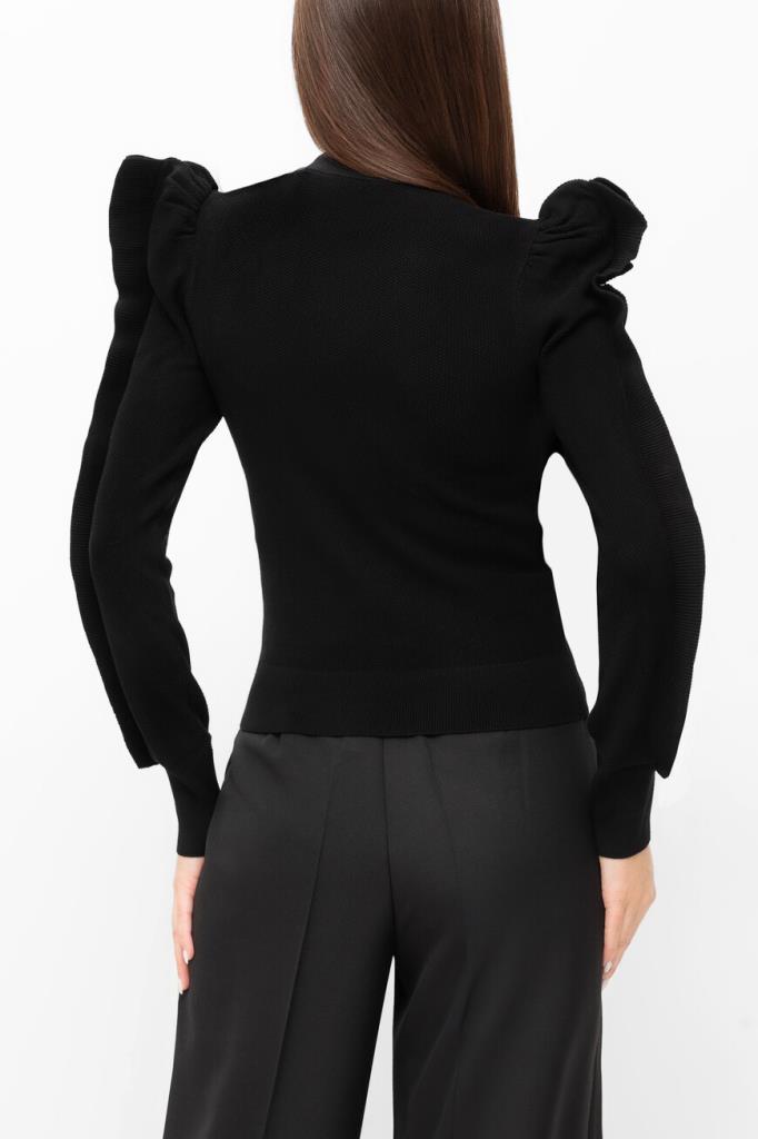 Фактурный вязаный джемпер чёрного цвета от Max Mara. Модель из мягкого трикотажа на основе прочного полиэфира и вискозного волокна украшают широкие оборки-воланы в тон на рукавах. Изделие характеризуется прилегающим силуэтом и круглым вырезом горловины на резинке. Образ можно дополнить шерстяными брюками палаццо и вместительной сумкой Caju того же бренда.