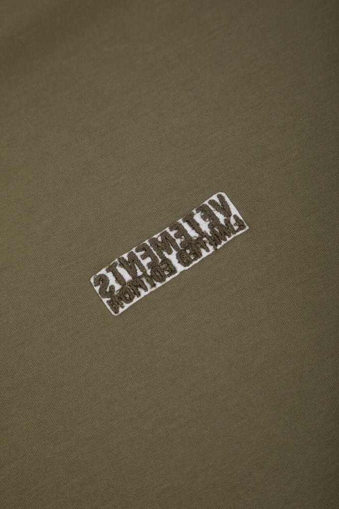 Футболка oversize цвета хаки от VETEMENTS. Модель изготовлена из мягкого хлопкового джерси, приятного на ощупь. Отличительными особенностями изделия стали видимые швы, создающие впечатление, что футболку вывернули наизнанку, а также смещенный вправо зеркальный логотип, вышитый поверх белой накладки. Модель расслабленного силуэта, обеспечивающего комфорт и свободу движений, входит в эксклюзивную коллекцию Дома.
