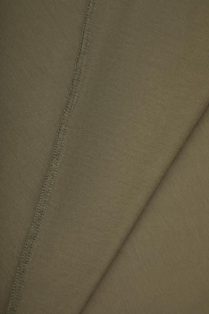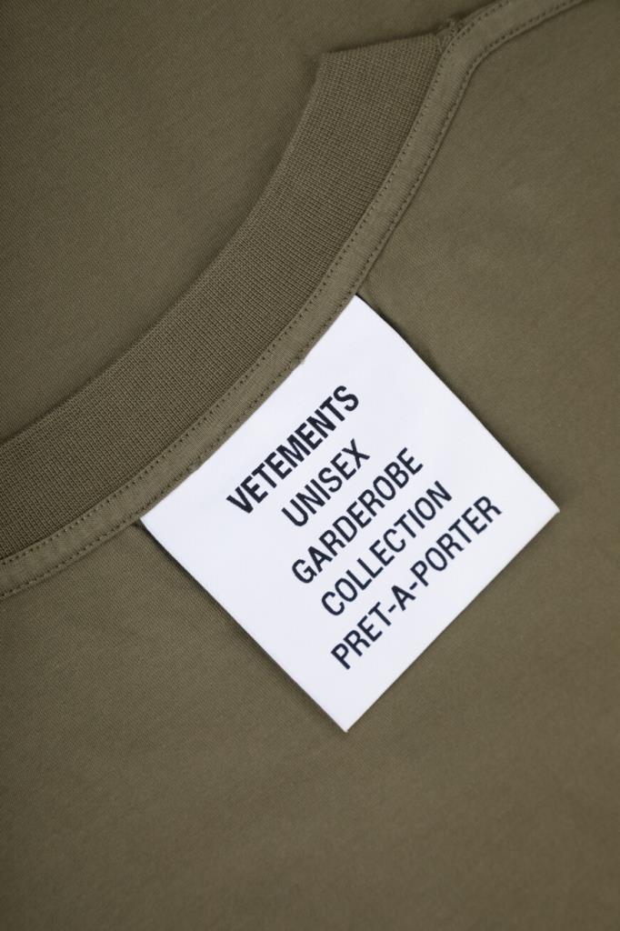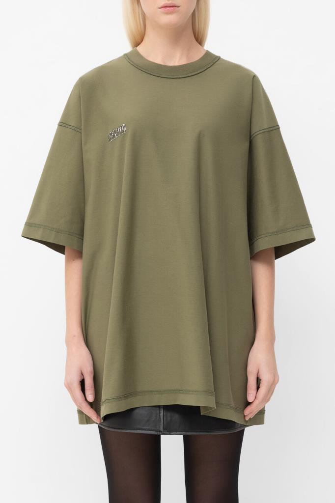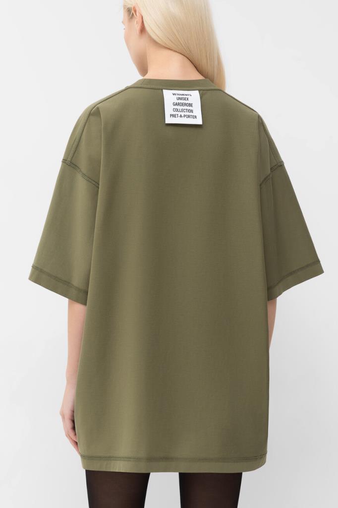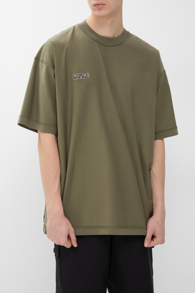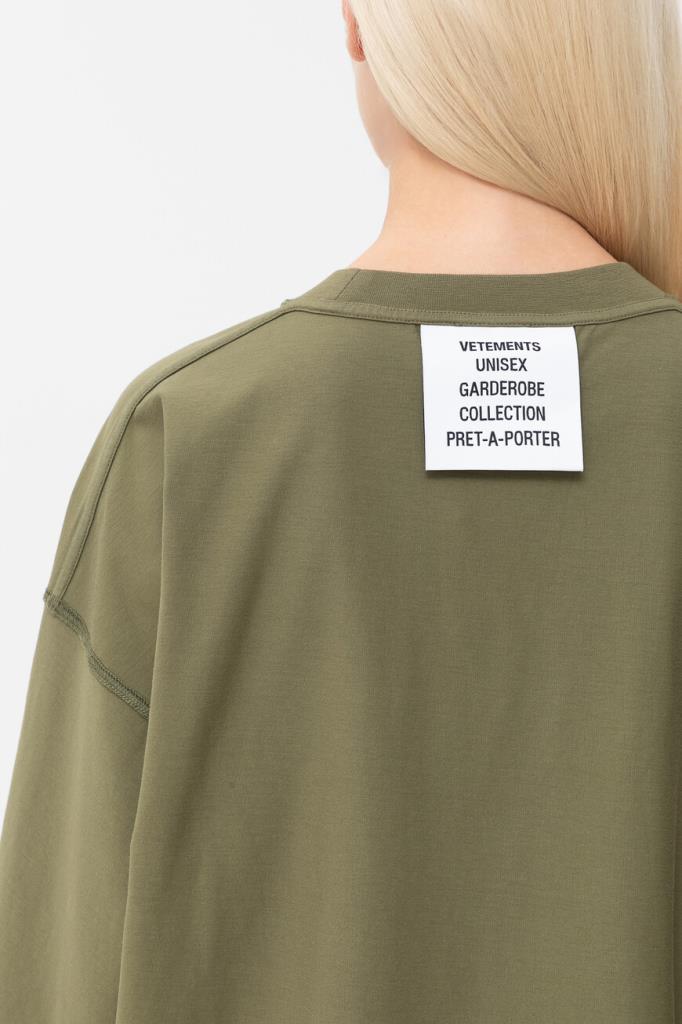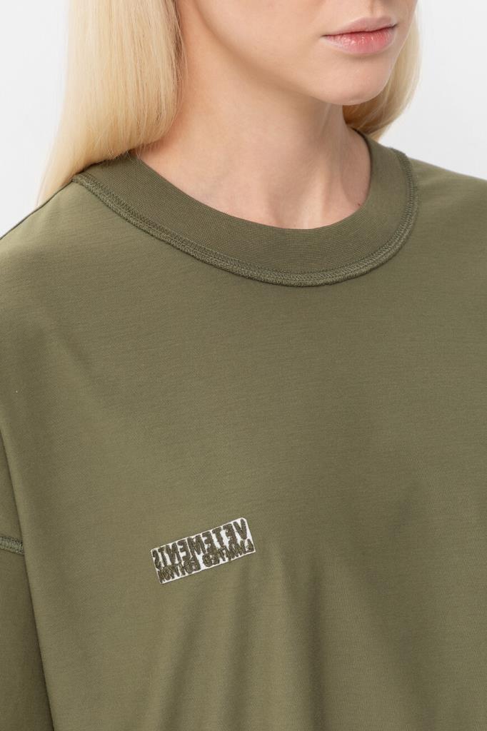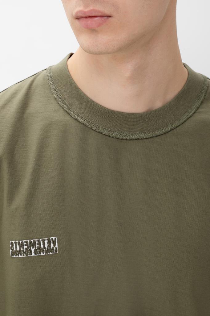 Футболка oversize цвета хаки от VETEMENTS. Модель изготовлена из мягкого хлопкового джерси, приятного на ощупь. Отличительными особенностями изделия стали видимые швы, создающие впечатление, что футболку вывернули наизнанку, а также смещенный вправо зеркальный логотип, вышитый поверх белой накладки. Модель расслабленного силуэта, обеспечивающего комфорт и свободу движений, входит в эксклюзивную коллекцию Дома.