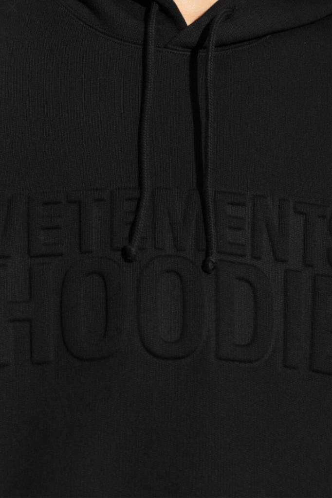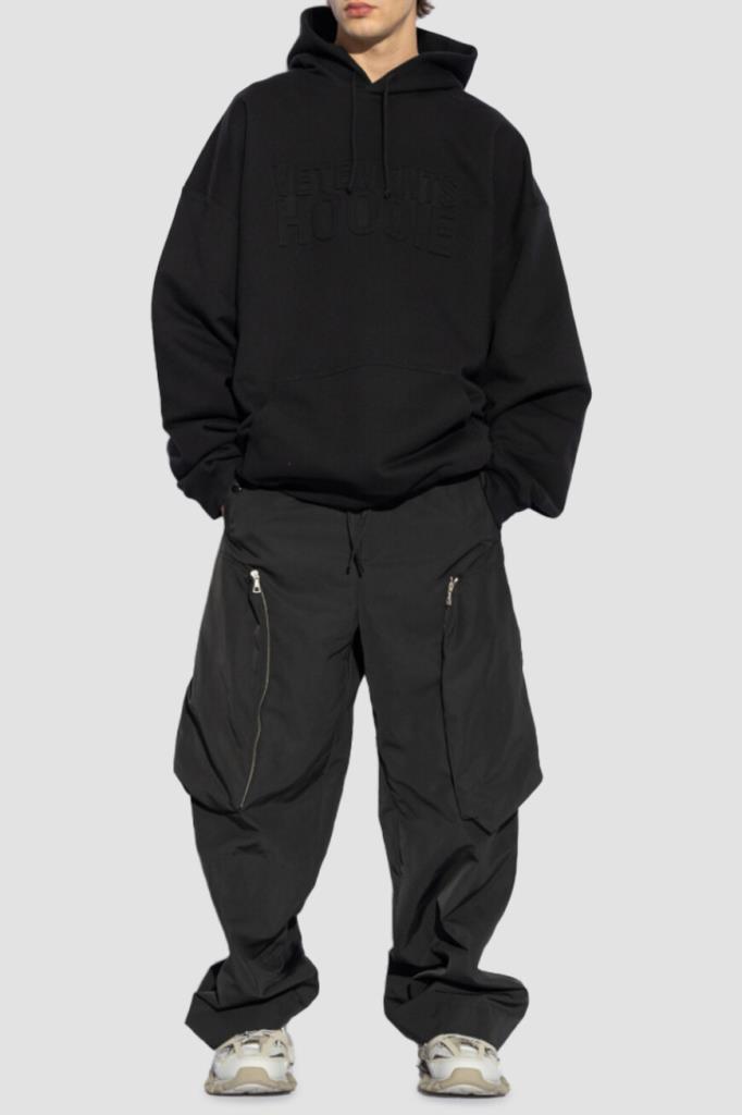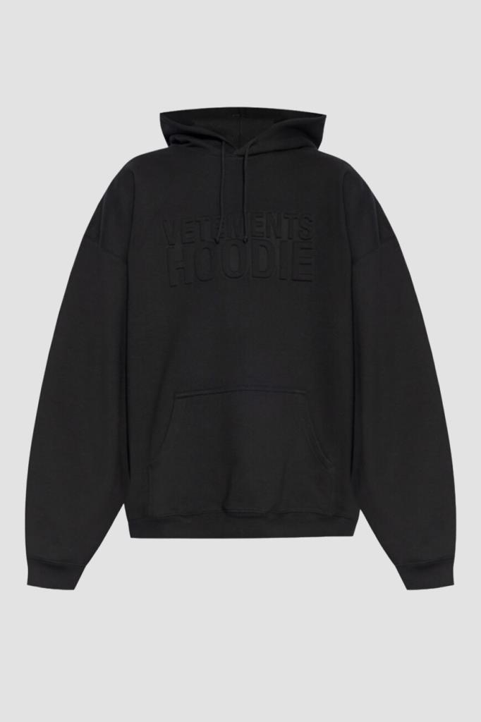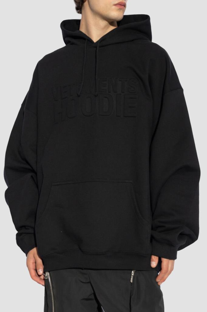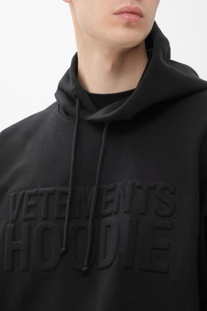 Чёрное худи VETEMENTS с глубоким капюшоном. Изделие сшито из мягкого трикотажа на основе хлопка и полиэфира. Атрибутом Дома стала крупная рельефная надпись «VETEMENTS HOODIE» спереди в тон. Манжеты рукавов и широкий пояс подобраны на резинку. Худи с карманом-кенгуру является универсальным дополнением к любому гардеробу.