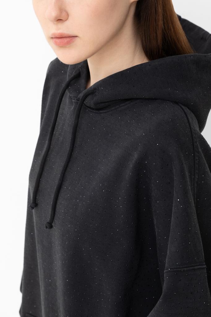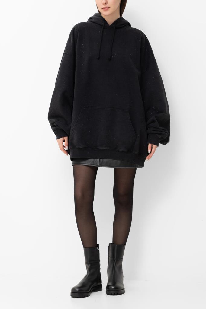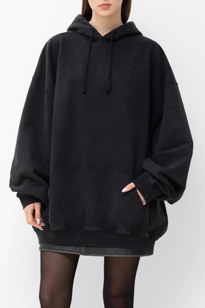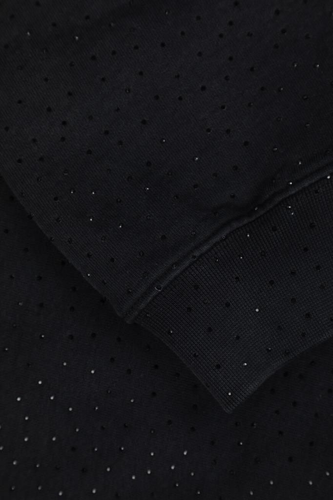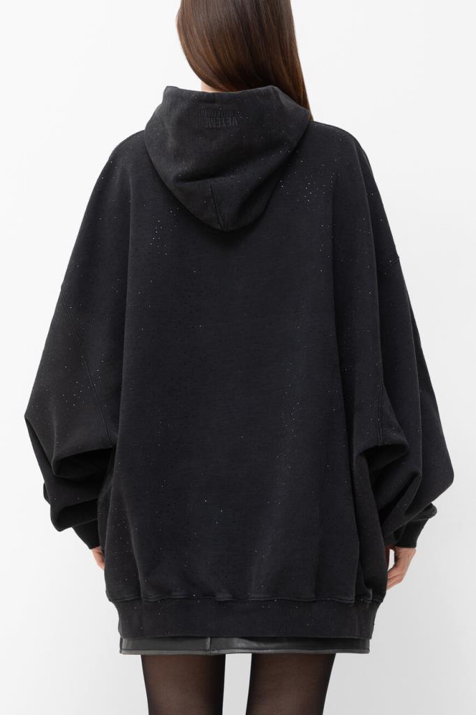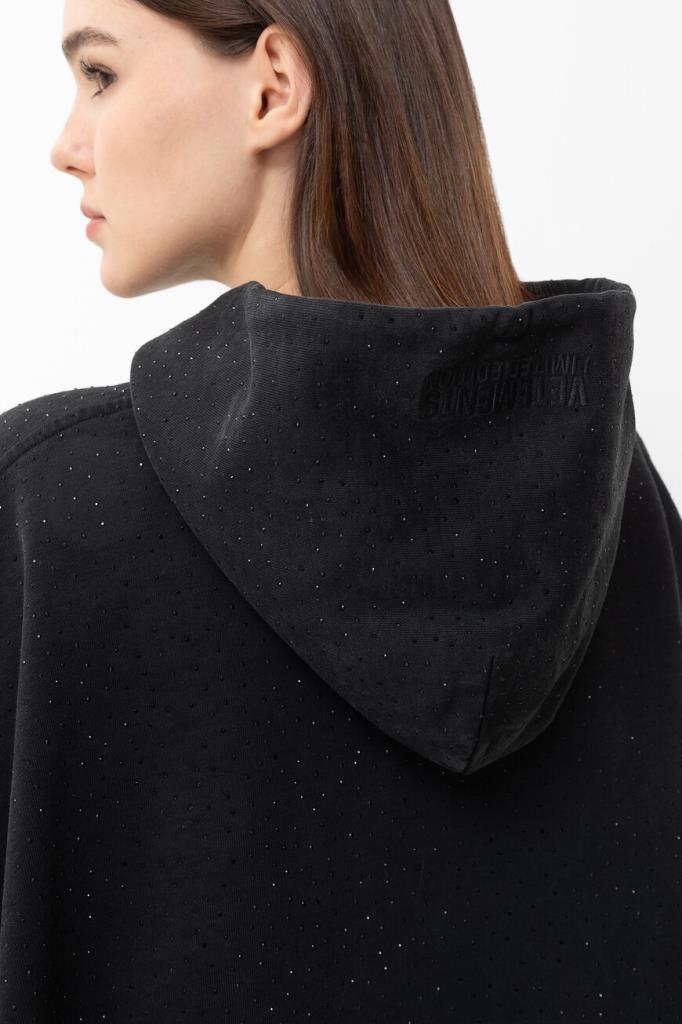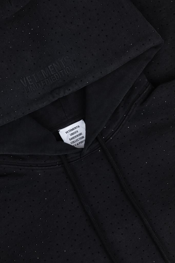 Чёрное худи из мягкого хлопкового джерси от VETEMENTS. Поверхность изделия из лимитированной коллекции Дома декорирована россыпью сияющих страз. Дополнительный комфорт и удобство в носке обеспечивают свободный крой и глубокий капюшон на завязках. Принадлежность худи бренду деликатно обозначена вышитой надписью «VETEMENTS Limited Edition» сзади на капюшоне в тон.