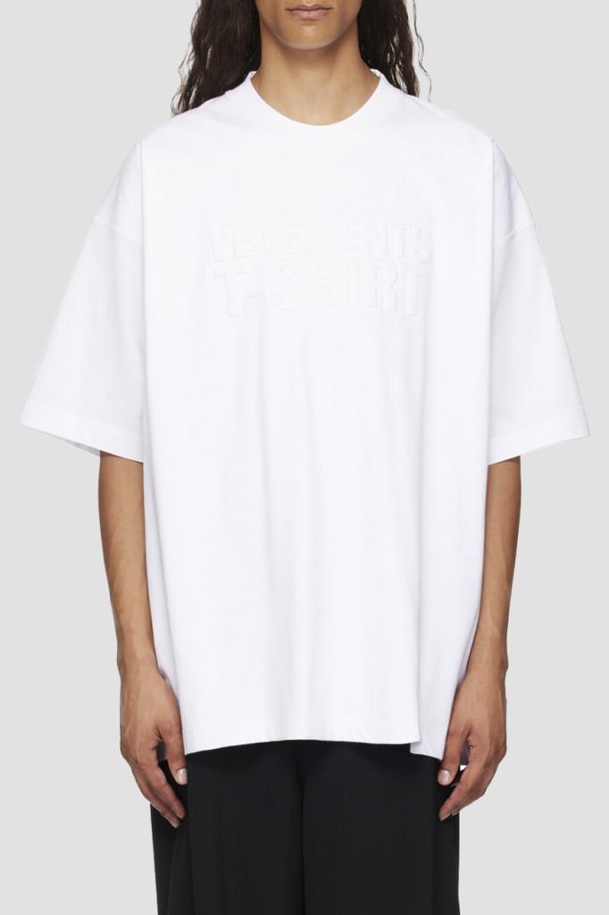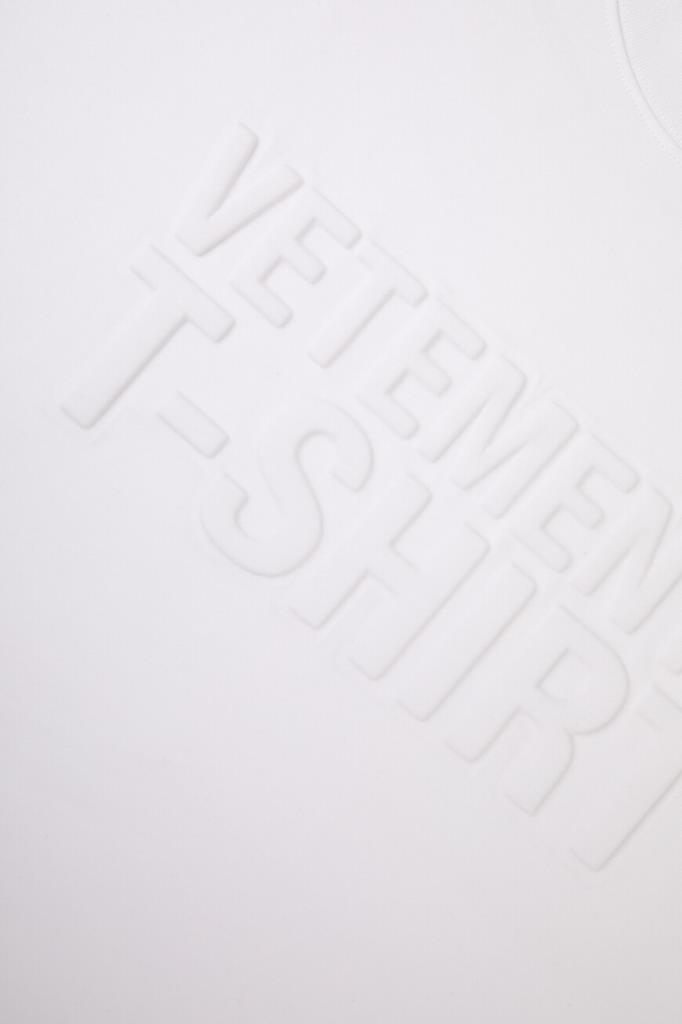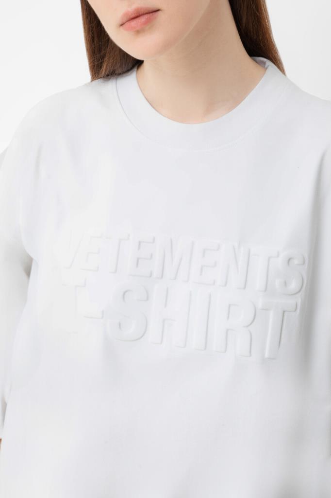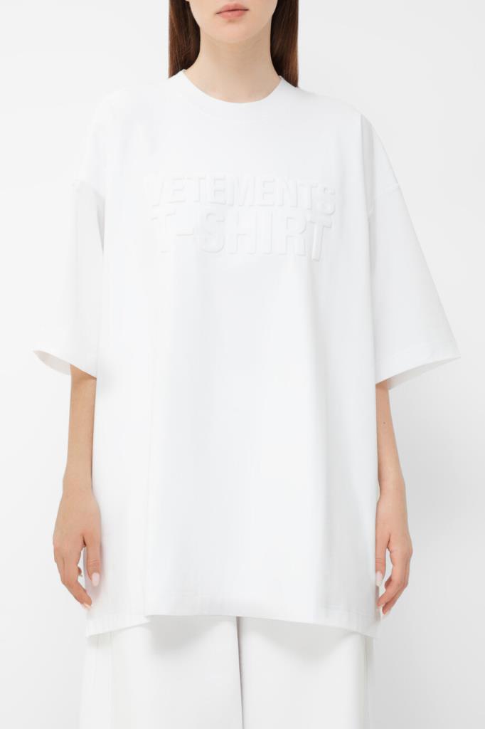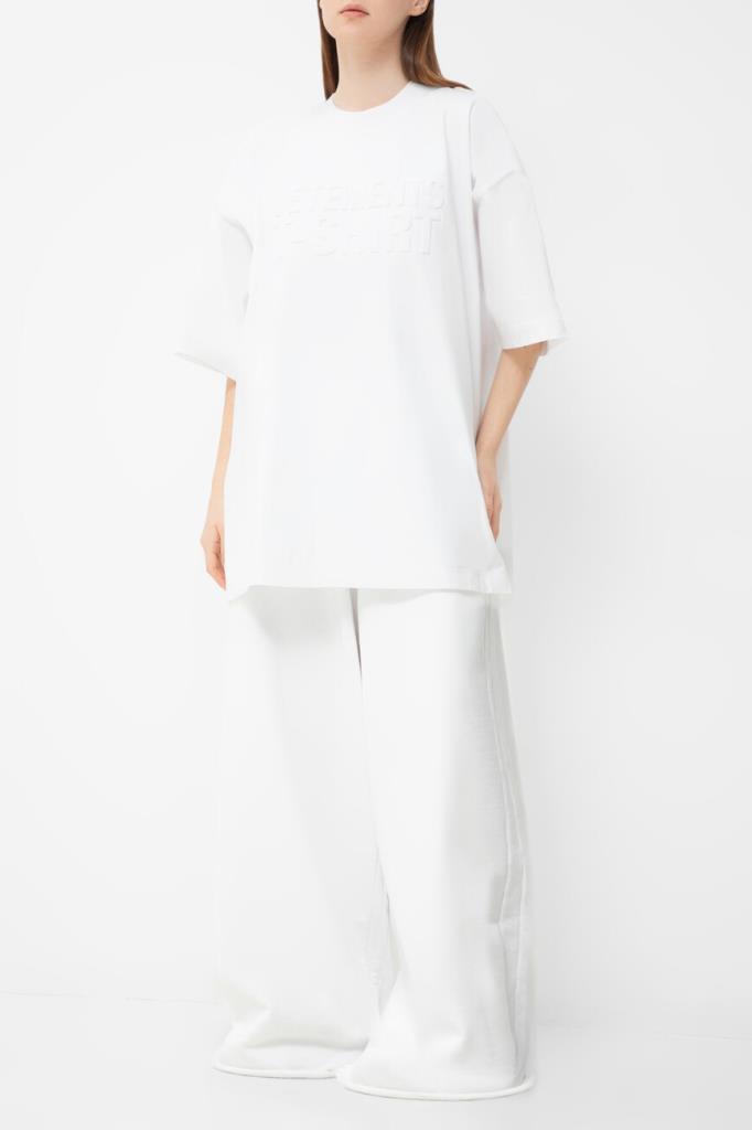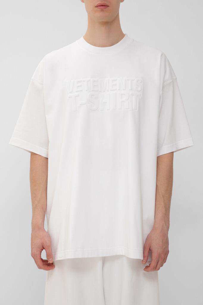 Хлопковая футболка VETEMENTS с крупным рельефным декором. Мягкий материал хорошо пропускает воздух и немного тянется, делая посадку вещи максимально комфортной. Изделие выполнено в белом цвете и дополнено короткими рукавами с приспущенным плечом. Отличительной деталью стала объёмная надпись спереди в тон. Образ можно дополнить широкими брюками на резинке из той же коллекции Дома.