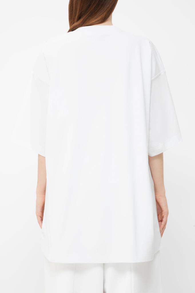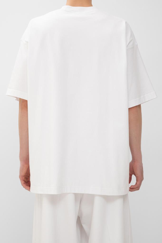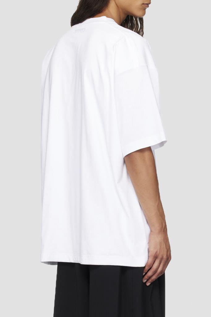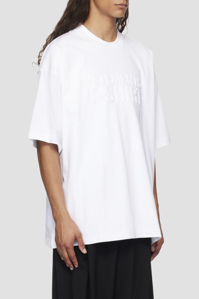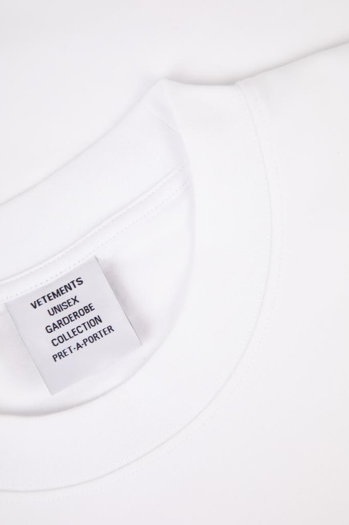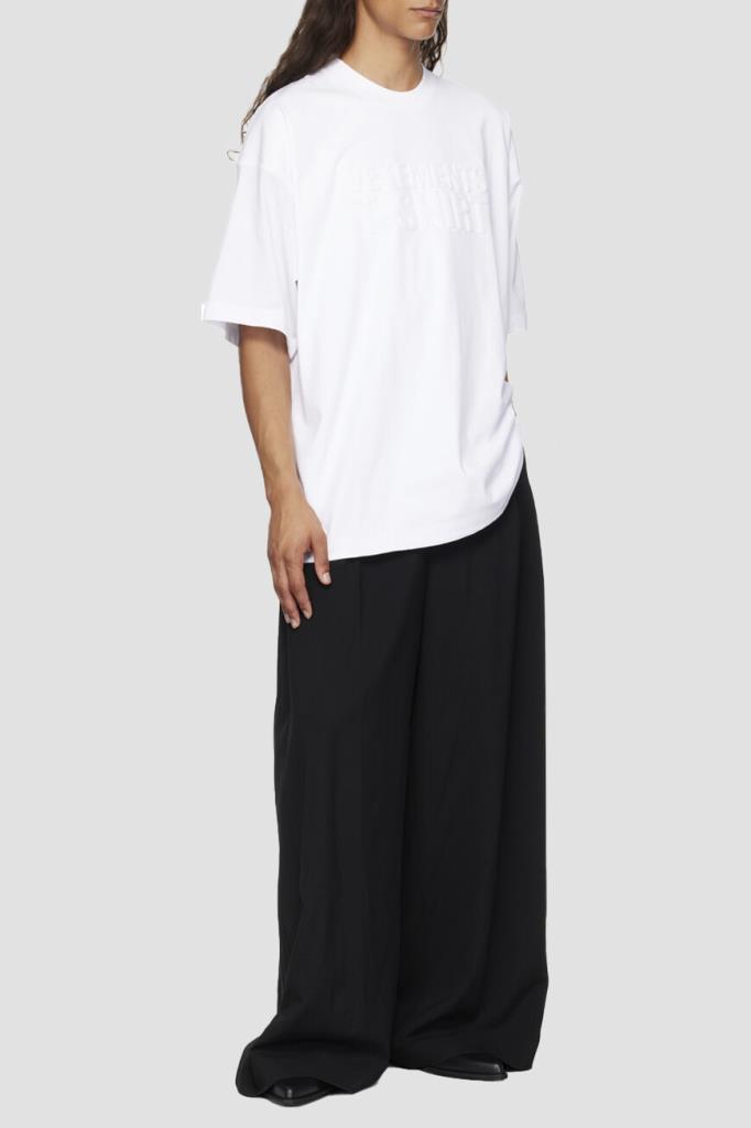 Хлопковая футболка VETEMENTS с крупным рельефным декором. Мягкий материал хорошо пропускает воздух и немного тянется, делая посадку вещи максимально комфортной. Изделие выполнено в белом цвете и дополнено короткими рукавами с приспущенным плечом. Отличительной деталью стала объёмная надпись спереди в тон. Образ можно дополнить широкими брюками на резинке из той же коллекции Дома.