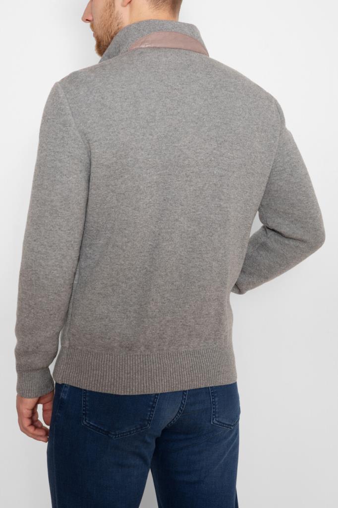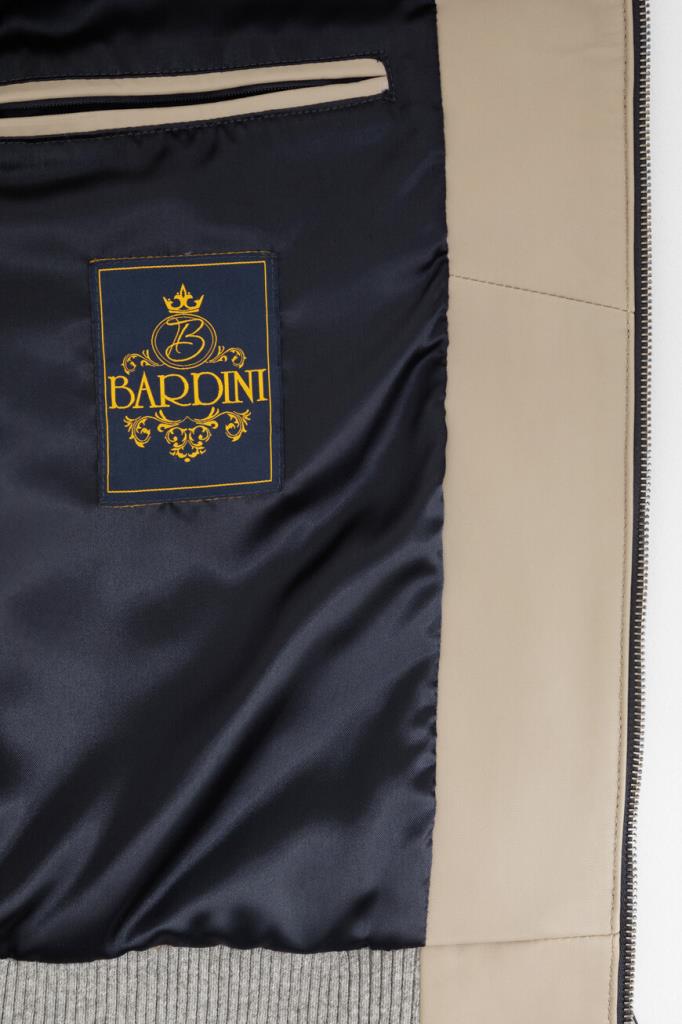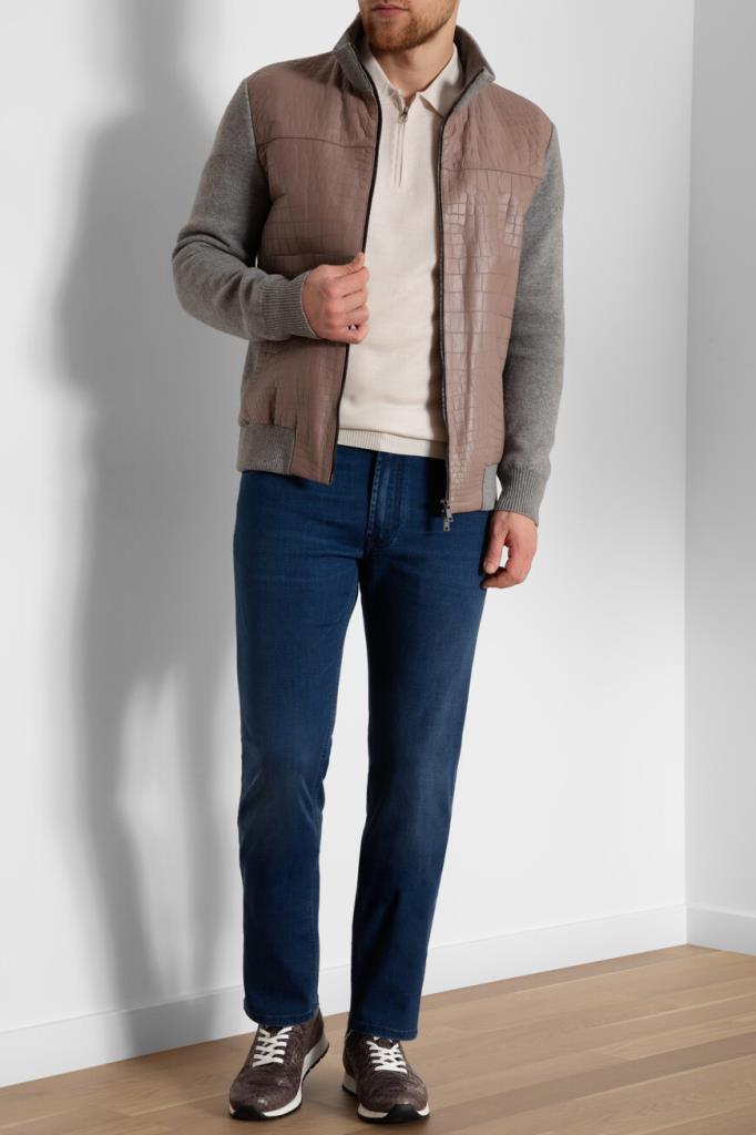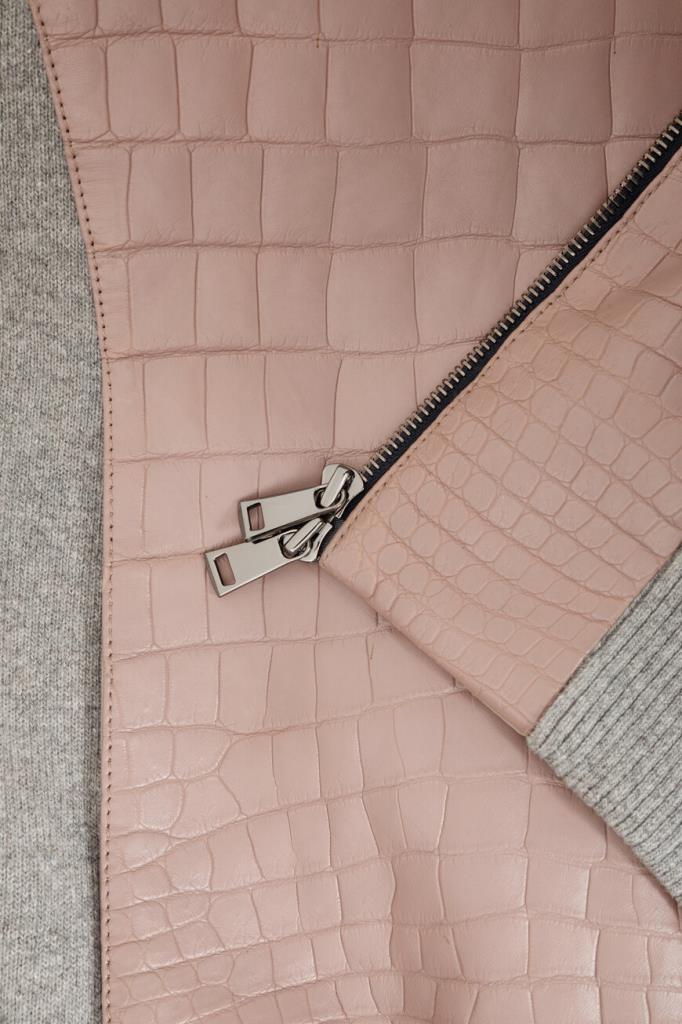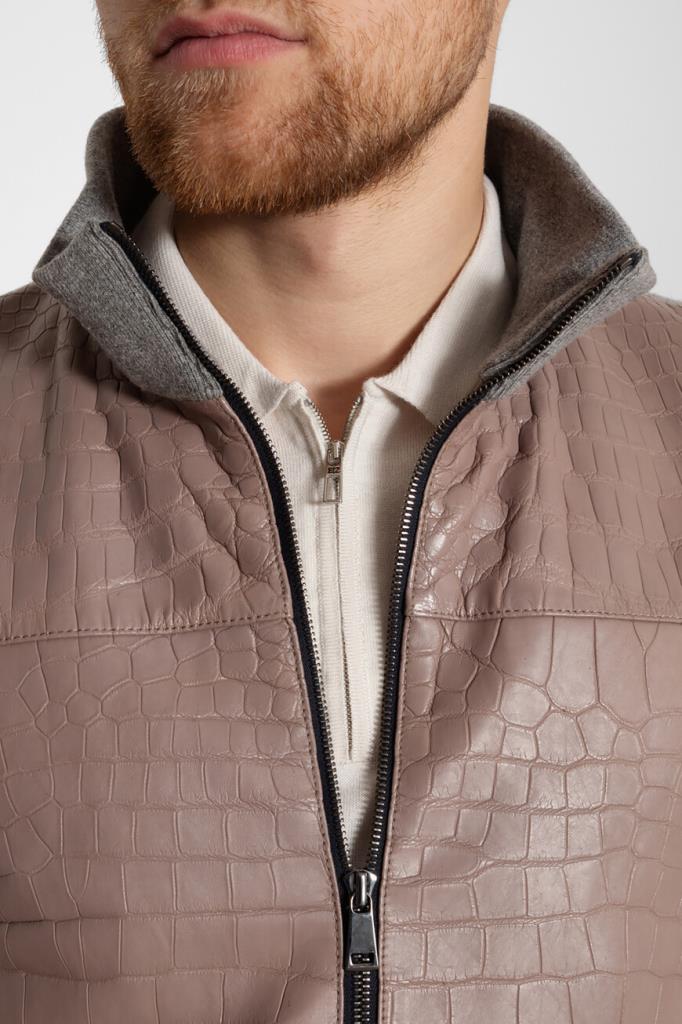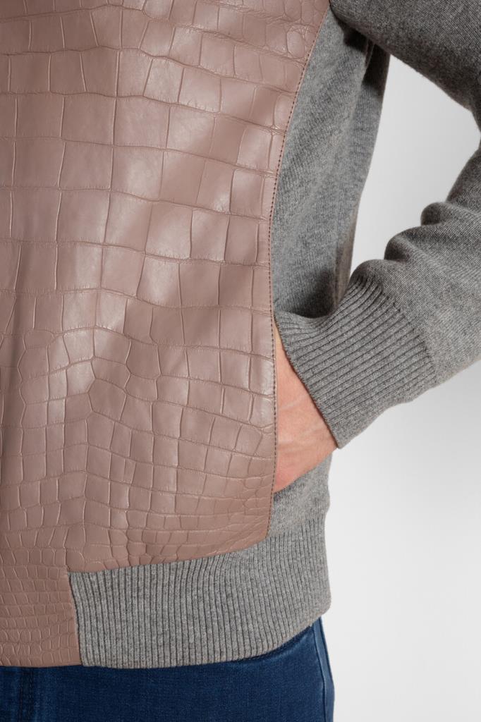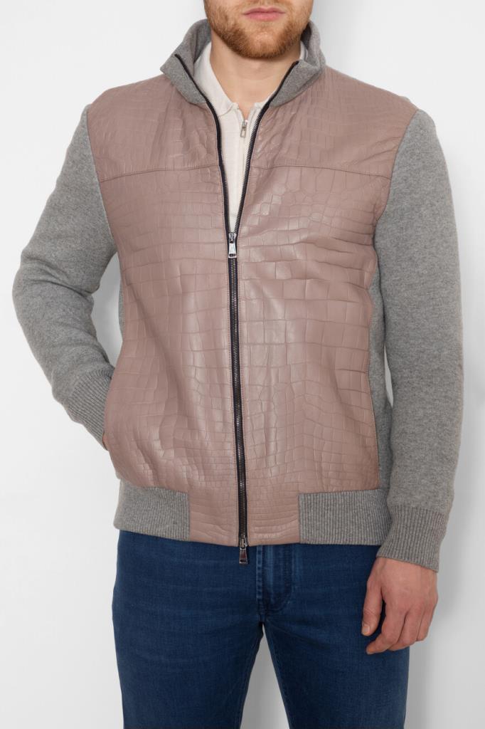 Комбинированная куртка прямого кроя от Bardini. Для создания модели выбран мягкий кашемир серого цвета со светло-коричневыми вставками из натуральной матовой кожи крокодила спереди и на кокетке. Воротник, манжеты и пояс оформлены резинкой.