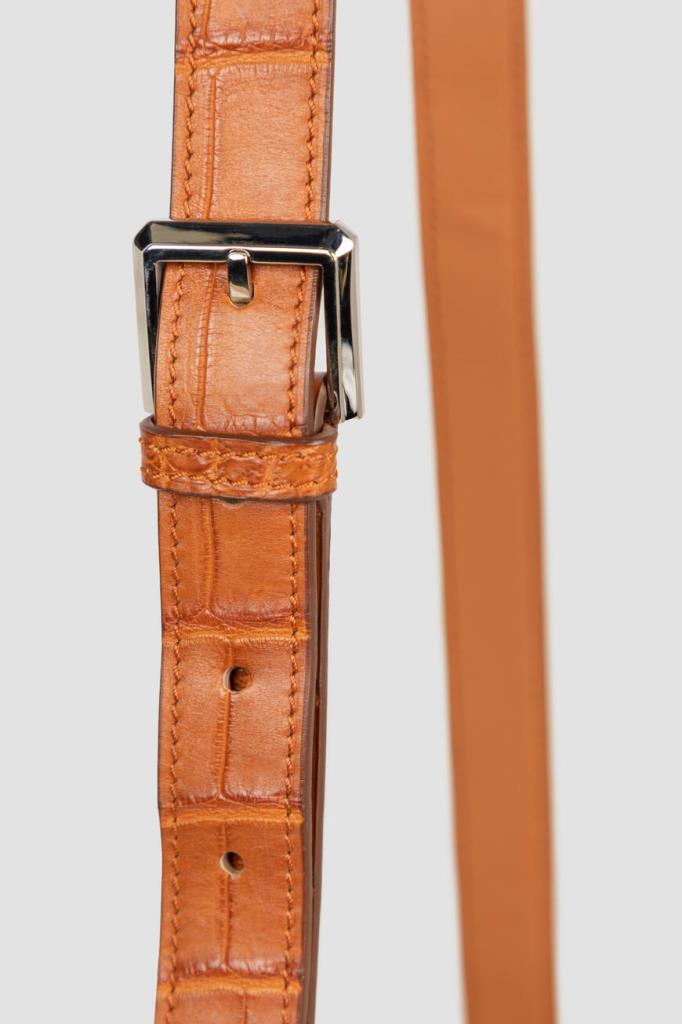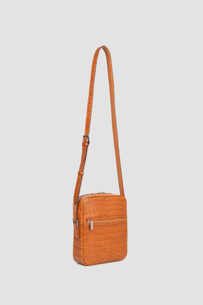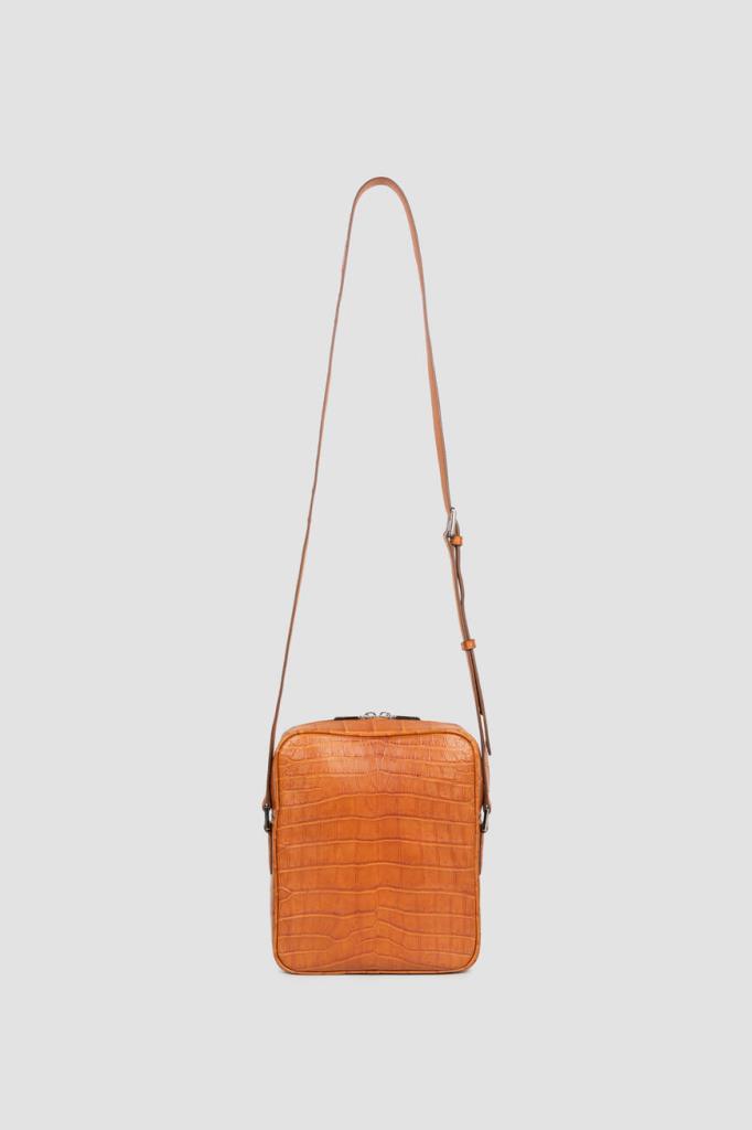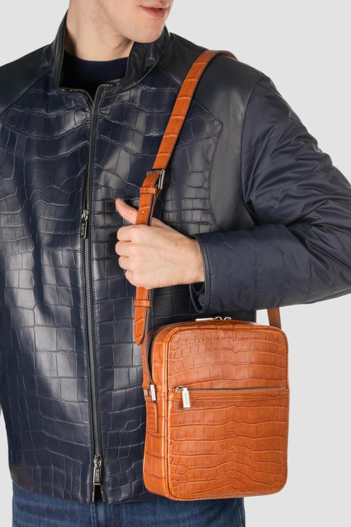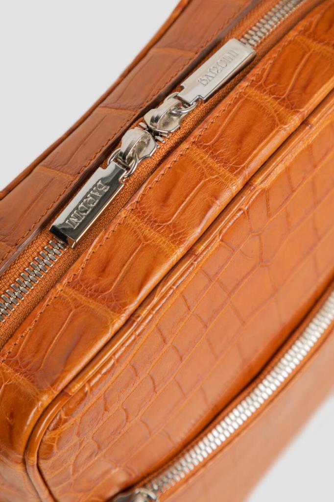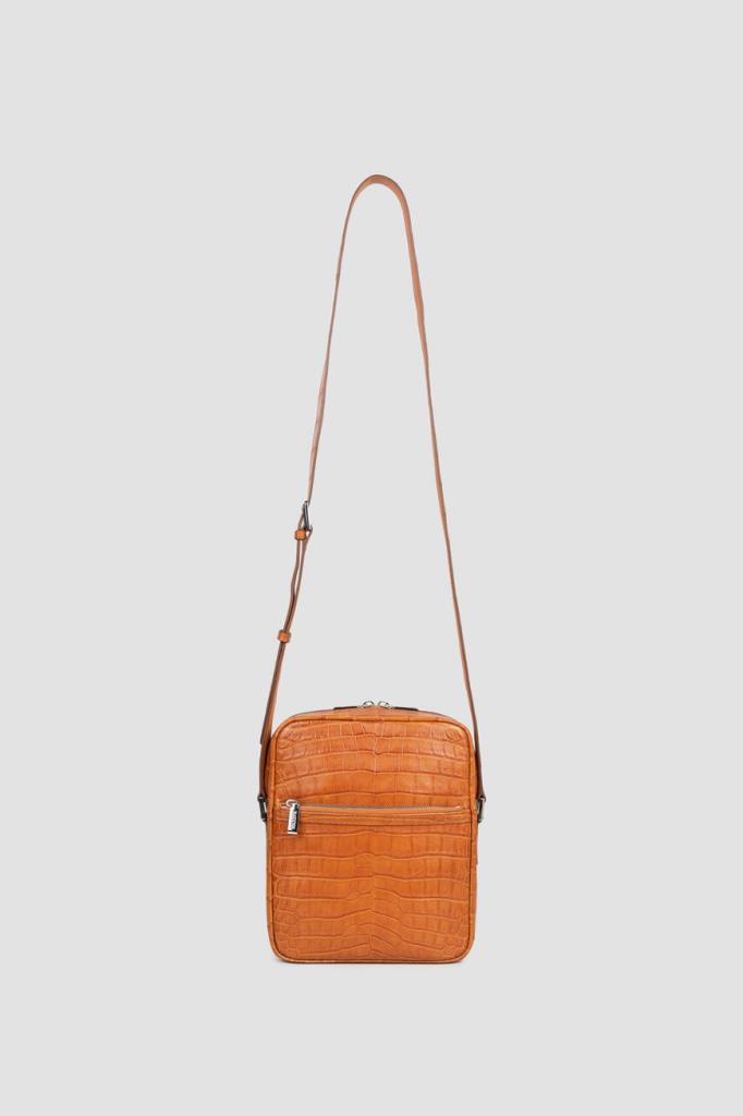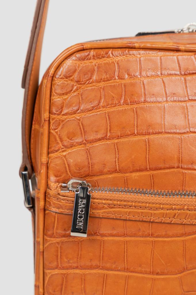 Cумка-мессенджер ручной работы от Bardini. Вместительная модель выполнена из матовой высококачественной кожи крокодила оранжевого оттенка.