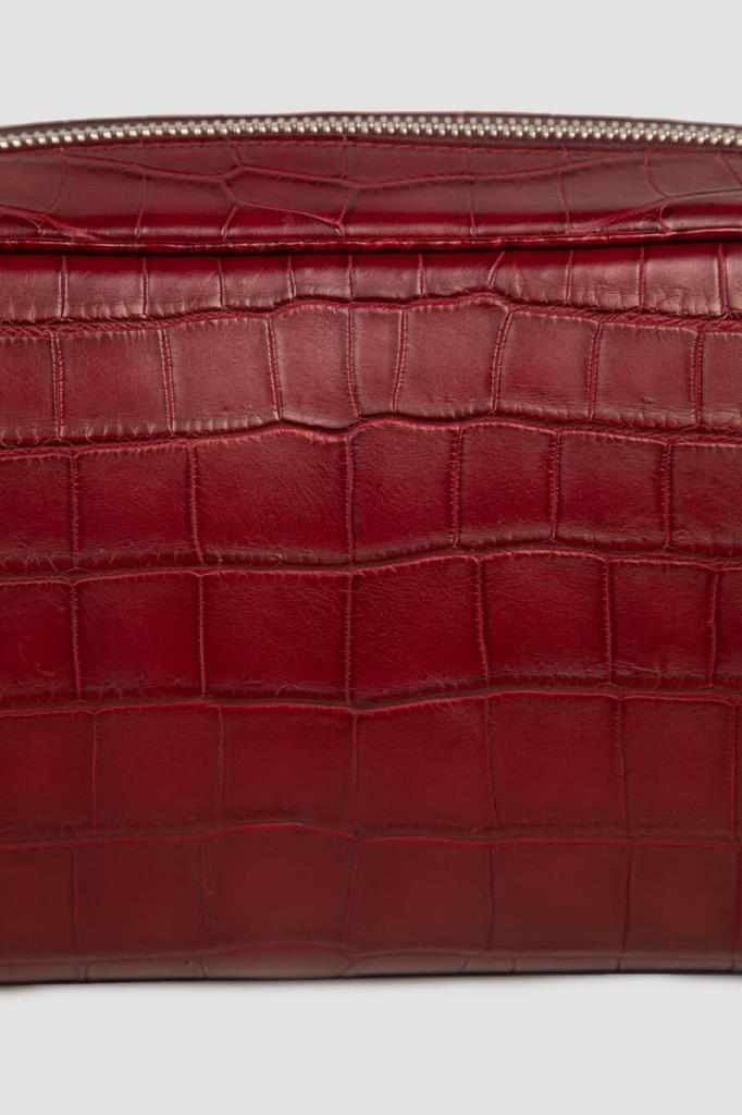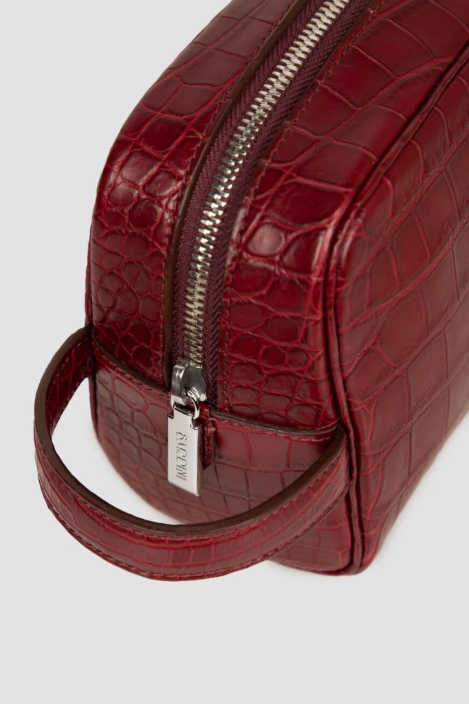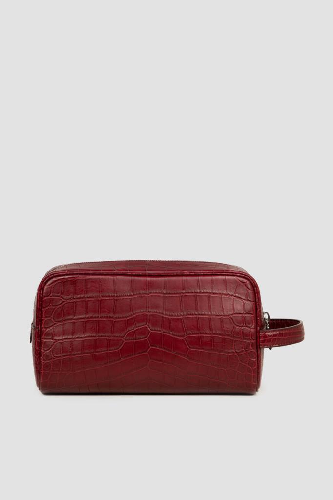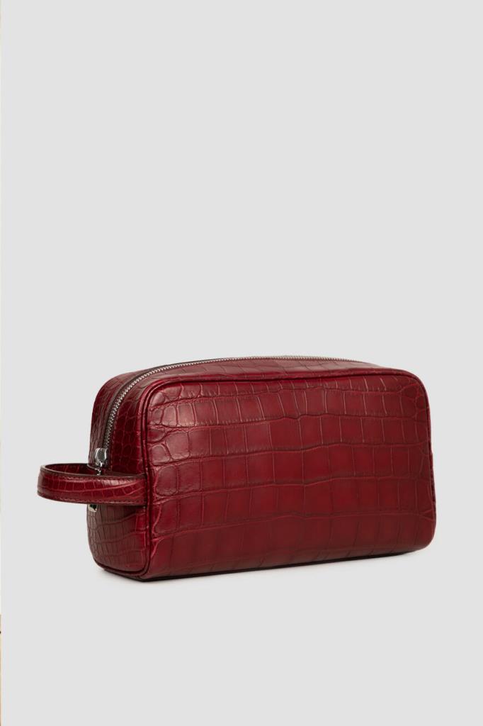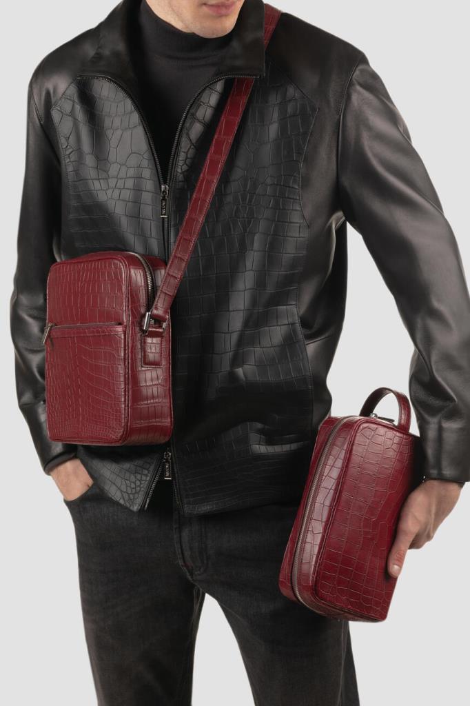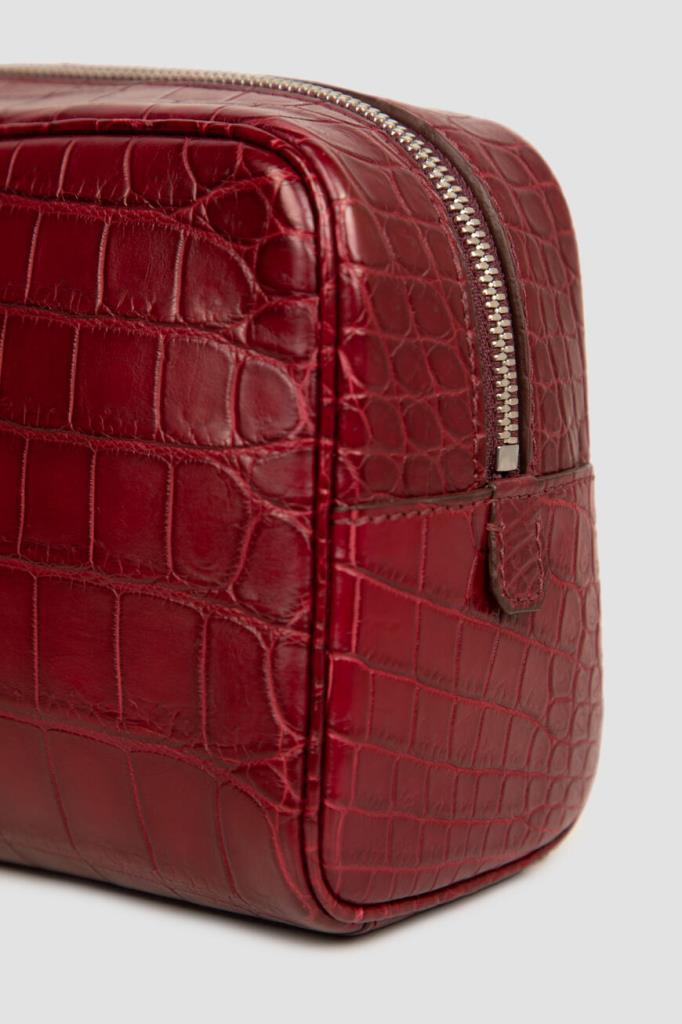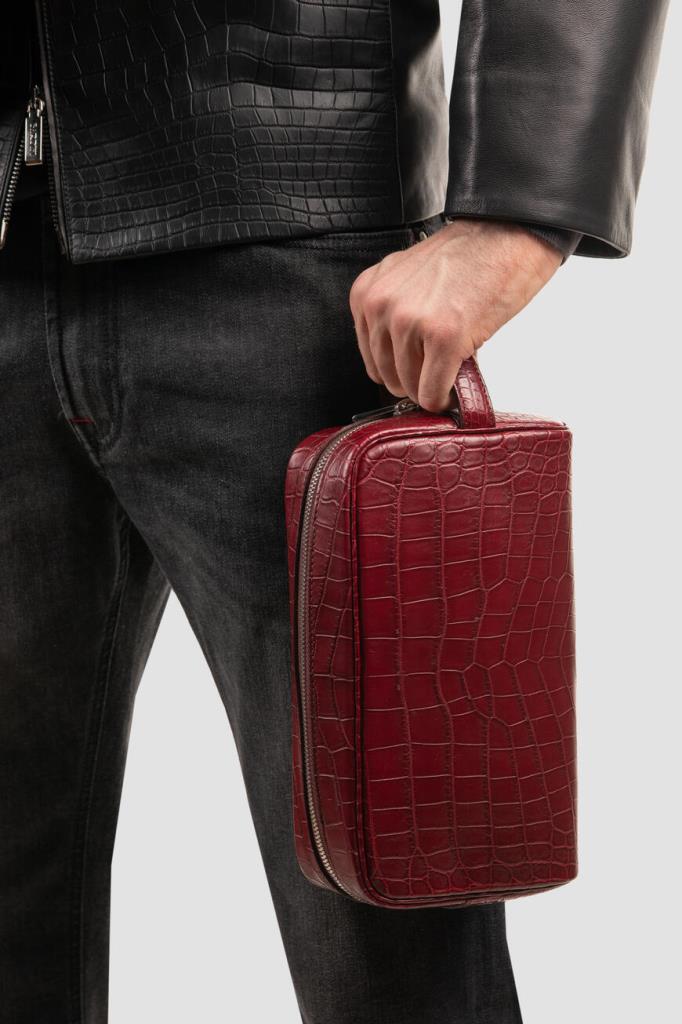 Бордовый несессер из матовой высококачественной кожи крокодила от Bardini. Аксессуар отличается особой прочностью и долговечностью, а дизайн подчёркивает благородный цвет и уникальный рисунок кожи. Модель оснащена объёмным внутренним отделением на молнии и тремя потайными карманами, один из которых прорезной на молнии, а два других накладные и без застёжки.