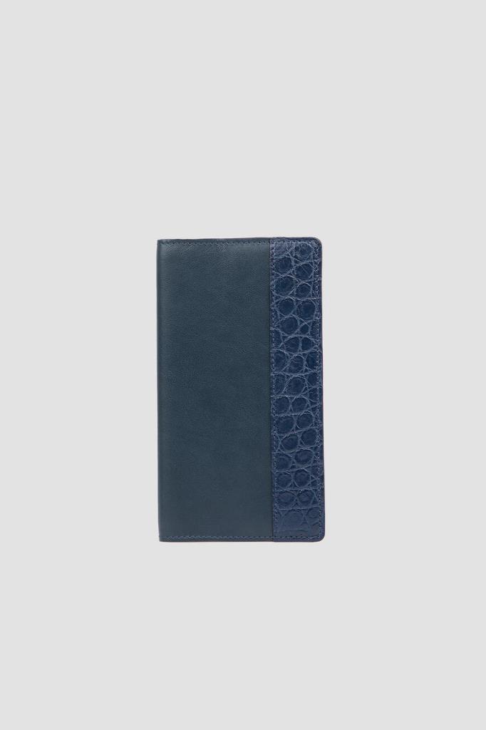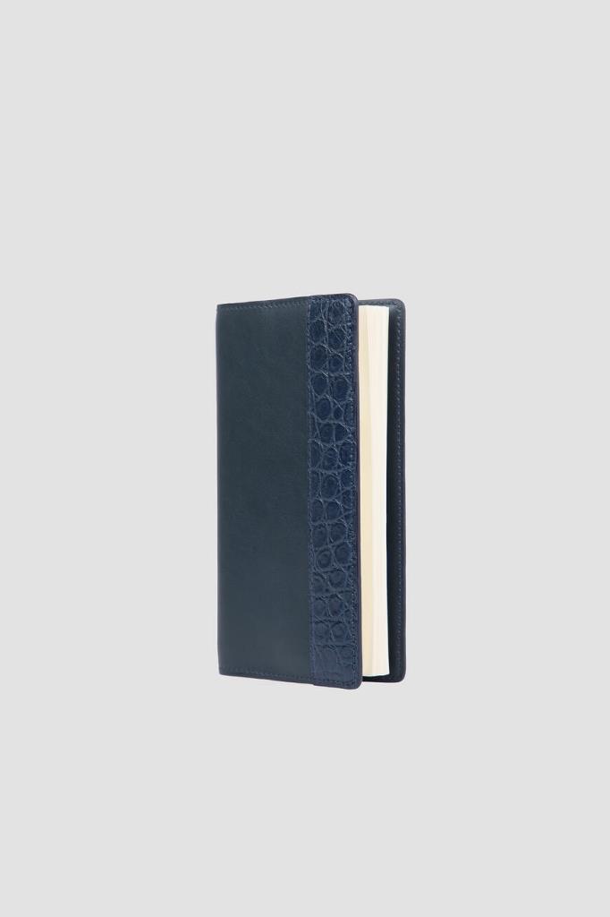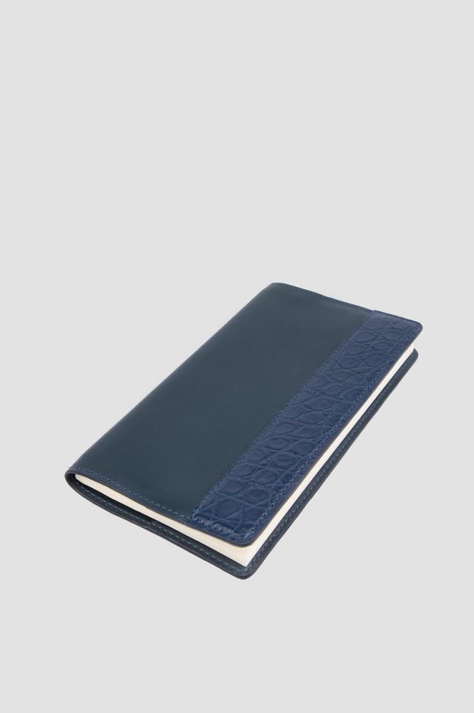 Обложка для ежедневника от Bardini. Тёмно-синяя модель оптимального размера выполнена из натуральной кожи телёнка. Декор: вставка из матовой высококачественной кожи крокодила спереди в тон.