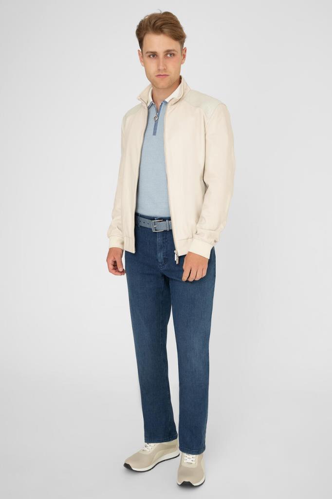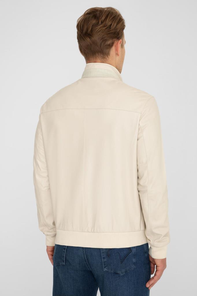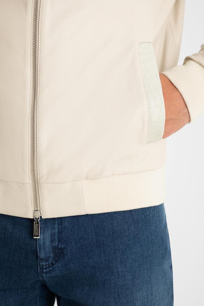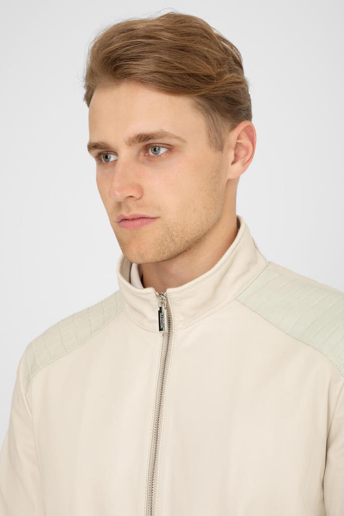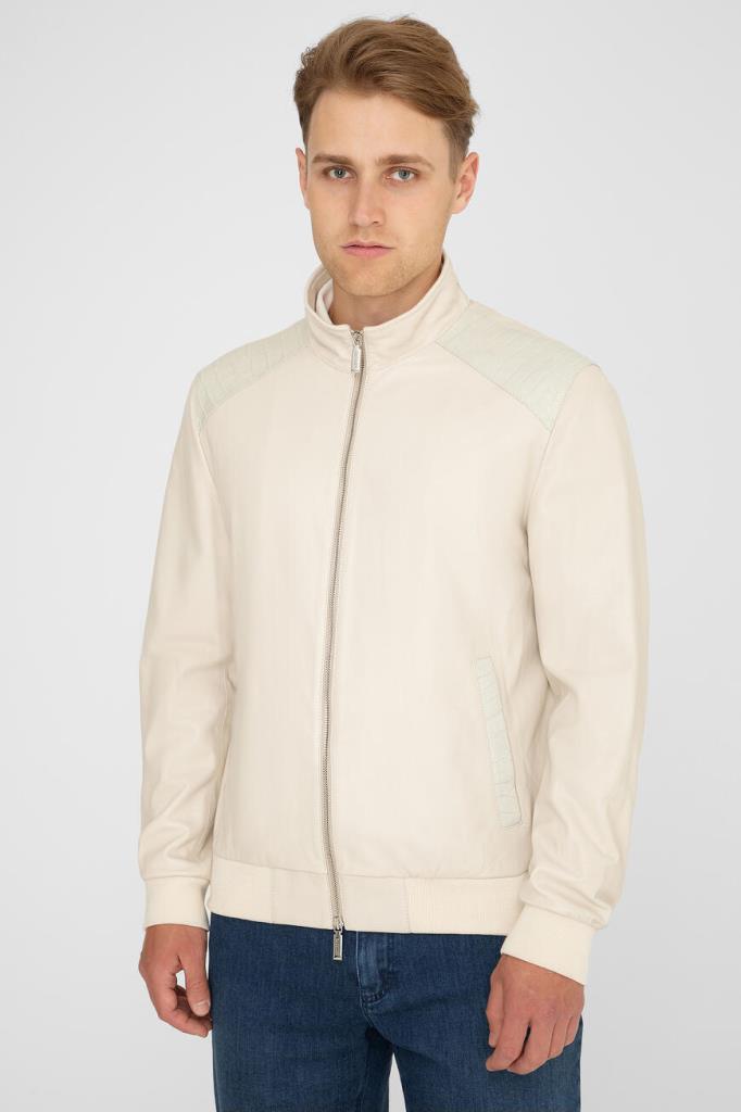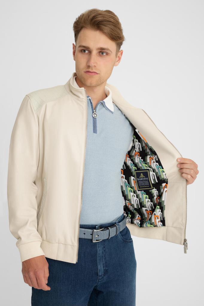 Роскошная куртка ручной работы от Bardini. Стильная комбинированная модель в изысканном оттенке экрю: передняя и задняя стенки изделия и рукава выполнены из мягкой гладкой кожи телёнка со вставками из натуральной высококачественной кожи крокодила на карманах (отделка), спереди на уровне плеч и сзади на воротнике в тон. Лаконичный и удобный фасон на чёрной шелковой подкладке с ярким геометрическим узором с эффектом наложения делает куртку невероятно мягкой и удобной. Вместительные карманы выступают идеальным завершением дизайна и соответствуют требованиям стремительной городской жизни.