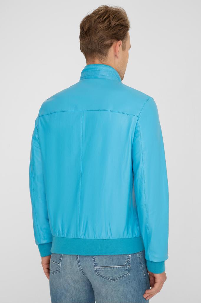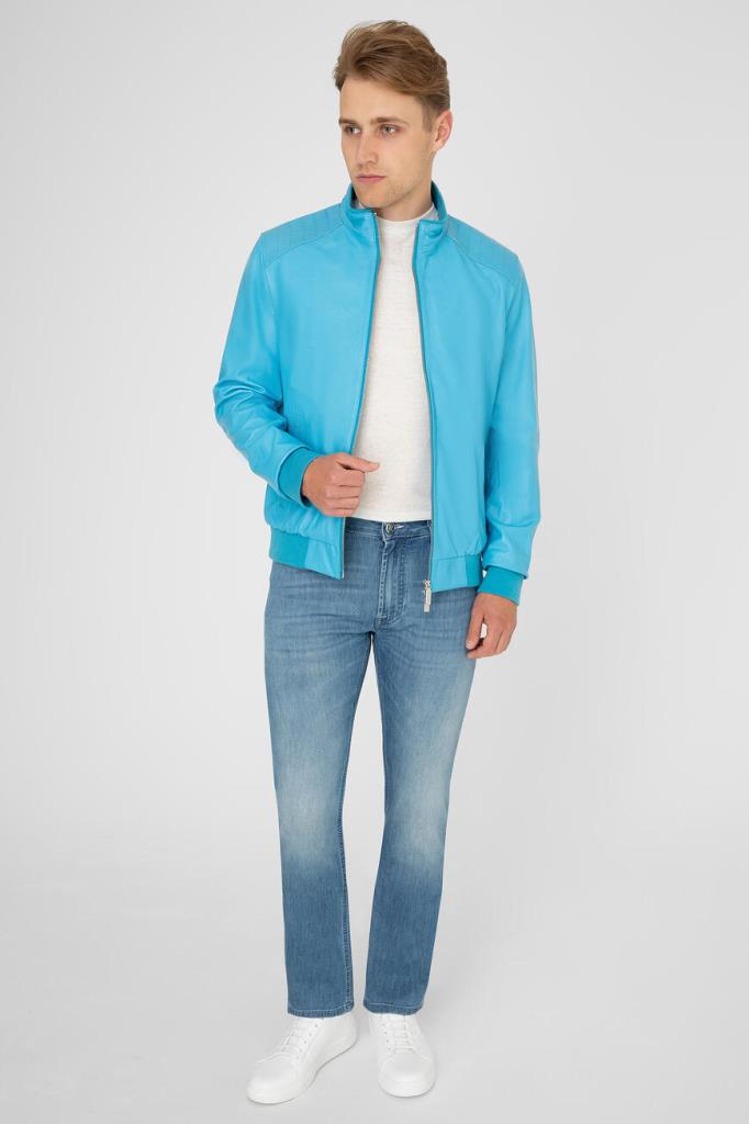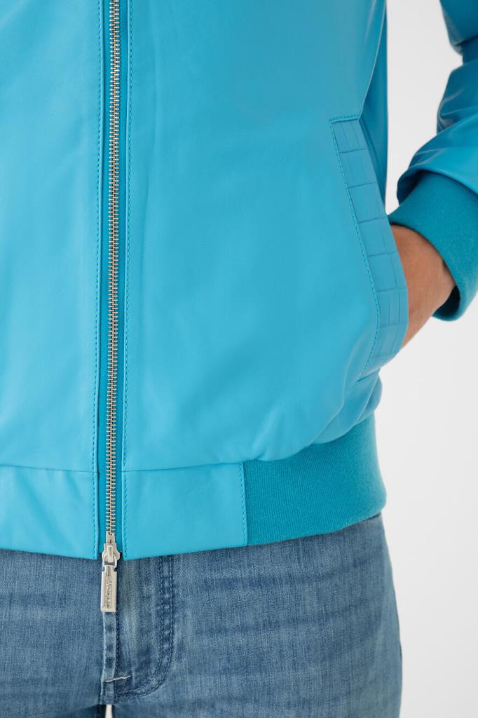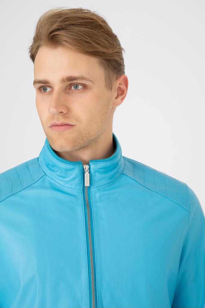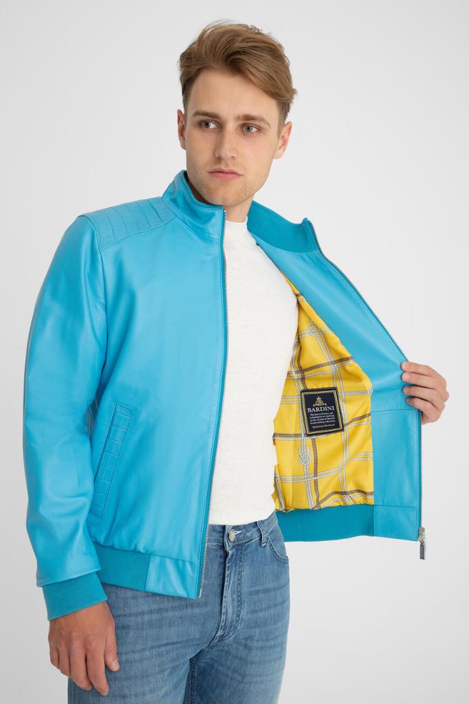 Роскошная куртка ручной работы от Bardini. Стильная комбинированная модель изысканного голубого оттенка: передняя и задняя стенки изделия и рукава выполнены из мягкой гладкой кожи телёнка со вставками из натуральной высококачественной кожи крокодила на карманах (отделка), спереди на уровне плеч и сзади на воротнике в тон. Лаконичный и удобный фасон на ярко-жёлтой шелковой подкладке с бело-коричневым верёвочным узором делает куртку невероятно мягкой и удобной. Вместительные карманы выступают идеальным завершением дизайна и соответствуют требованиям стремительной городской жизни.