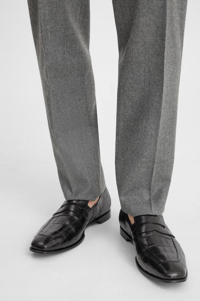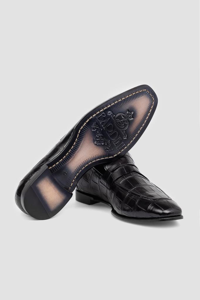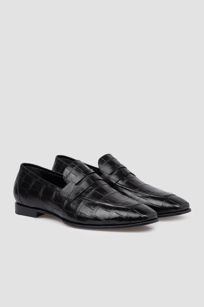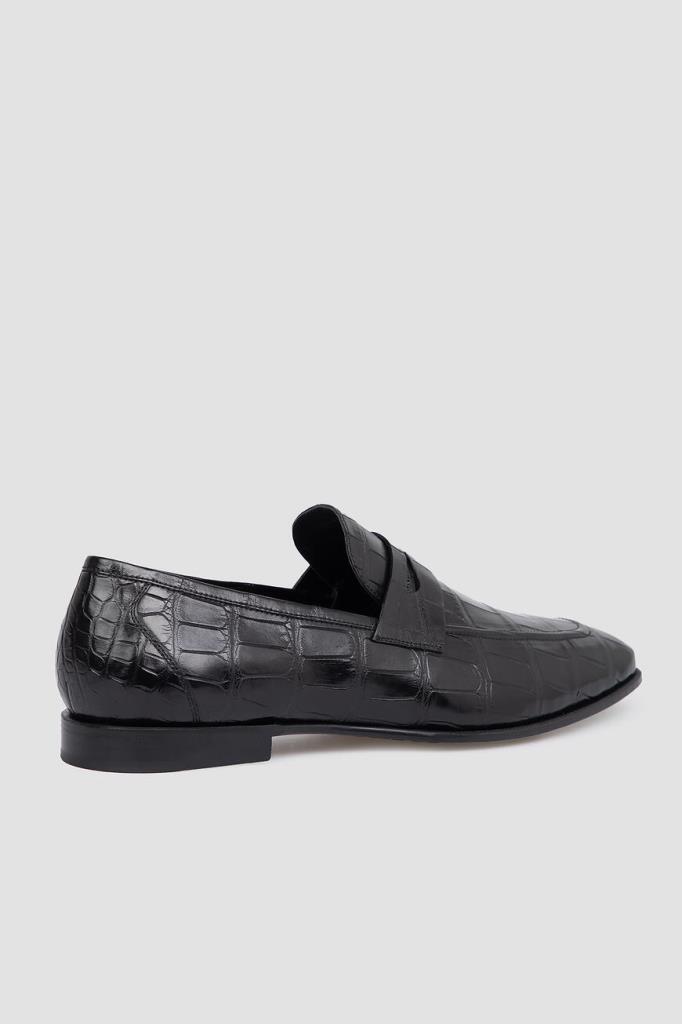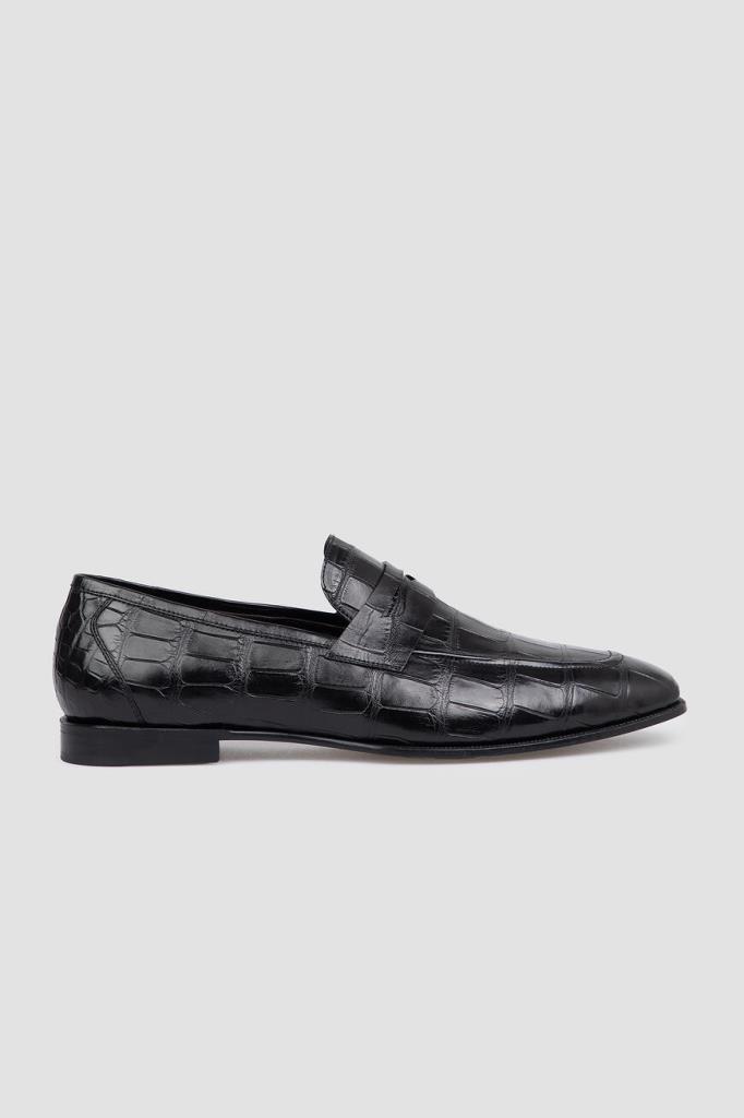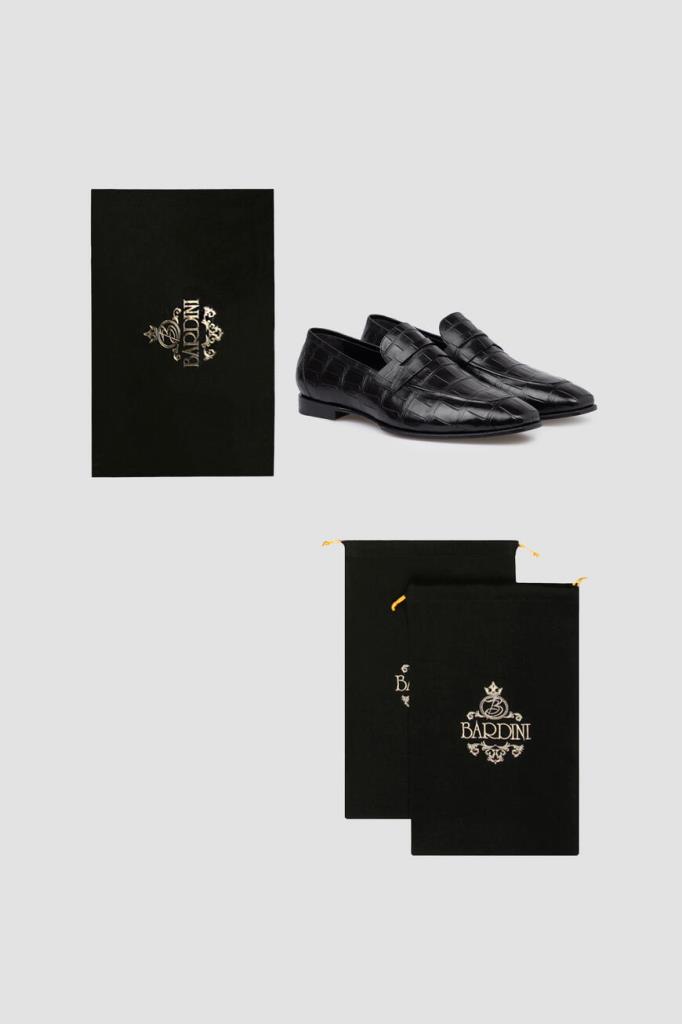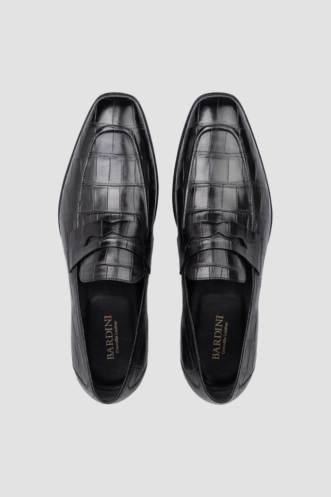 Лоферы Bardini на широком наборном каблуке. Изделие ручной работы выполнено из мягкой кожи нильского крокодила базового чёрного цвета. Уникальный экзотический рисунок материала подчёркивает элегантный силуэт. Отличительной деталью является классический поперечный ремешок с прорезью на союзке.