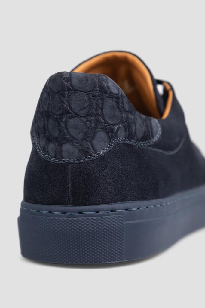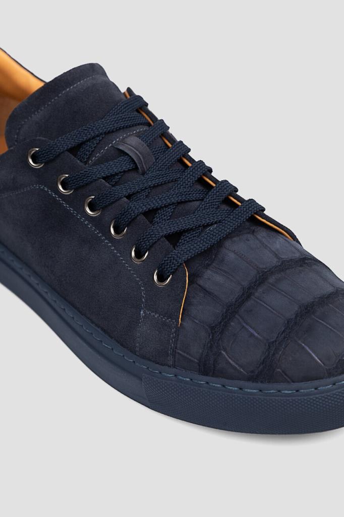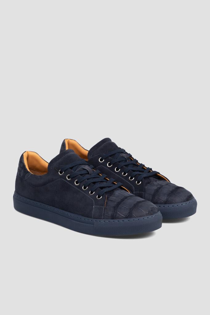 Тёмно-синие кеды Bardini с широкой колодкой. Модель из мягкой бархатистой замши отличается открытой перекрёстной шнуровкой и вставками из фактурной матовой кожи крокодила на носке и заднике в тон. Изделие ручной работы завершит Ваш образ интересной нотой.