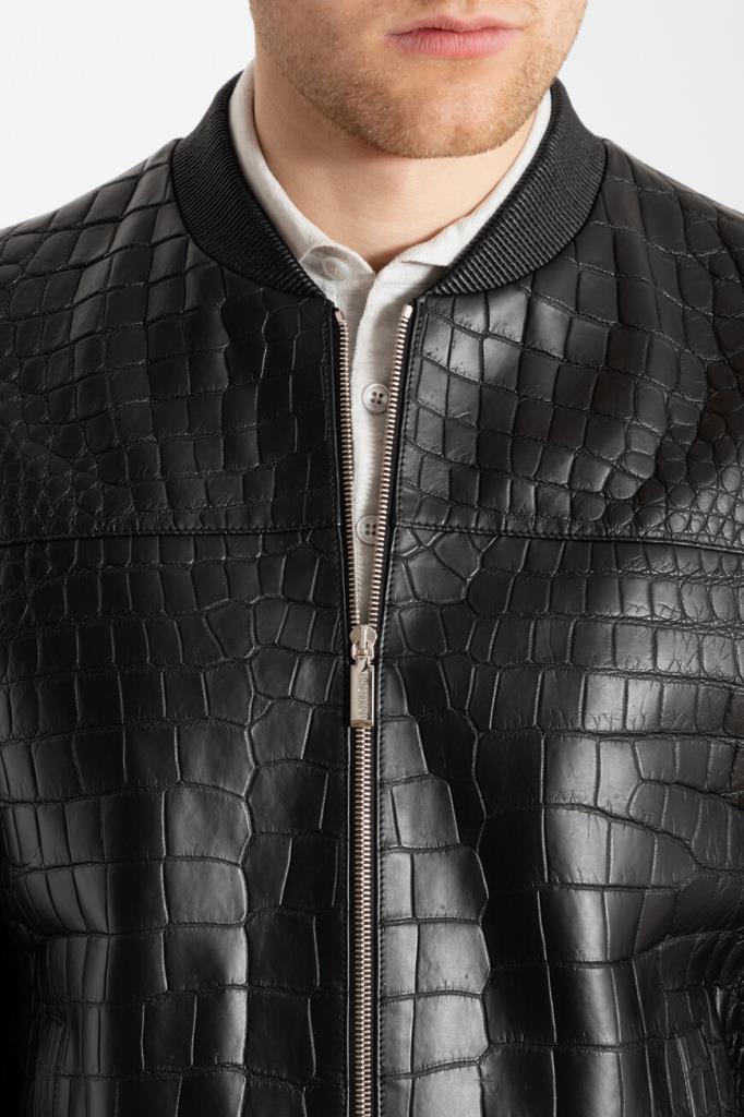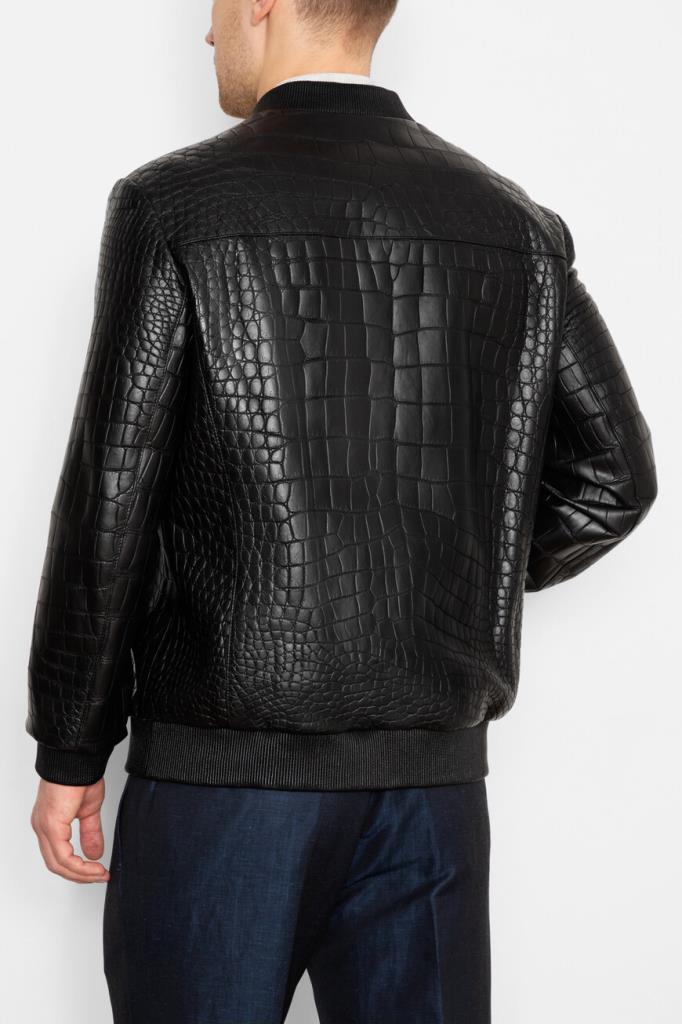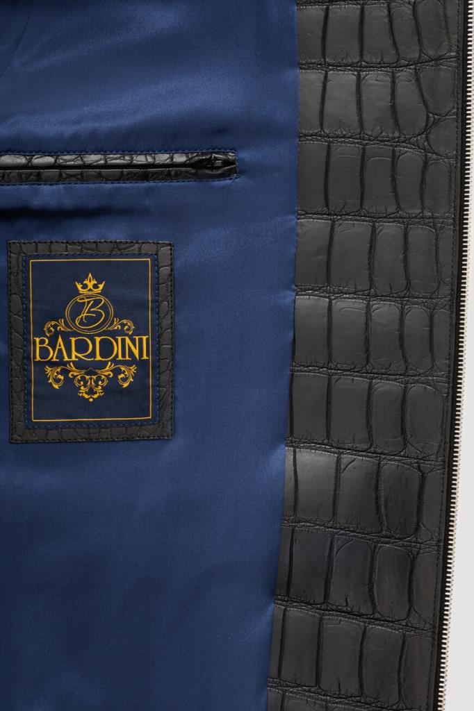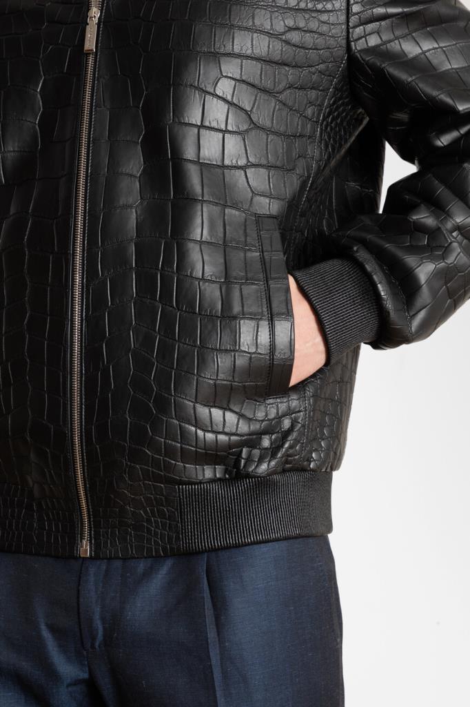 Куртка из фактурной кожи крокодила чёрного цвета от Bardini. Изделие выполнено вручную по уникальной технологии, что делает его очень мягким и удобным. Повседневная модель застёгивается на серебристую молнию с брендированным бегунком. Невысокий воротник-стойка, манжеты и пояс подобраны на резинку.