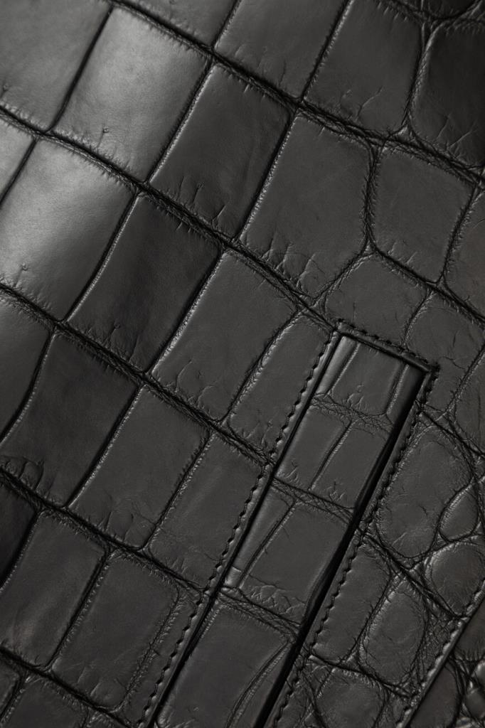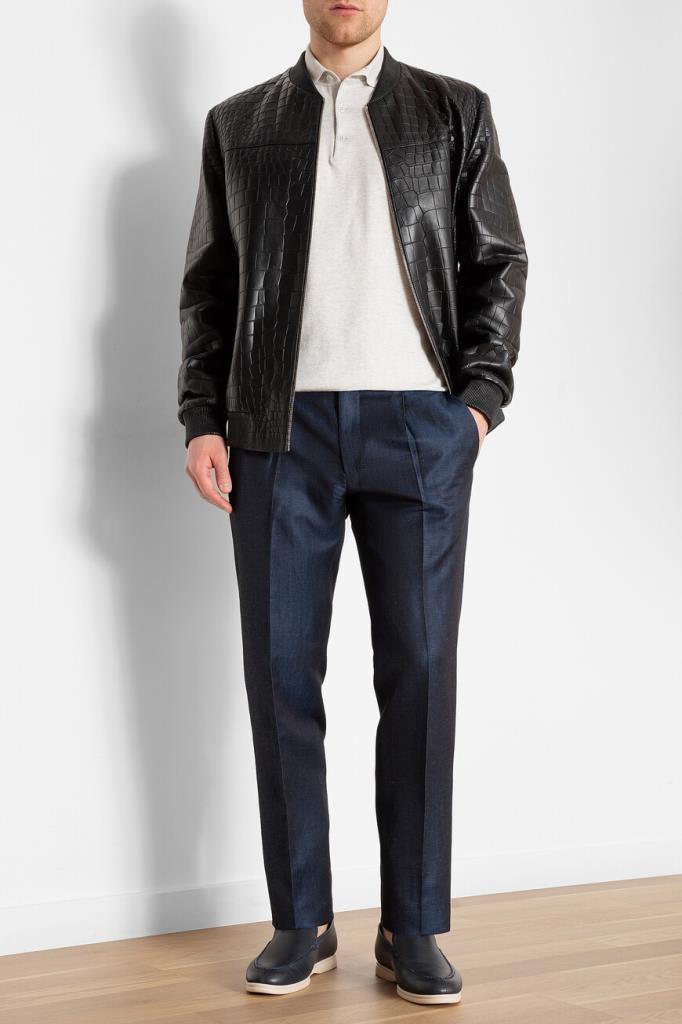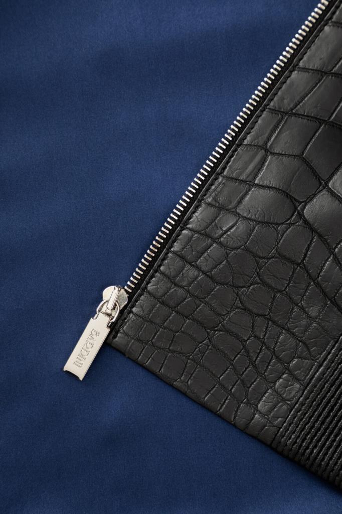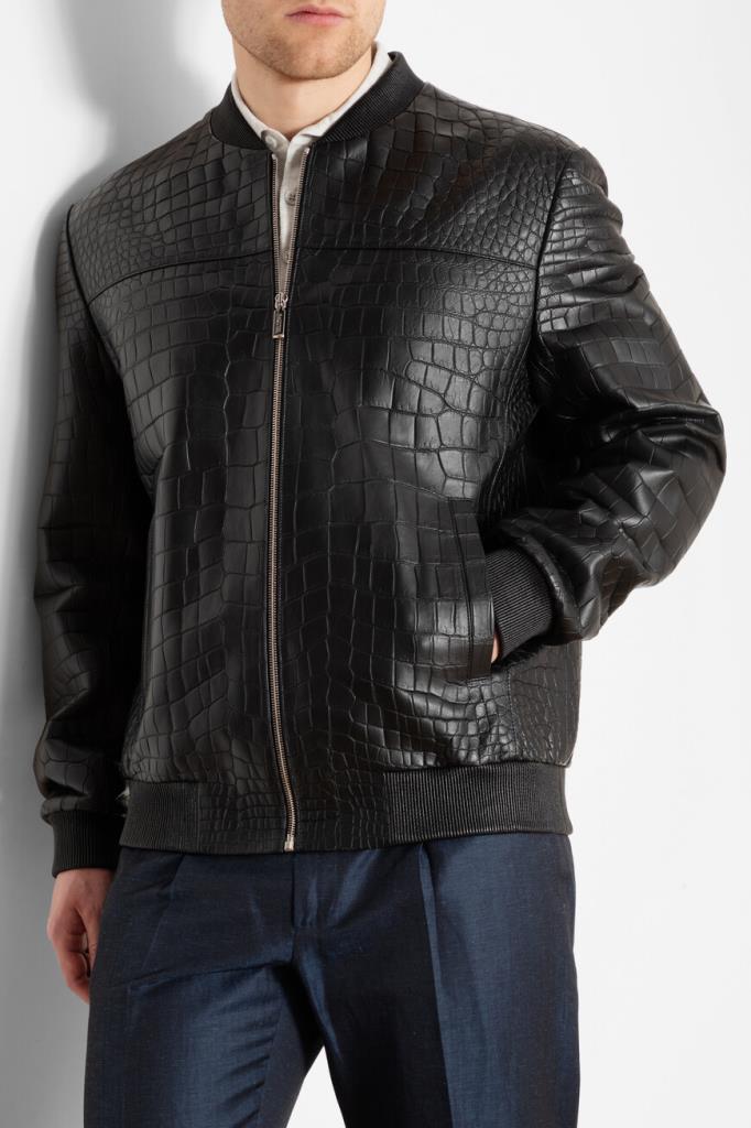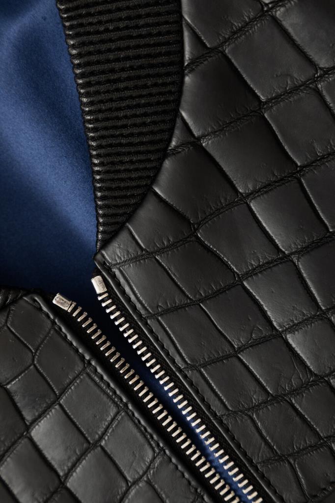 Куртка из фактурной кожи крокодила чёрного цвета от Bardini. Изделие выполнено вручную по уникальной технологии, что делает его очень мягким и удобным. Повседневная модель застёгивается на серебристую молнию с брендированным бегунком. Невысокий воротник-стойка, манжеты и пояс подобраны на резинку.