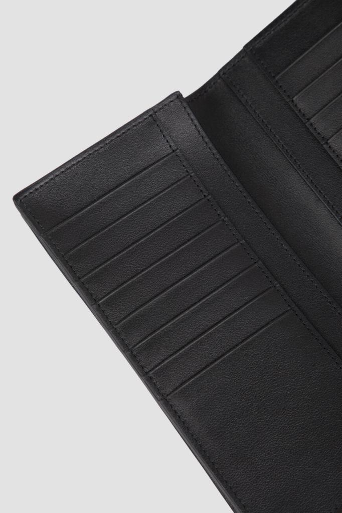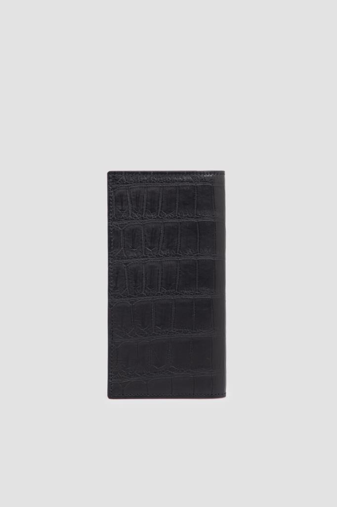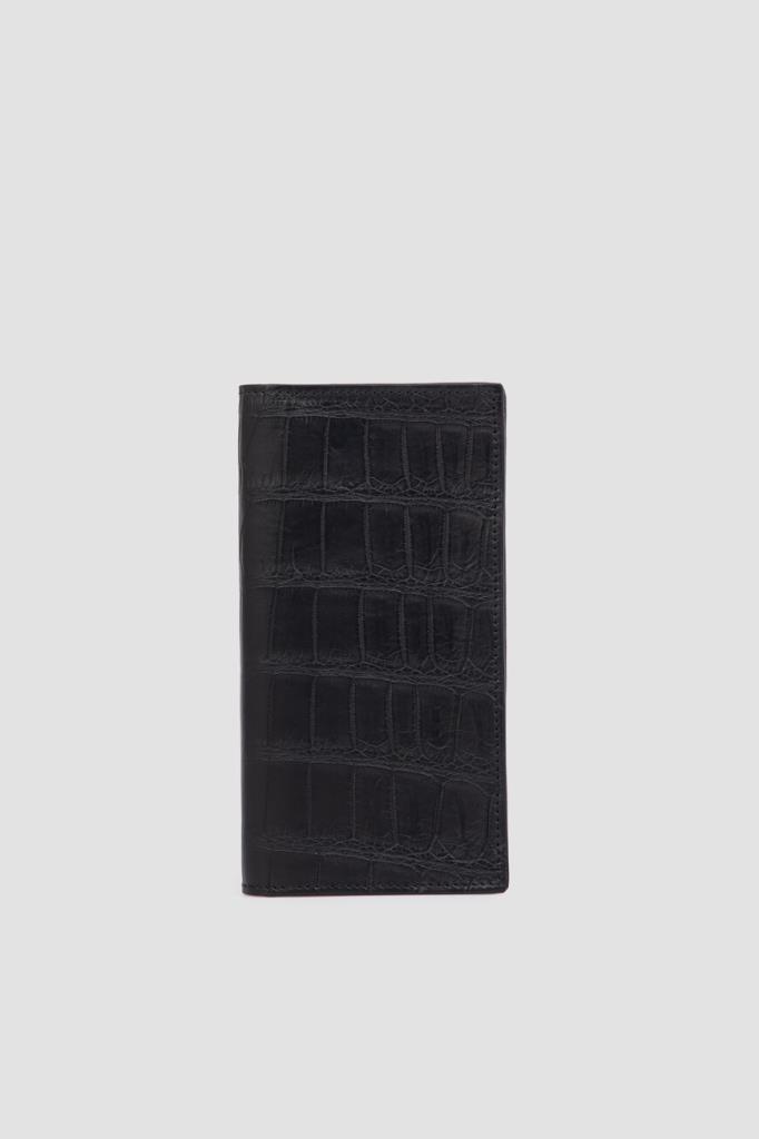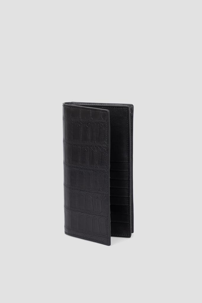 Портмоне из фактурной матовой кожи крокодила от Bardini. Изделие выполнено в чёрном цвете. Отличительными особенностями вместительной модели стали 16 слотов для пластиковых карт и четыре дополнительных внутренних кармана.