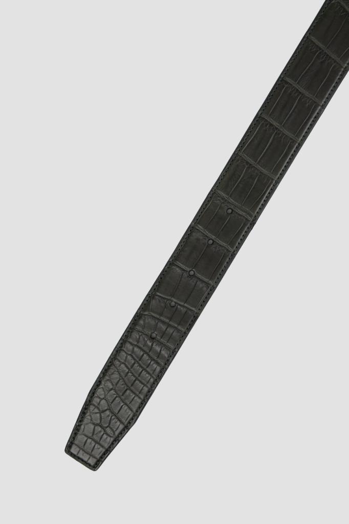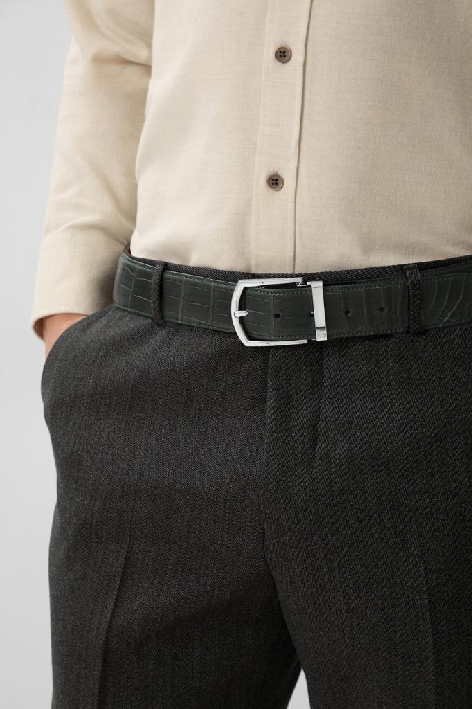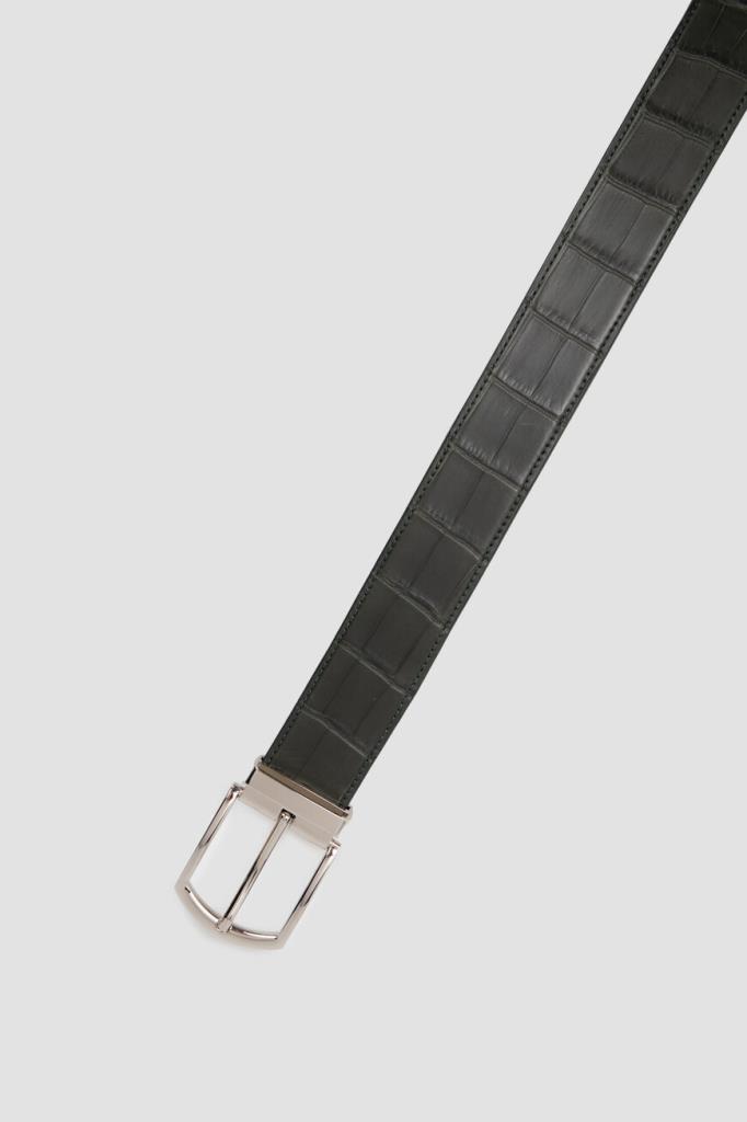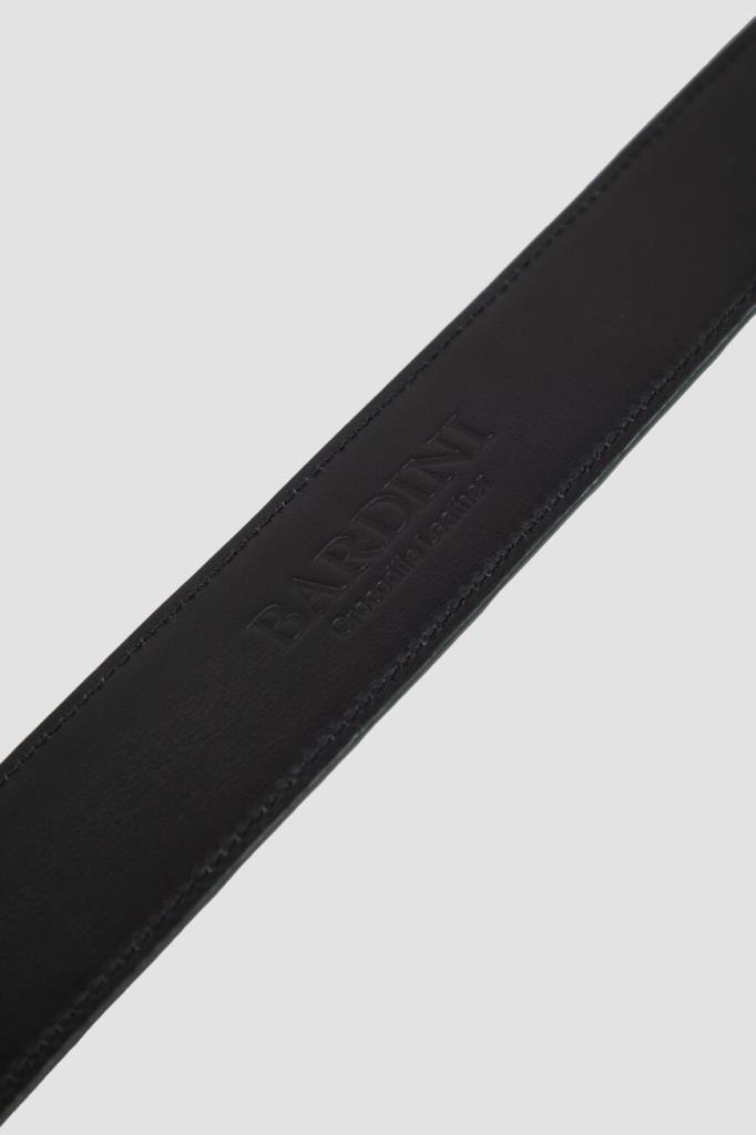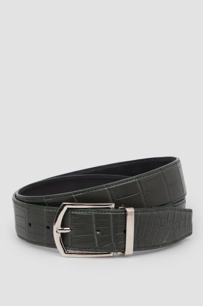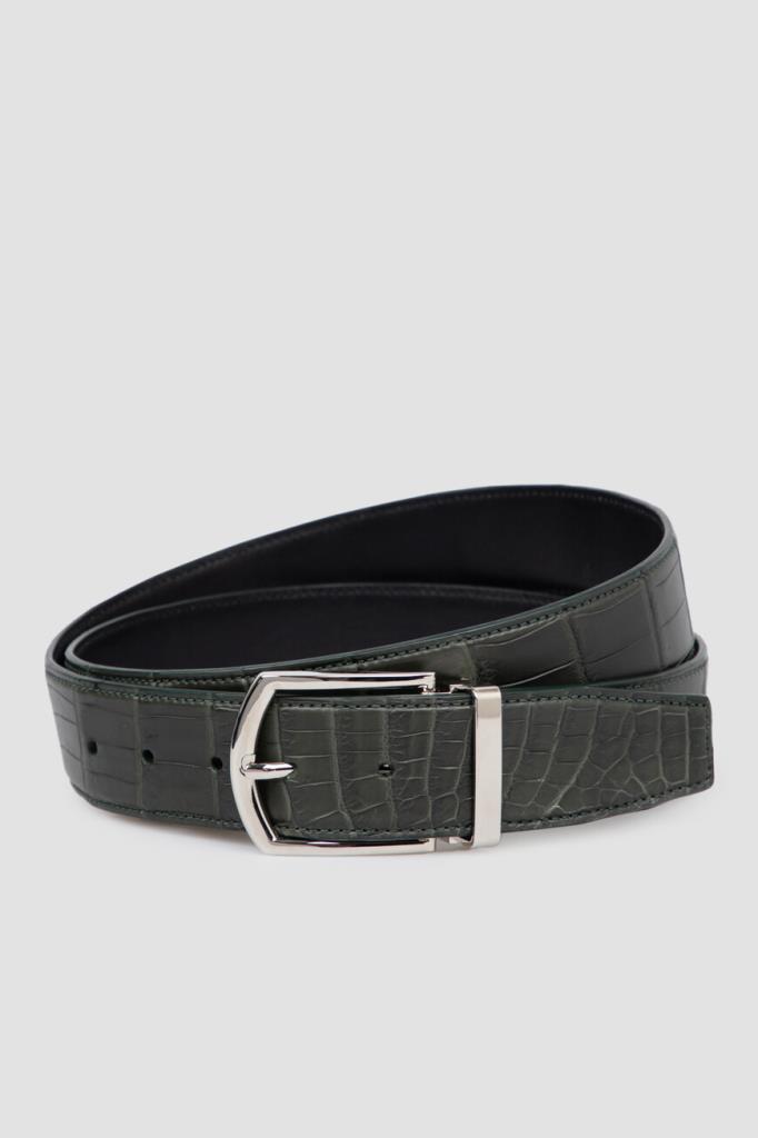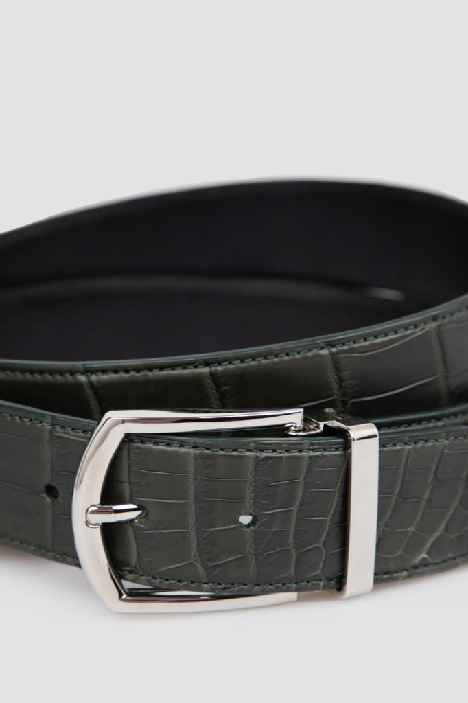 Тёмно-зелёный ремень на подкладке из гладкой телячьей кожи от Bardini. Для создания аксессуара используется мягкая фактурная кожа крокодила. Объём изделия регулируется при помощи прямоугольной металлической пряжки серебристого оттенка с язычком. Модель ручной работы усилена специальной прокладкой, которая позволяет сохранить форму в течение длительного времени.