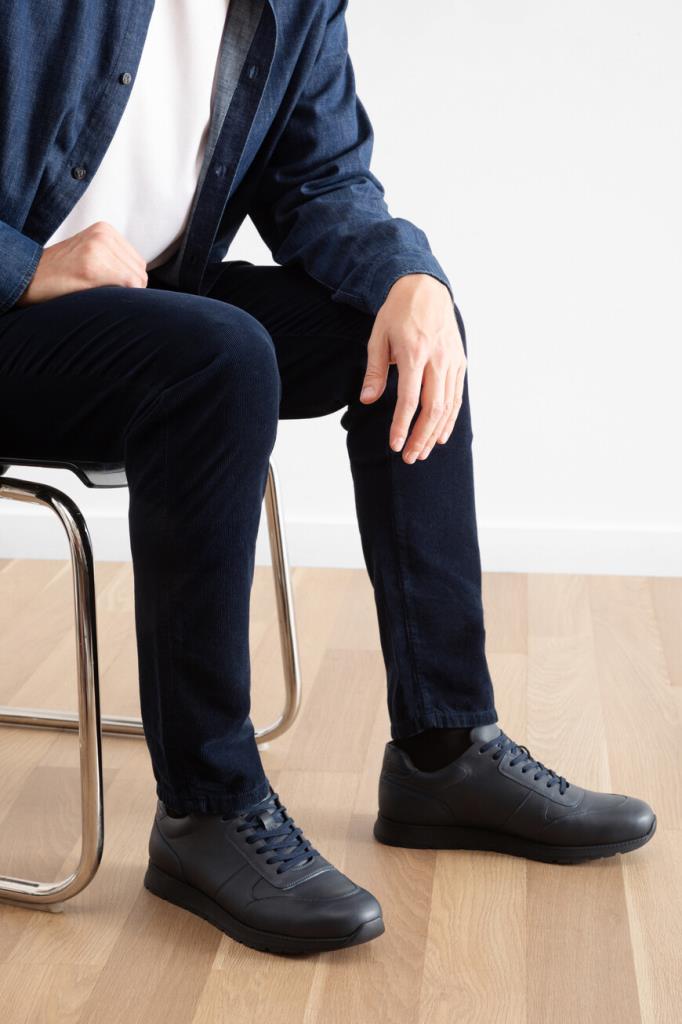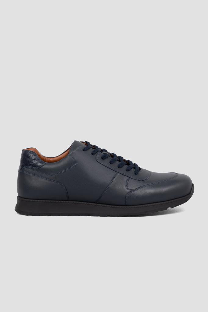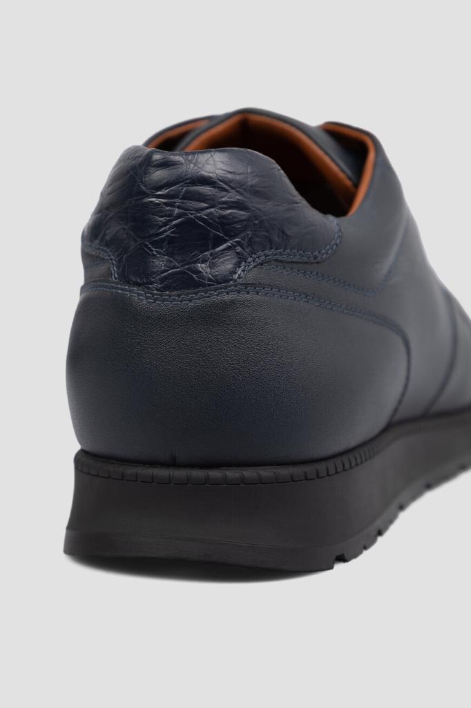 Тёмно-синие кроссовки с укреплённым округлым носком от Bardini. Модель изготовлена из мягкой телячьей кожи со вставкой из фактурной кожи крокодила на заднике в тон. Посадка обуви по ноге регулируется перекрёстной многорядной шнуровкой. Задник и язычок изделия наполнены вспененным полимерным материалом, который обеспечивает максимальный комфорт внутреннего пространства и мягкое прилегание обуви.