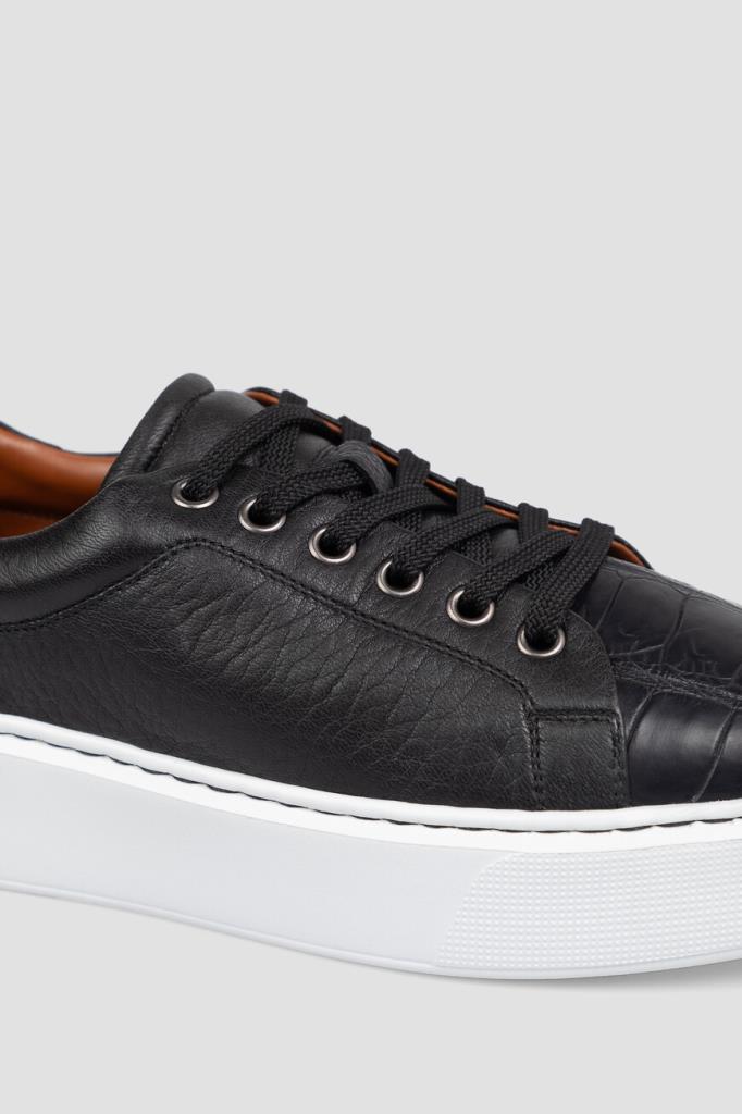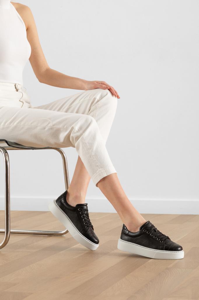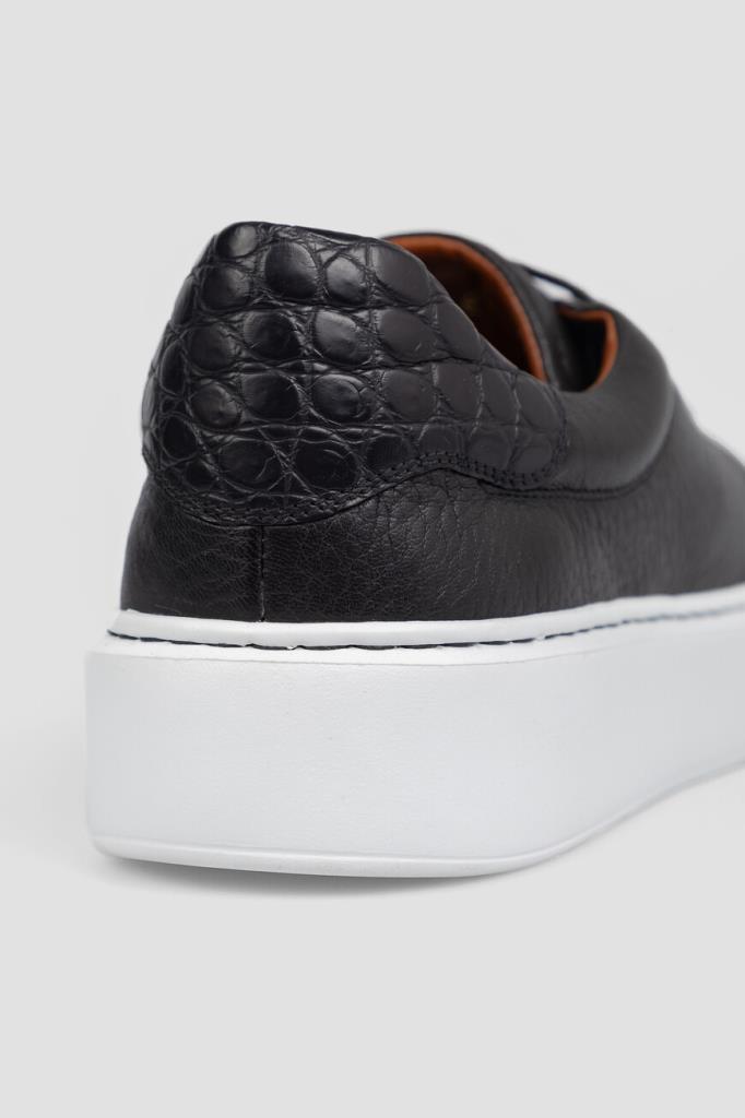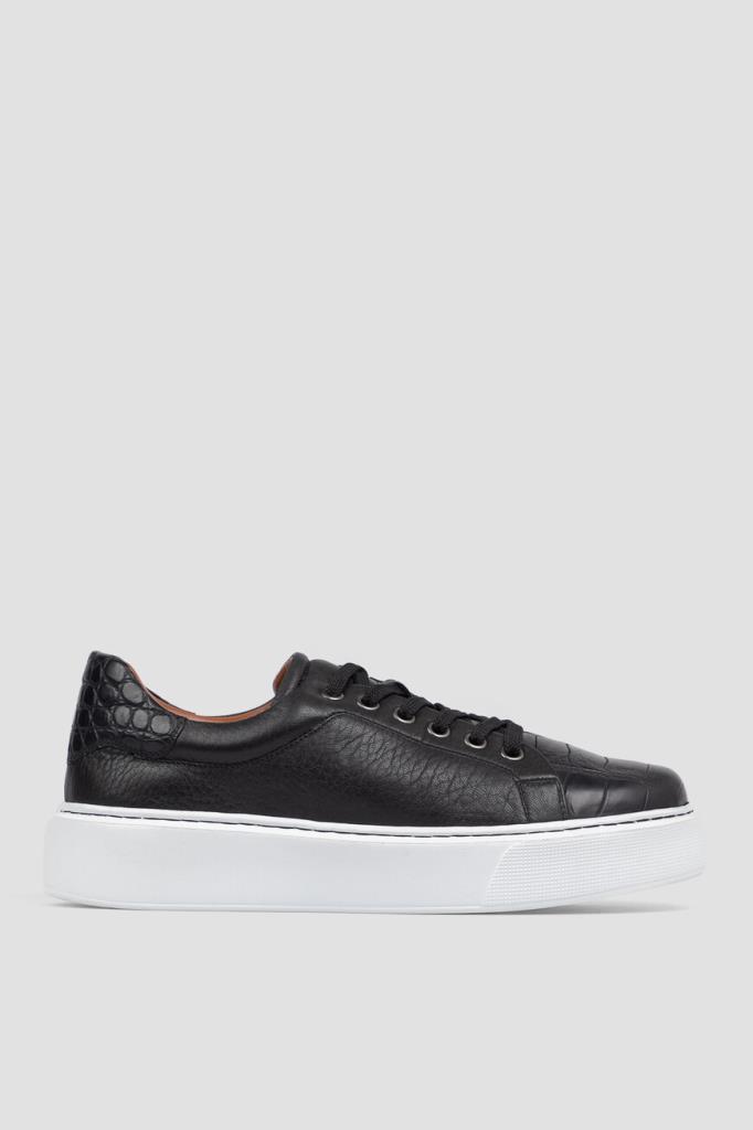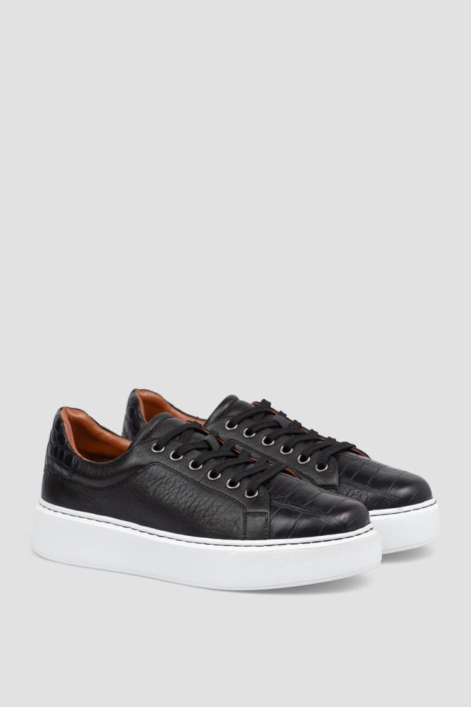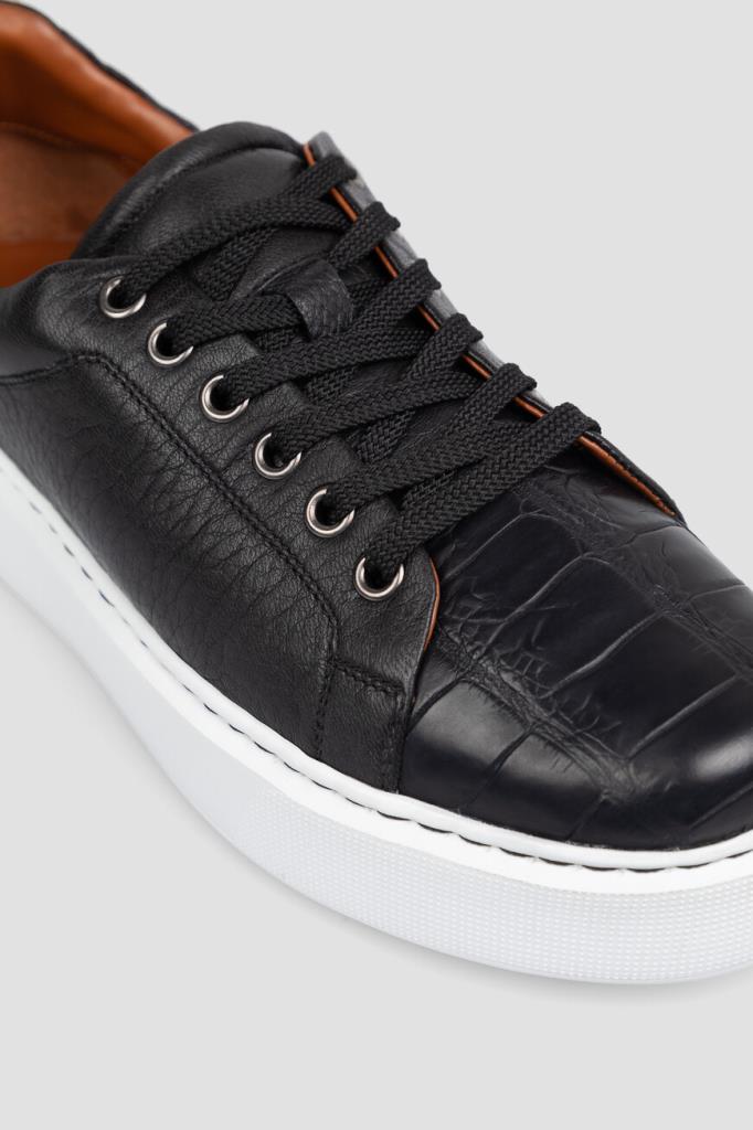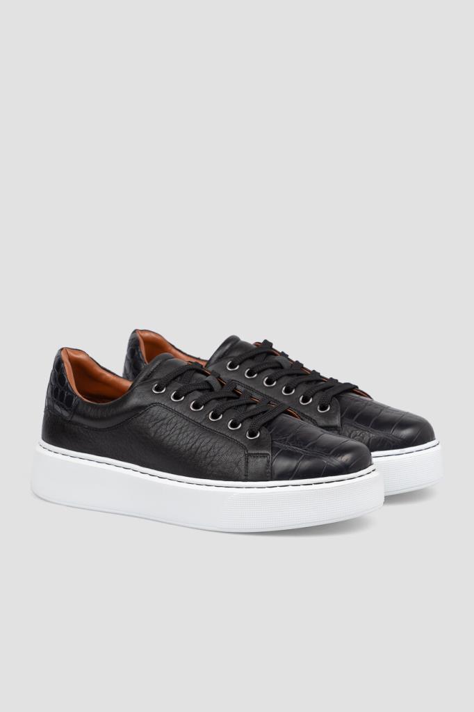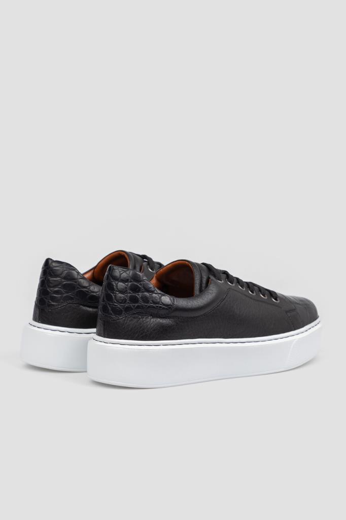Кожаные кеды Bardini - это спортивная эстетика и новый уровень комфорта. Удобная пара выполнена в чёрном цвете и дополнена плоской контрастной подошвой из ЭВА с рифлением снизу. Декором выступают вставки из фактурной кожи крокодила на носке и заднике в тон.