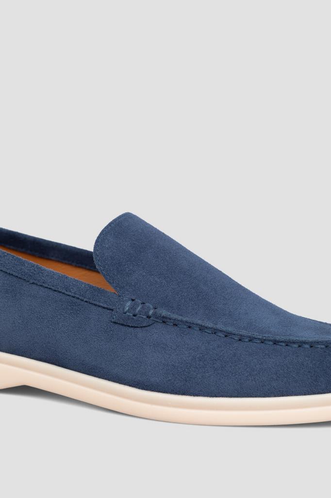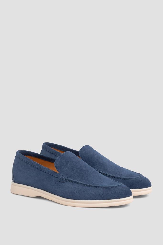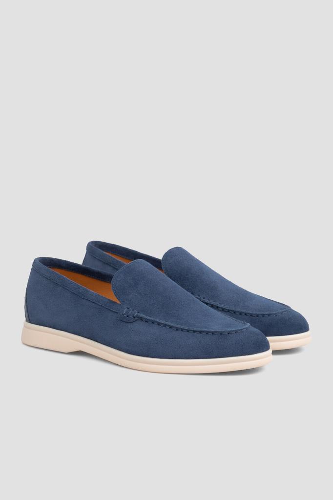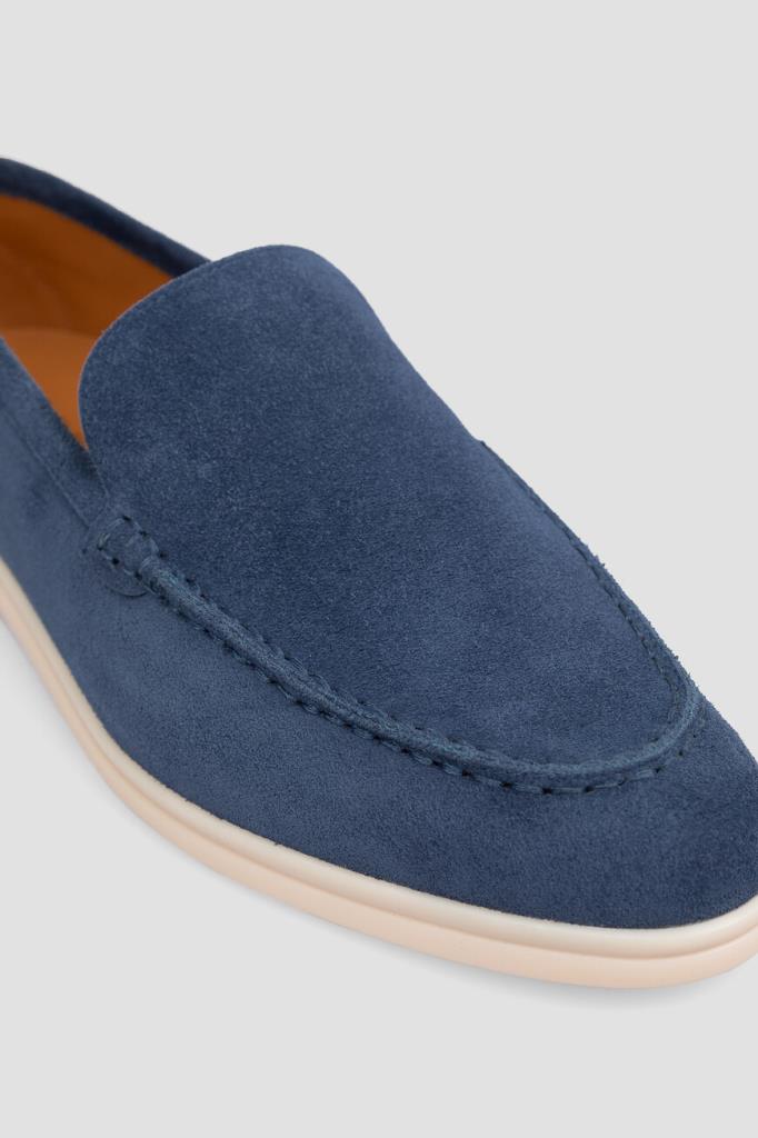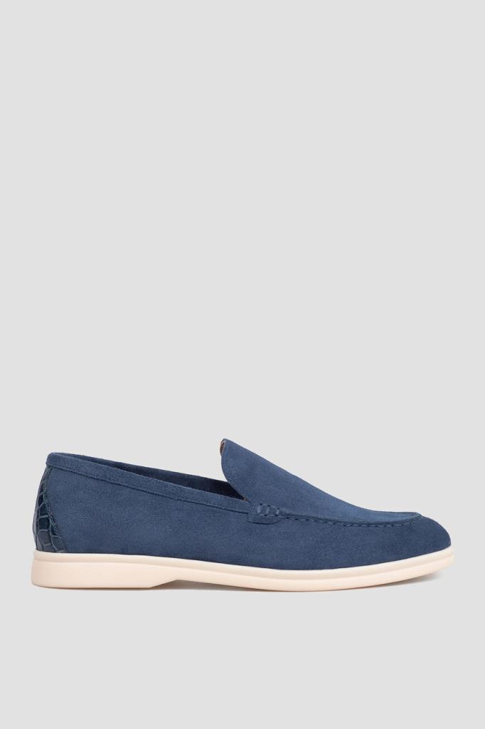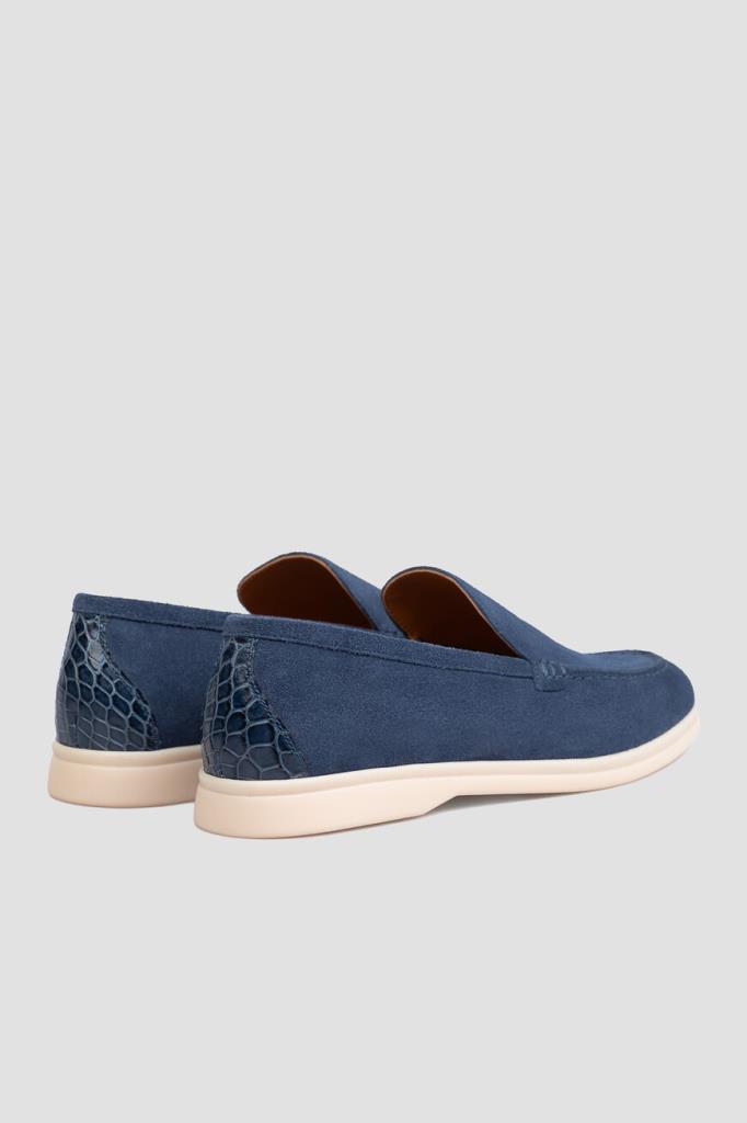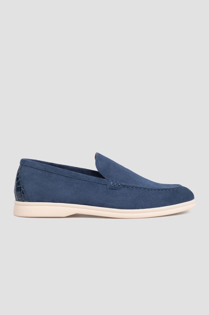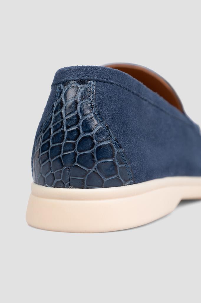 Синие лоферы ручной работы от Bardini. Для создания удобной пары выбрана мягкая бархатистая замша. Изделие оснащено вставкой из фактурной кожи нильского крокодила на заднике и внутренней отделкой из натуральной телячьей кожи цвета бисквит. Резиновая подошва пришита к верхней замшевой части модели швом Гудиер, обеспечивающим максимальную долговечность этому соединению.