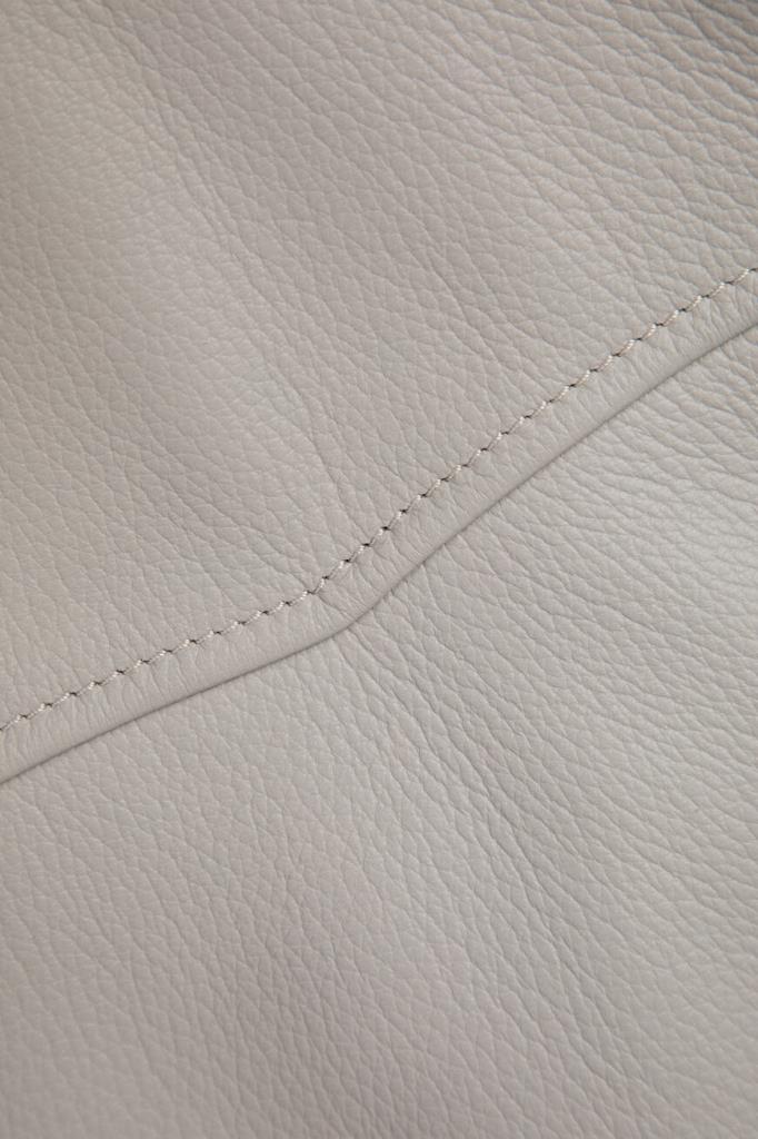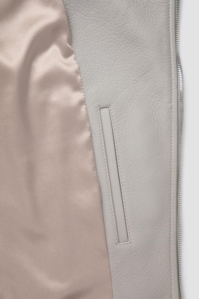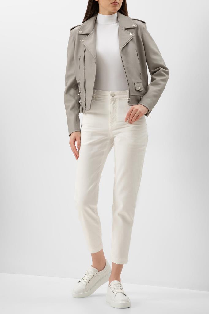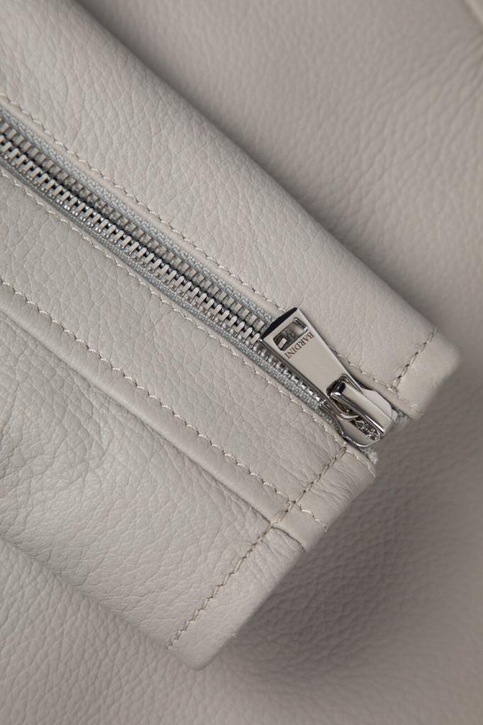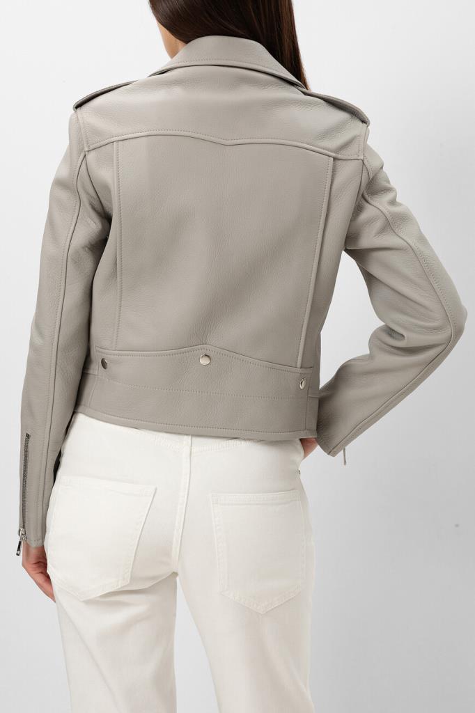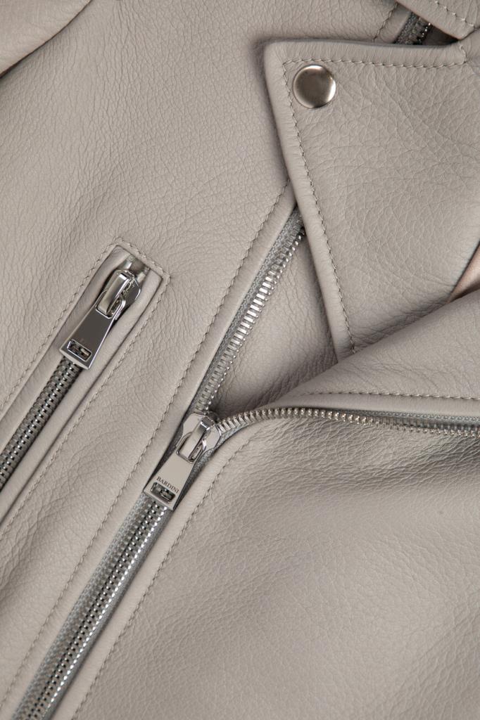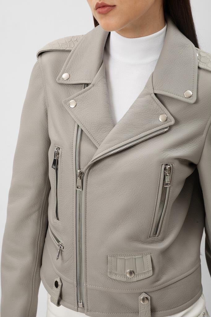 Полуприлегающая байкерская куртка от Bardini. Изделие выполнено из мягкой зернистой кожи серого цвета и декорировано вставками из фактурной матовой кожи крокодила на уровне плеч (паты), клапане прорезного кармана слева и шлевках на манжете снизу. Фасон повседневной модели предполагает изящный V-образный вырез и длинные рукава с разрезами на молнии снизу на уровне манжет.