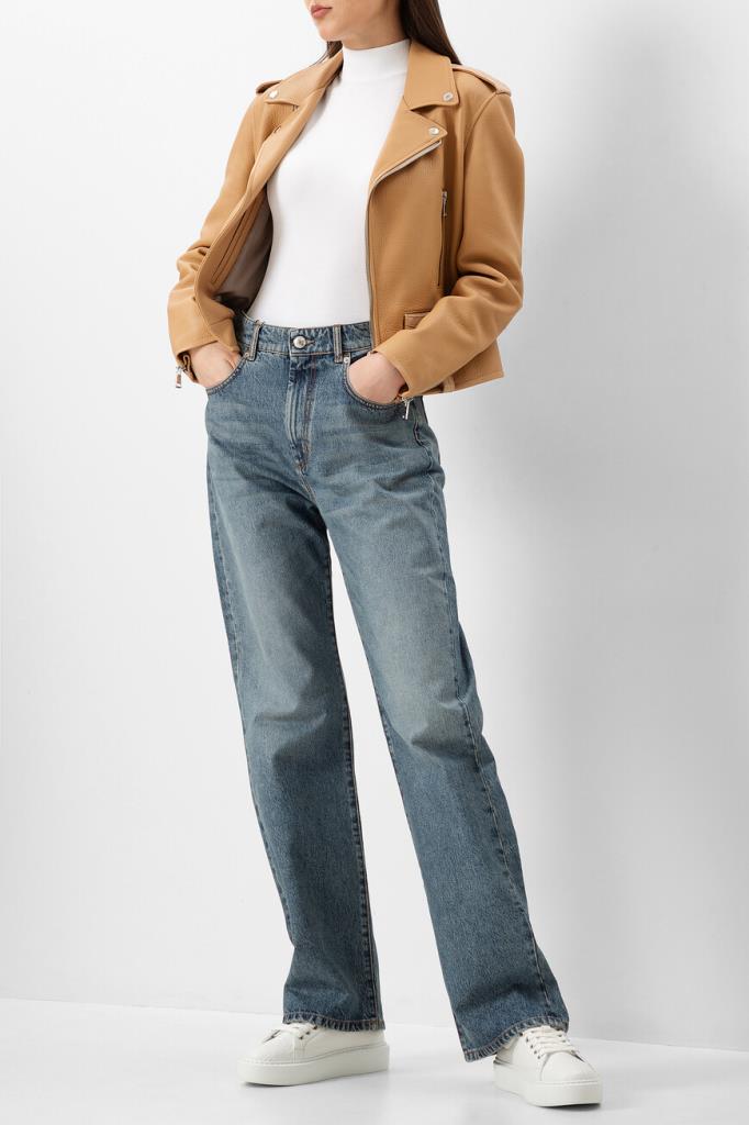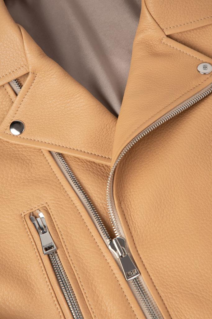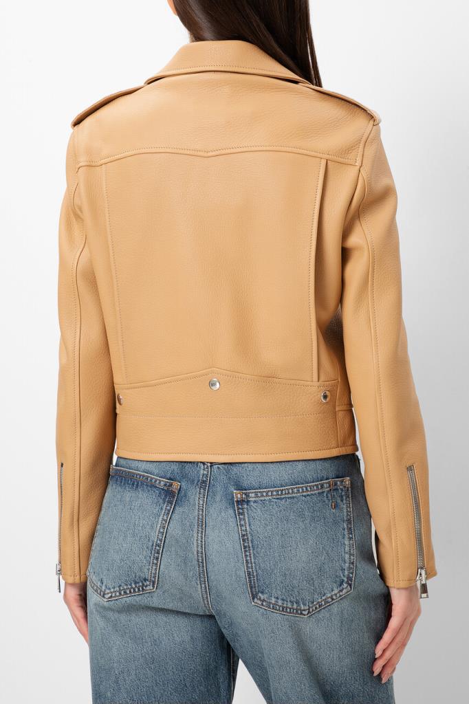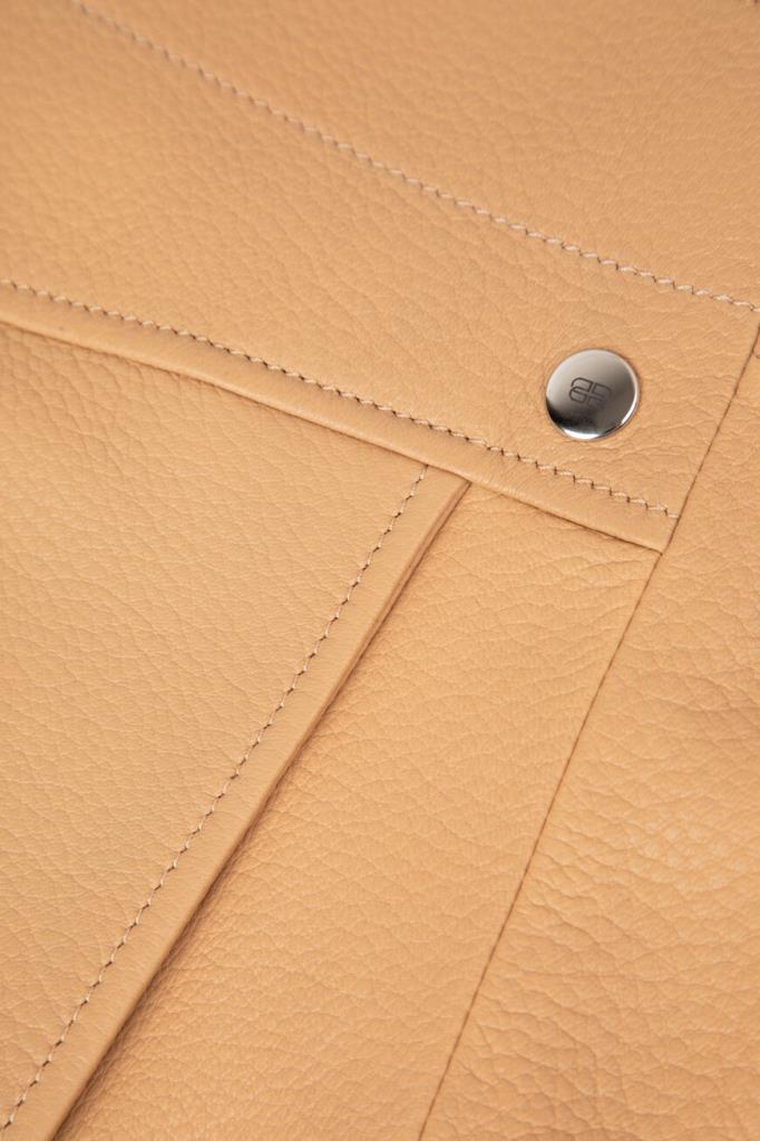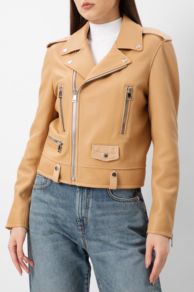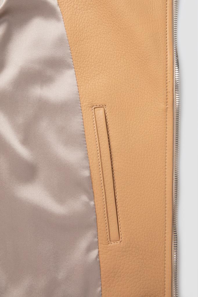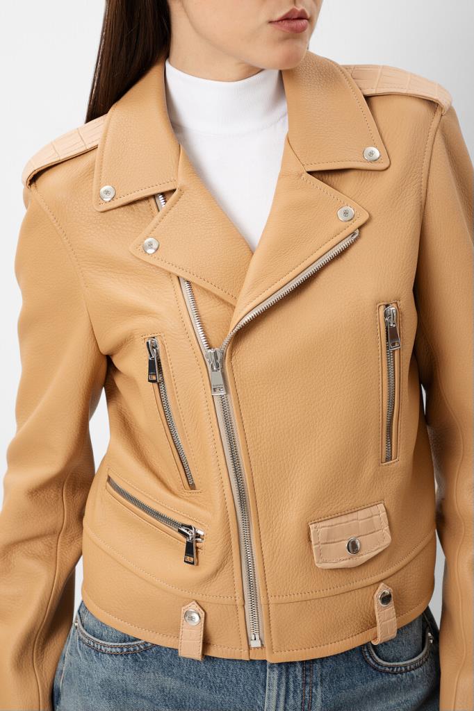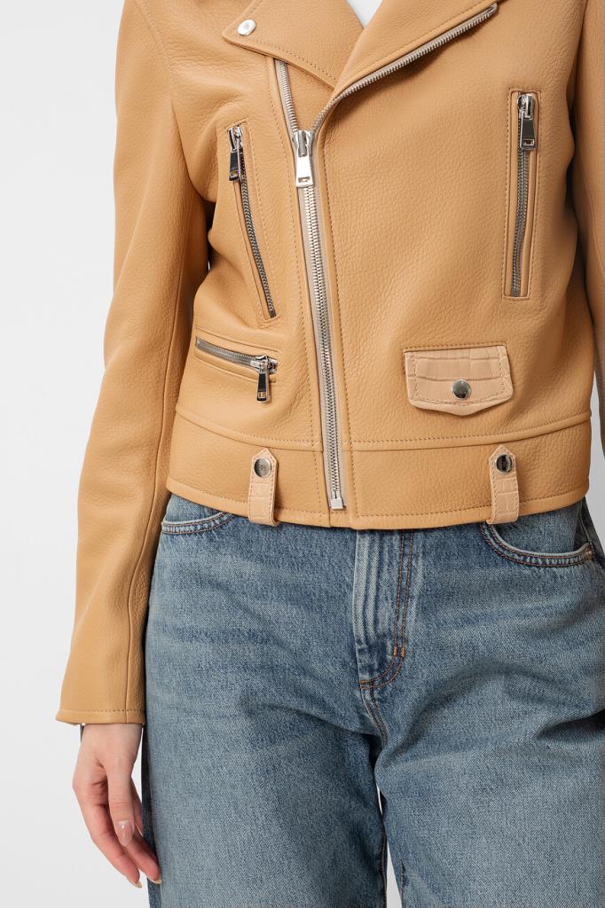 Короткая куртка бежевого оттенка от Bardini. Модель из мягкой зернистой кожи дополнена вставками из фактурной матовой кожи крокодила на уровне плеч (паты), клапане прорезного кармана слева и шлевках на манжете снизу. Особый комфорт обеспечивает блестящая шелковая подкладка.