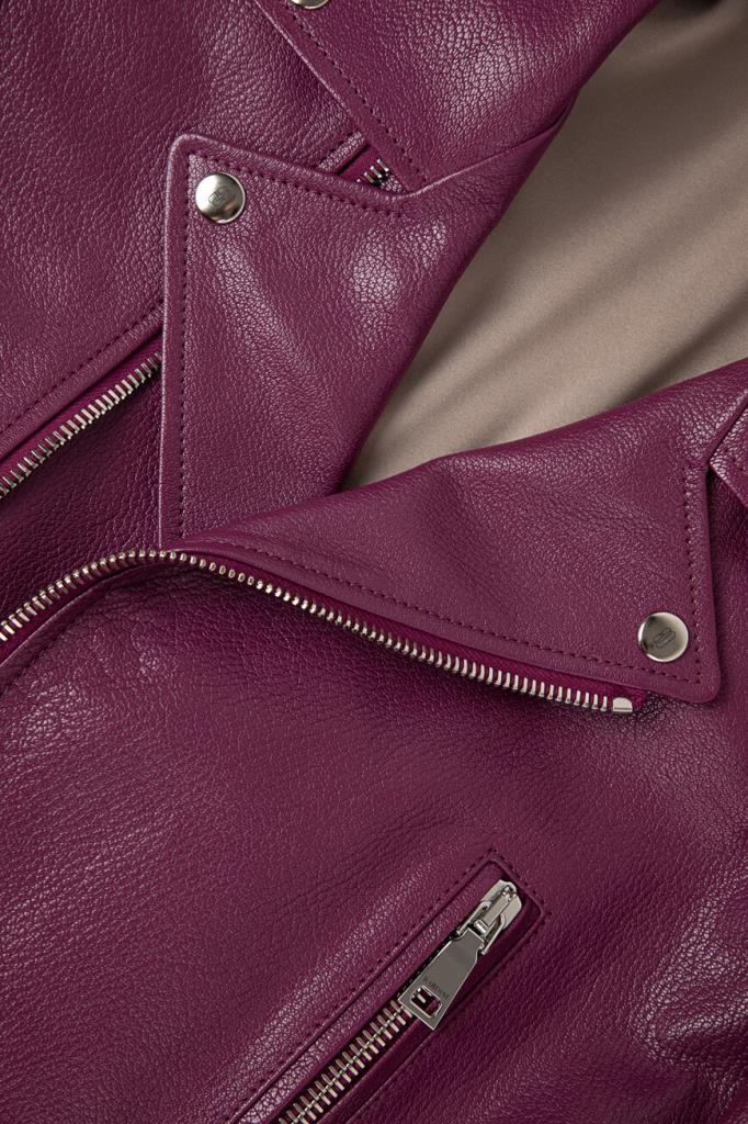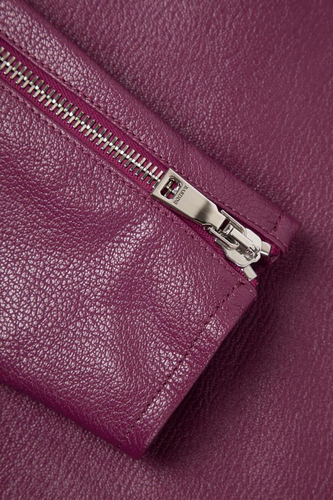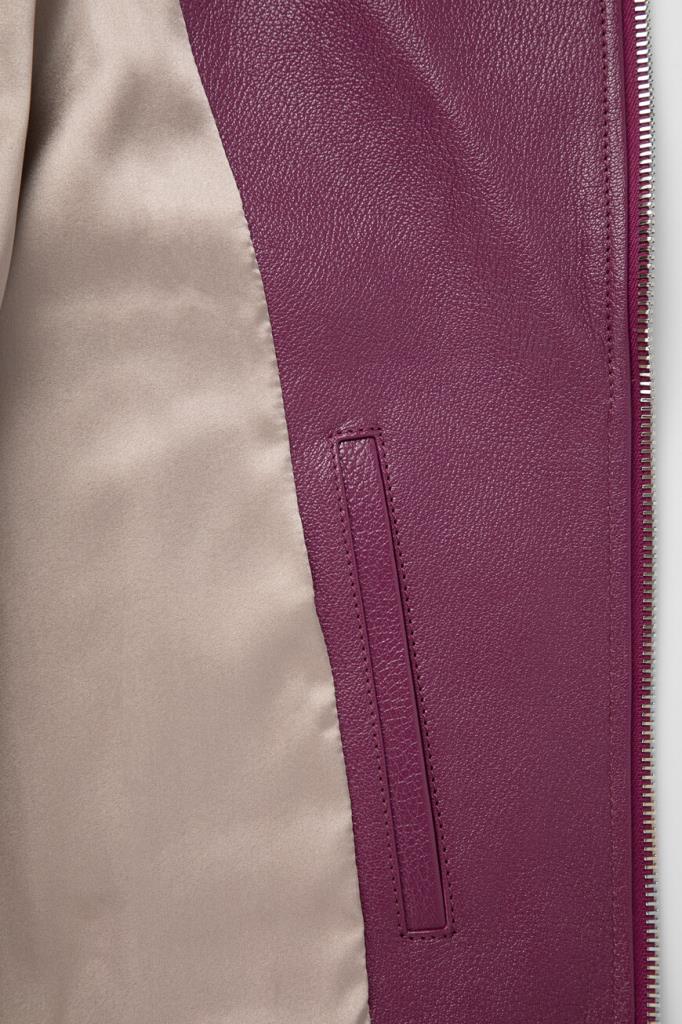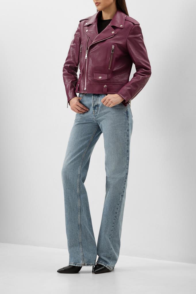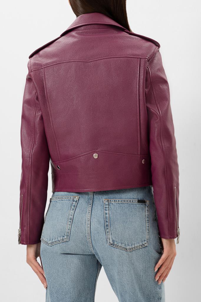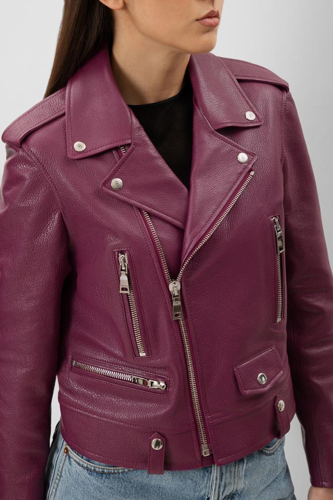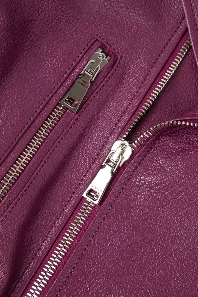 Куртка на серебристой молнии с брендированным бегунком от Bardini. Модель из мягкой зернистой кожи окрашена в насыщенный фиолетовый оттенок. Конструкция изделия предполагает изящный V-образный вырез горловины с прямоугольными лацканами и низ с двумя шлевками на металлической клёпке спереди.