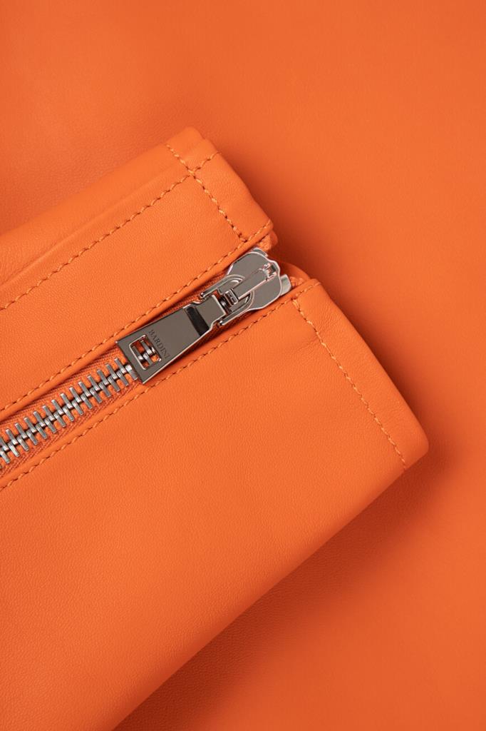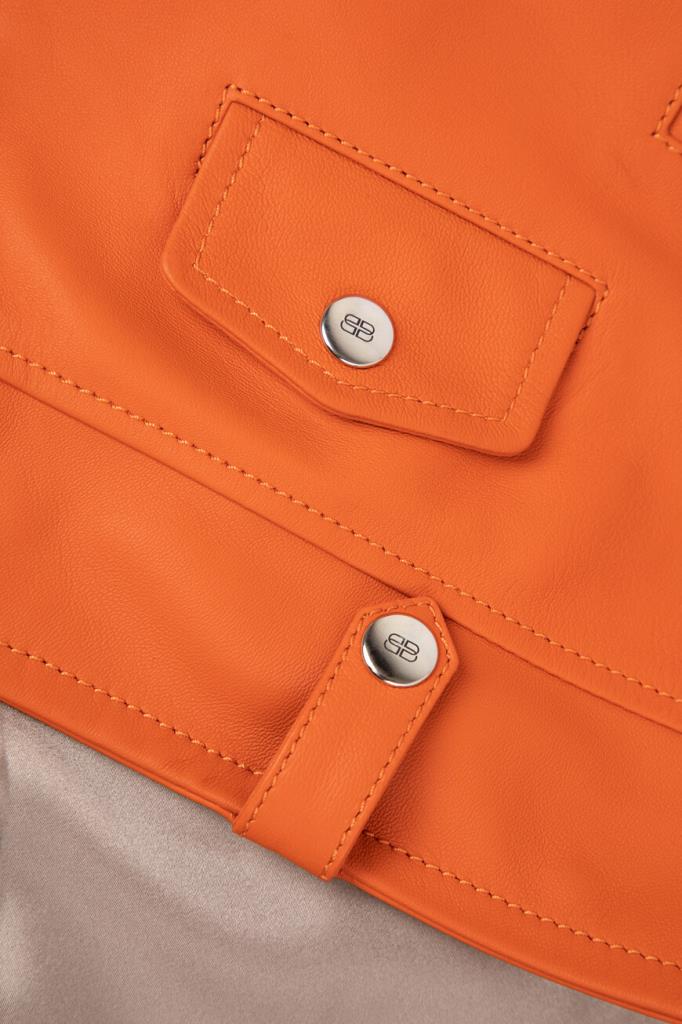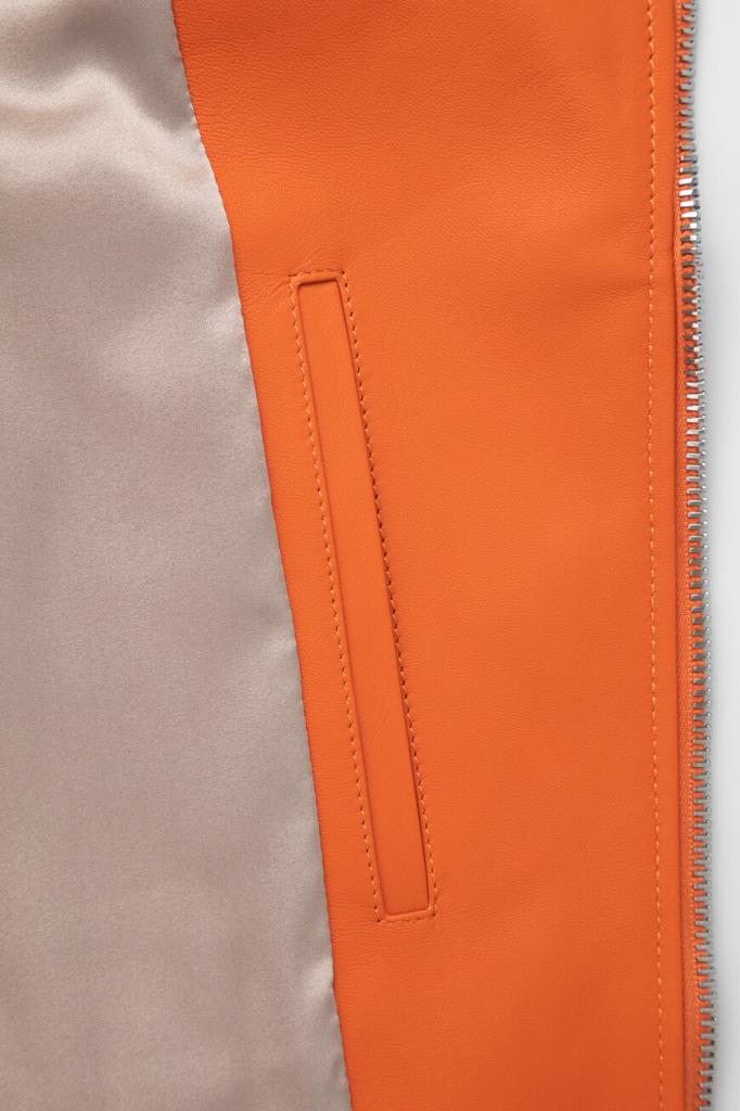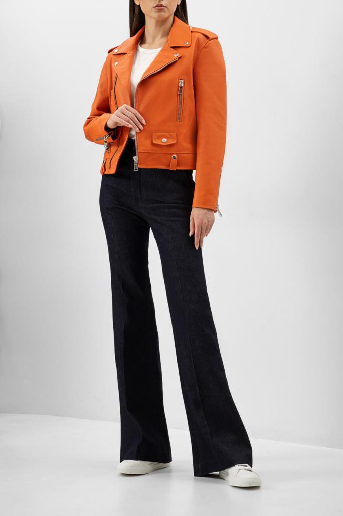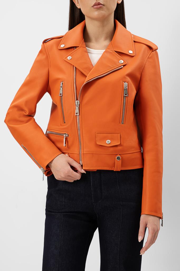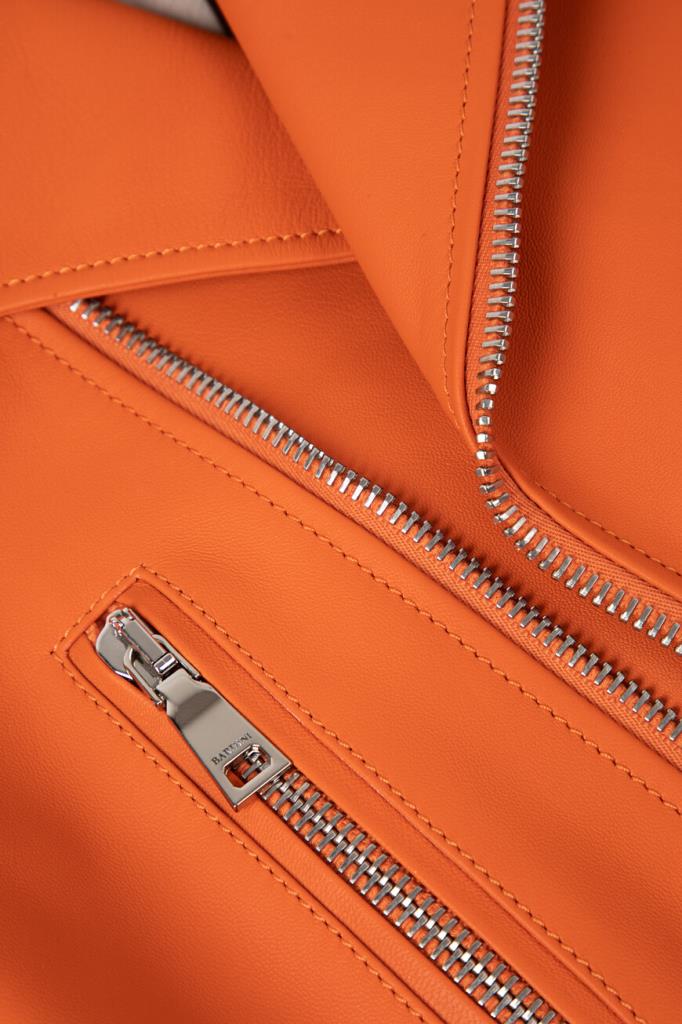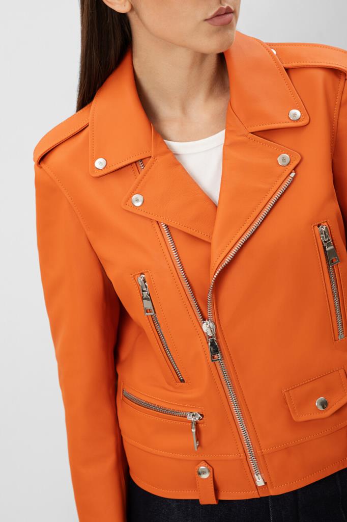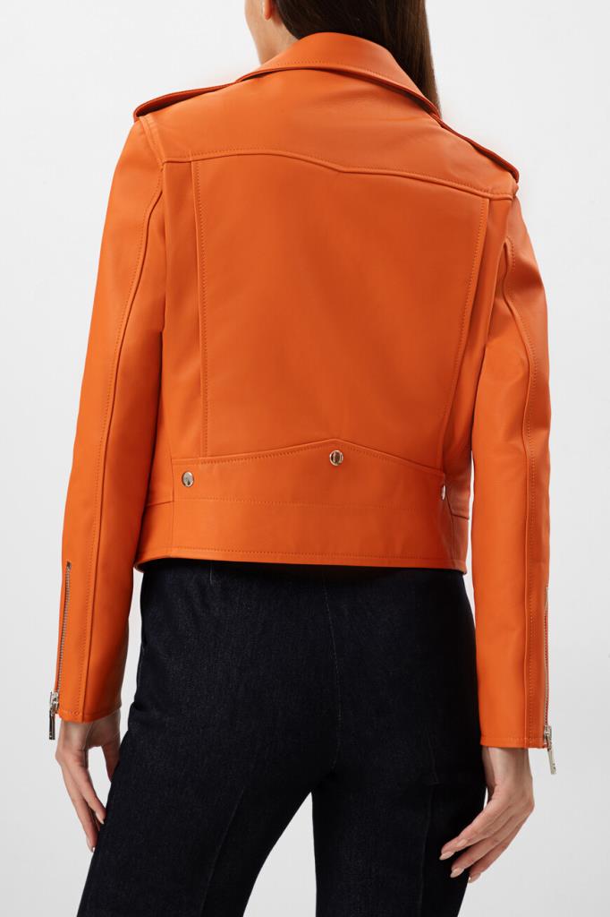 Полуприлегающая куртка оранжевого оттенка от Bardini. Для изготовления косухи выбрана мягкая натуральная кожа. Фасон изделия предполагает четыре прорезных кармана и застёжку на серебристую молнию с брендированным бегунком. Модель станет ярким акцентом Вашего повседневного образа.