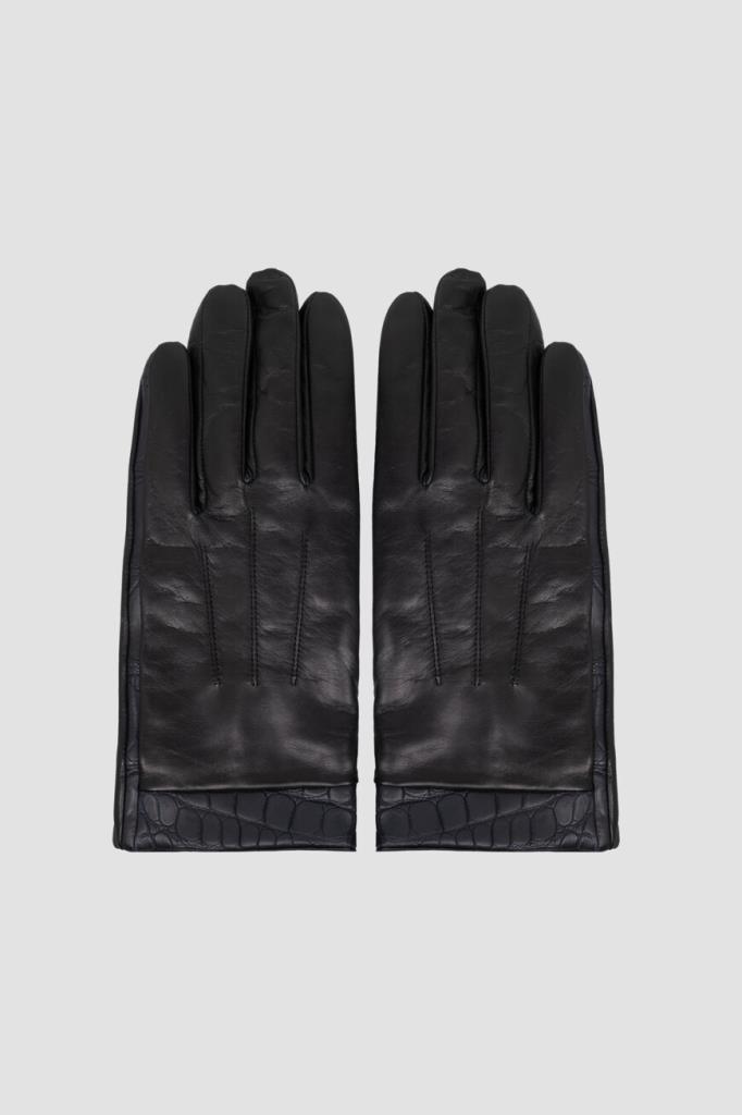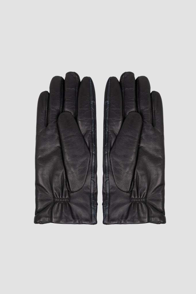 Перчатки Bardini со вставками из экзотической фактурной кожи. Для изготовления модели со сборкой на запястье используется гладкая тёмно-синяя кожа ягнёнка. Декором выступают рельефная дизайнерская строчка и детали-полосы на тыльной стороне и боковинах.