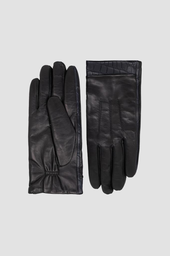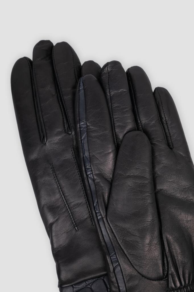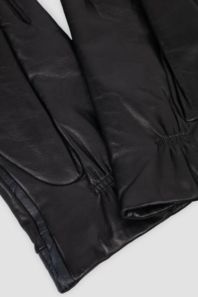Перчатки Bardini со вставками из экзотической фактурной кожи. Для изготовления модели со сборкой на запястье используется гладкая тёмно-синяя кожа ягнёнка. Декором выступают рельефная дизайнерская строчка и детали-полосы на тыльной стороне и боковинах.